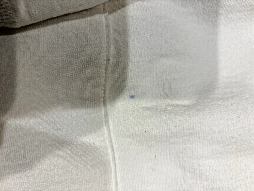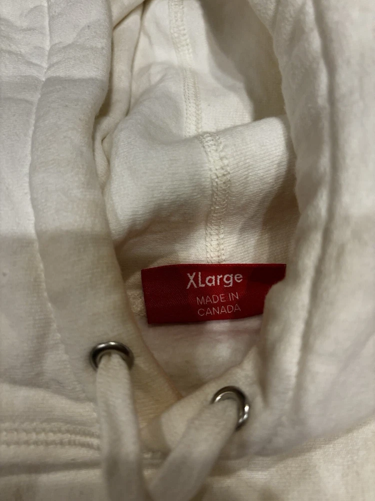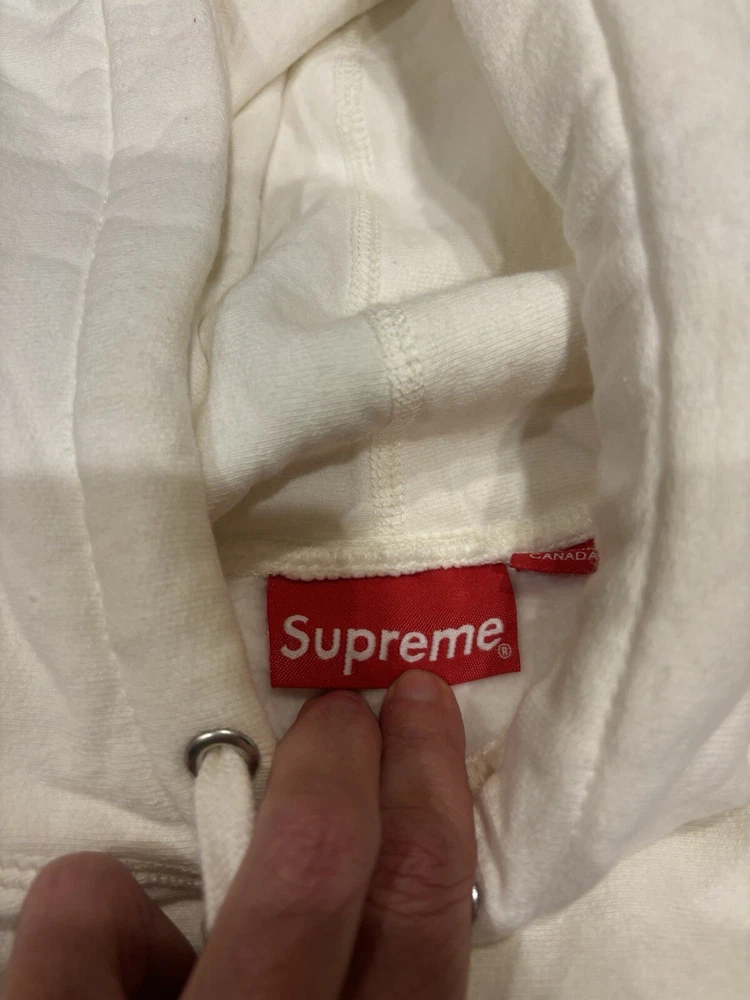 Elevate your streetwear game with this Supreme White Studded Logo Hooded Sweatshirt. Crafted from heavyweight cotton fleece, this sweatshirt features a drawstring closure and a crew neck. The long sleeve design and hood make it a perfect choice for winter, fall, and spring seasons. It comes in XL size with a regular fit, and is adorned with studded accents and the Supreme logo. This designer sweatshirt is ideal for gym and training, walking, and skateboarding. Get your hands on this solid patterned sweatshirt and add a touch of style to your wardrobe. Supreme is written across the back in gold studs, all of which are intact.