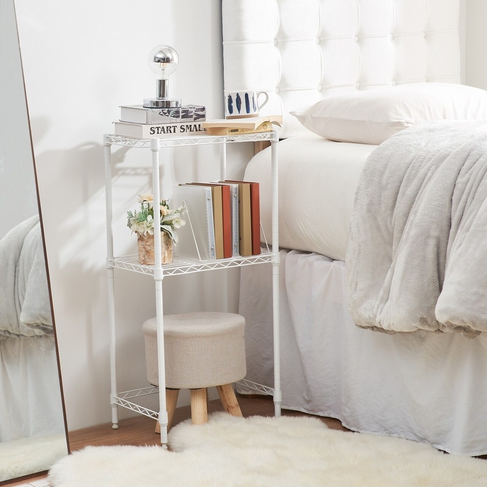 This durable nightstand is constructed from stainless steel with a modern black finish. The two shelves give you plenty of space for bedside storage. Features:NightstandStainless steelBlack finishAssembly requiredWire shelves measures 18 inches x 12 inches4 Posts measure 36 inches high Free Shipping Over $49.99* Details Suprima® Adjustable Shelving - Stainless Steel Nightstand by DormCo Product Description: This durable nightstand is constructed from stainless steel with a modern black finish. The two shelves give you plenty of space for bedside storage. Features: Nightstand Stainless steel Black finish Assembly required Wire shelves measures 18 inches x 12 inches 4 Posts measure 36 inches high