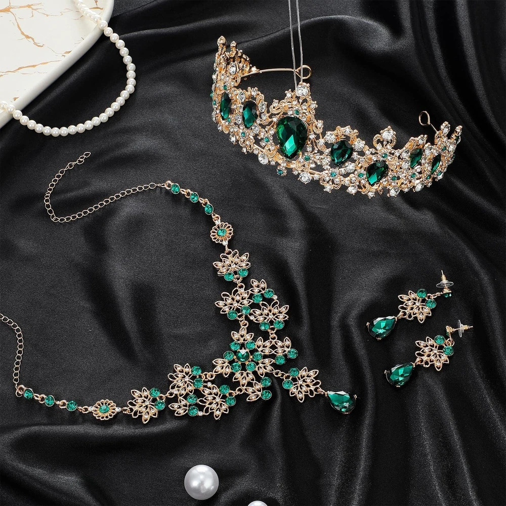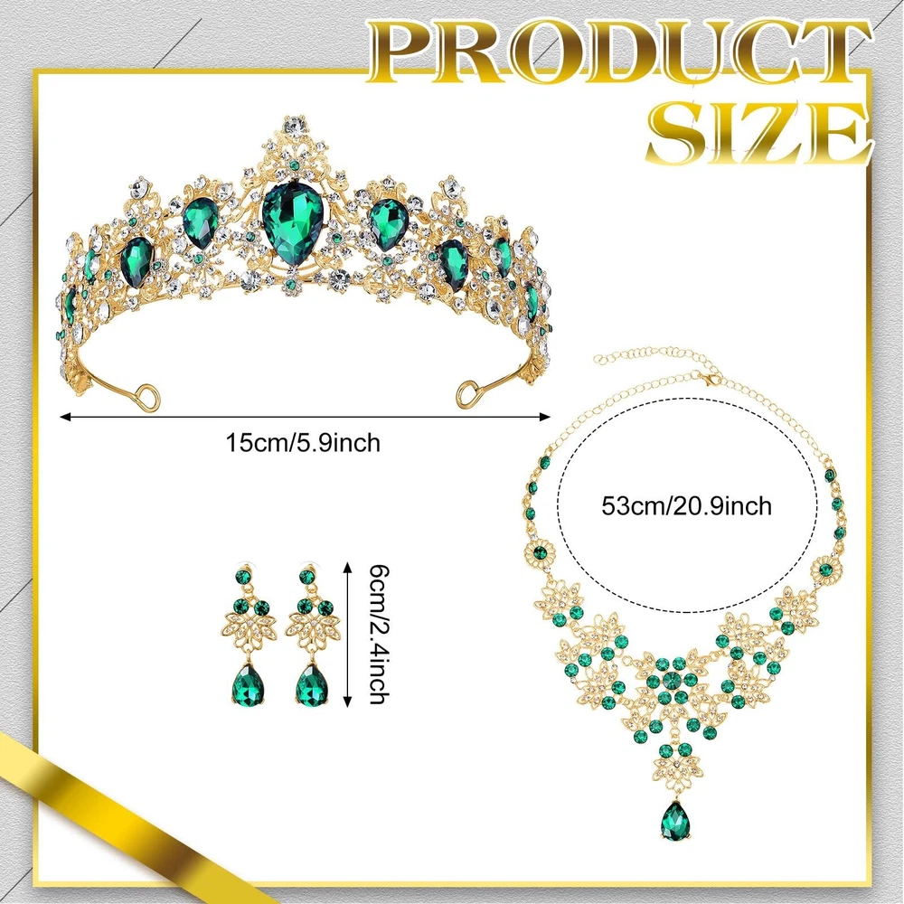 Sureio Baroque Bridal Jewelry Set 3 Pieces Tiara Earrings Necklace Bridal Jewelry Set Wedding Rhinestone Crystal Tiara Crown Headband Princess Baroque Crown for Bride Women Product Details Color: Green Brand: Sureio MPN: Does not apply UPC: Does not apply EAN: Does not apply Package Dimensions : 7.09 x 6.3 x 2.56 inches; 8.82 ounces Date First Available : November 16, 2021 Manufacturer : Sureio Brand, Seller, or Collection Name: Sureio Metal: Alloy Material: Rhinestone Clasp: Lobster Clasp Number of stones: 3 Features: Sweet gifts: The prom crown and tiara set is ideal gift choice for your lover, friends, family, colleagues or close neighbors, the exquisite princess tiara for women is sure to win their preference, showing your love and support for them. Vintage Style: The tiaras for women are designed with nice workmanship, and designed with vintage style, classic and beautiful, you can use them in different occasions, the medieval crown is suitable for vintage themed parties. Specifications: Material: alloy and crystal Color: as pictures shown Height of the princess crown: 6 cm/ 2.36 inch Diameter of the princess crown: 17 cm/ 6.7 inch Length of the earring: 4.5 cm/ 1.77 inch Length of the necklace is 39 cm/ 15.35 inch Package includes: 1 Piece of princess crown 2 Pieces of earrings 1 Piece of necklace Notes: Manual measurement, please allow slight errors on size. The color may exist slight difference due to different screen displays. Small items, please keep away from little kids to avoid swallowing. Winding risk may exist, please keep away from little kids. Pointed parts included, please keep away from kids, if needed, under adult's care.