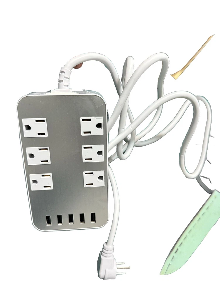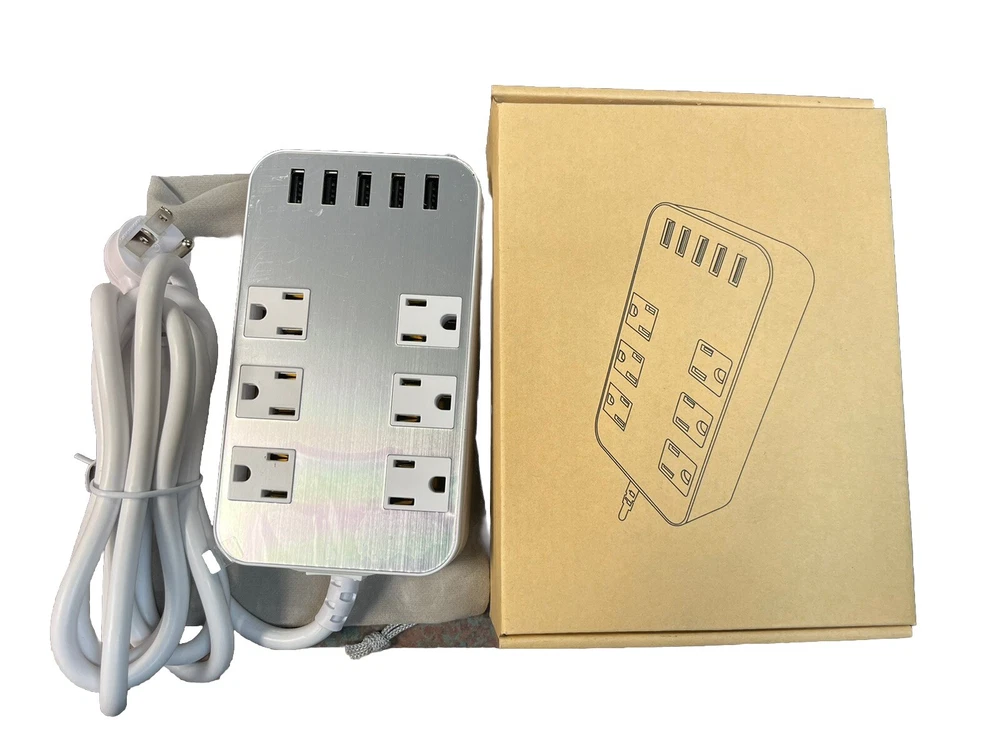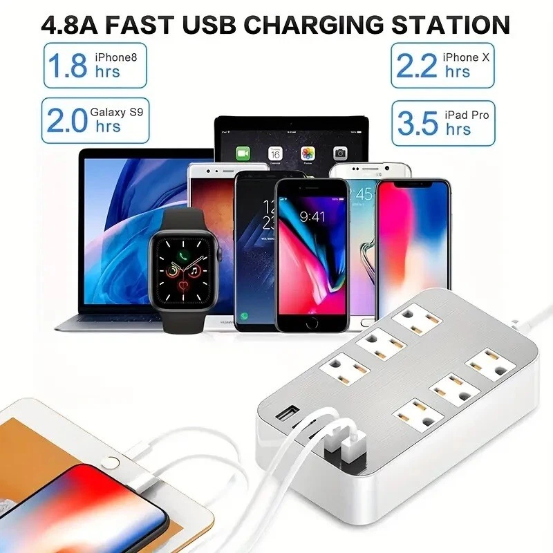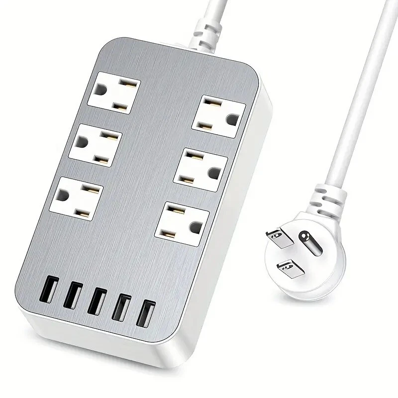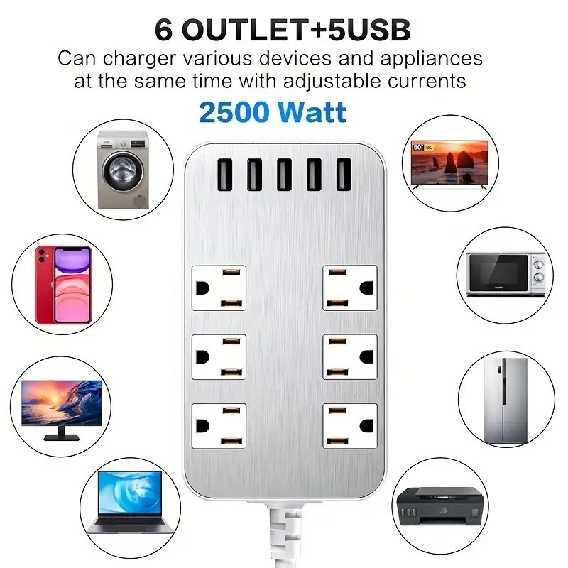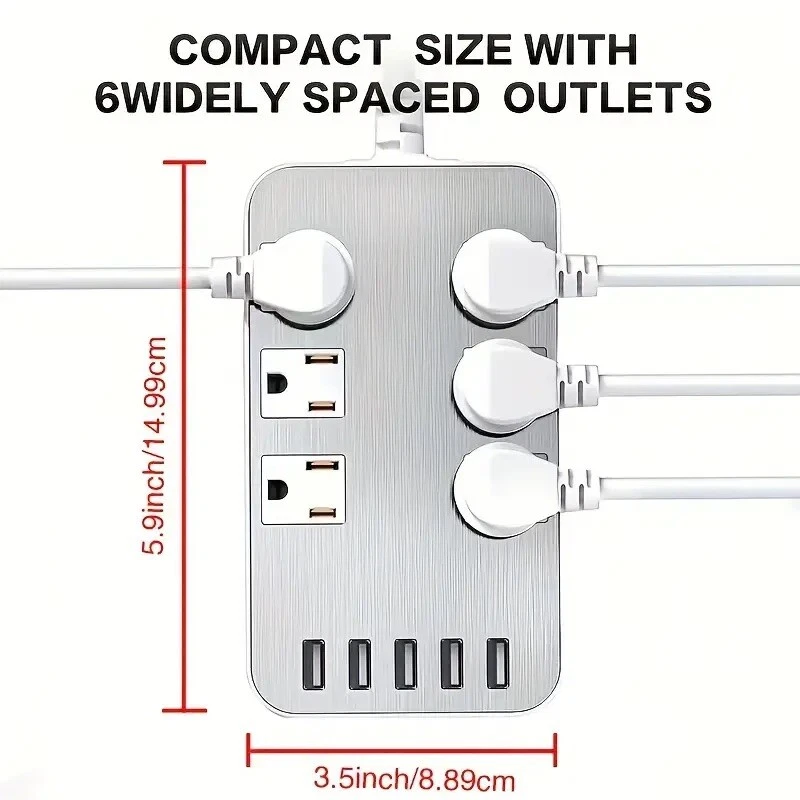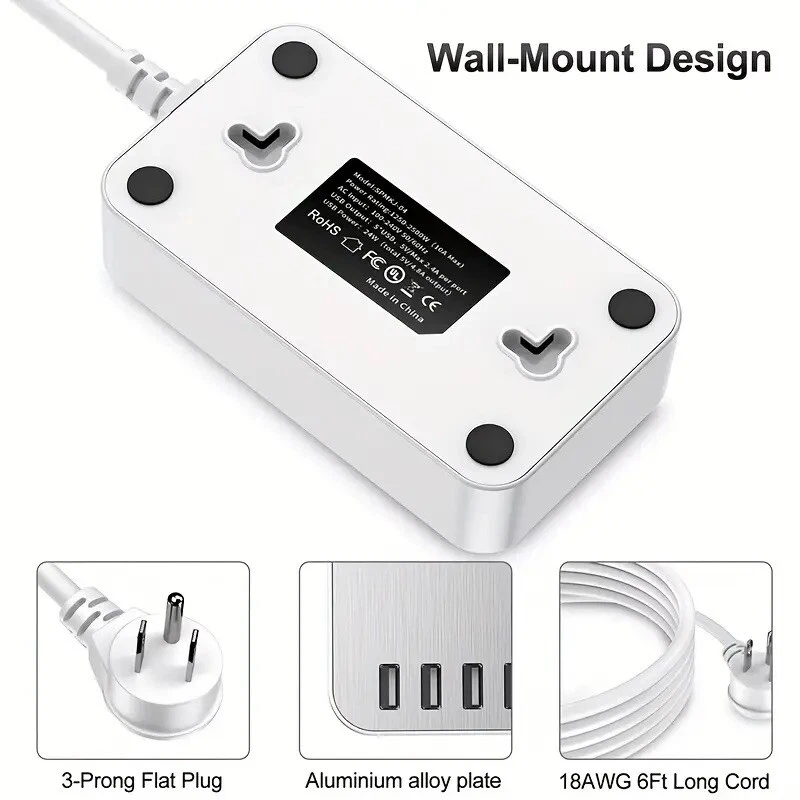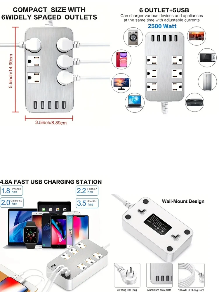 Widely Spaced Power Outlets for Large Plugs:Compact & portable size power strip comes with 6 widely spaced AC outlets and 5 USB charger ports can charge up to 11 devices for unexpected needs. The compact design for a desktop surge protector power strip saves more space, suitable for the home, office, and college dorm room. Power strip with usb ports fast:This 6 outlet power strip with long cord has 5 smart USB ports, 2.4A/port (max), 4.8A(total). The quick USB charging station with smart IC automatically adjusts the current for devices like iPhone, iPad, Samsung, laptop, computer, digital cameras and hair dryer for optimizing charging speed. Super Safe and reliable:The surge protector with overload protection protects your electrical appliances from lighting, surges or spikes.Adjustable voltage of 110-240V, 2500W 1700Joules surge protector.This power strip with surge protection can safeguard your expensive computers, TV, Refrigerators and all other electronics and appliances from overload, short circuit, voltage fluctuations. Fireproof heavy duty material & 6 FT extension cord:PC & ABS performs good in flame retardant, built-in Phosphor copper wire. The nearly 7 ft. heavy duty fire-resistant office 3 prong extension cord with usb ports means your devices will always be within reach. Flat Plug & Wall Mountable:This wall mount power strip can be mounted on the wall by 2 slots on the back, it provide a rated power of 2500W (125V~ 15A) and a wide range of power distribution 100~240V, 15A 18AWG 6 feet heavy duty extension cord can meet most applications.