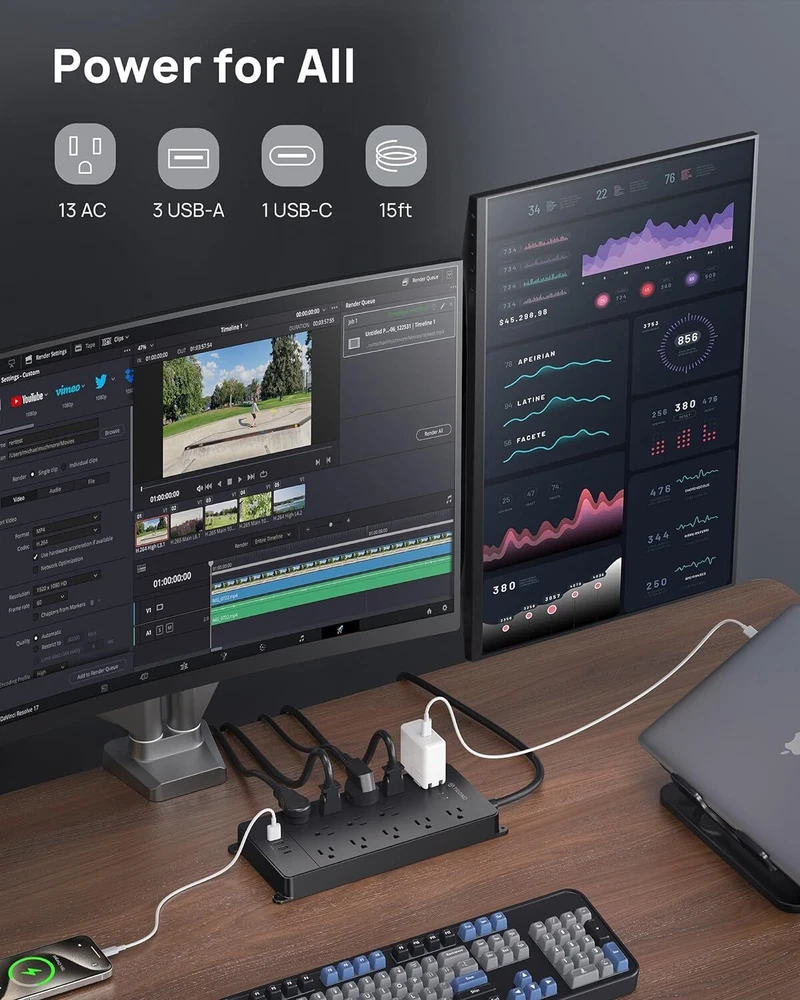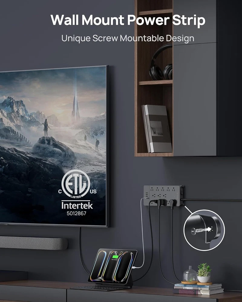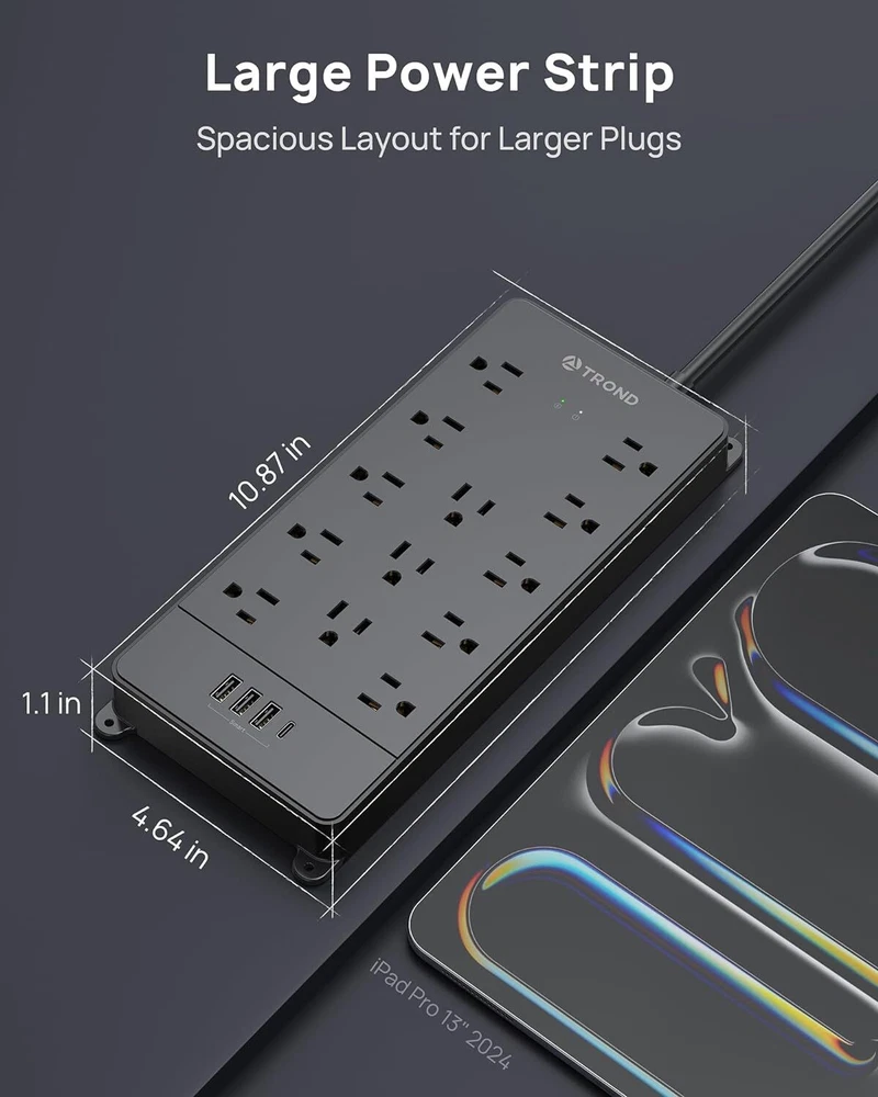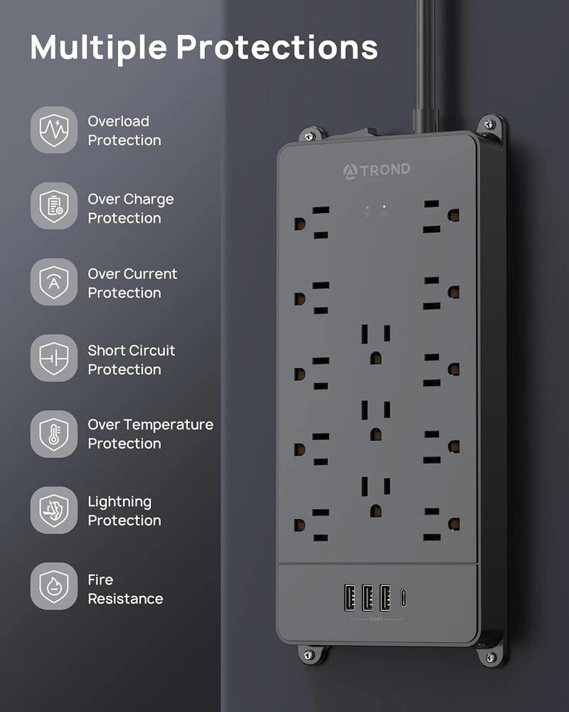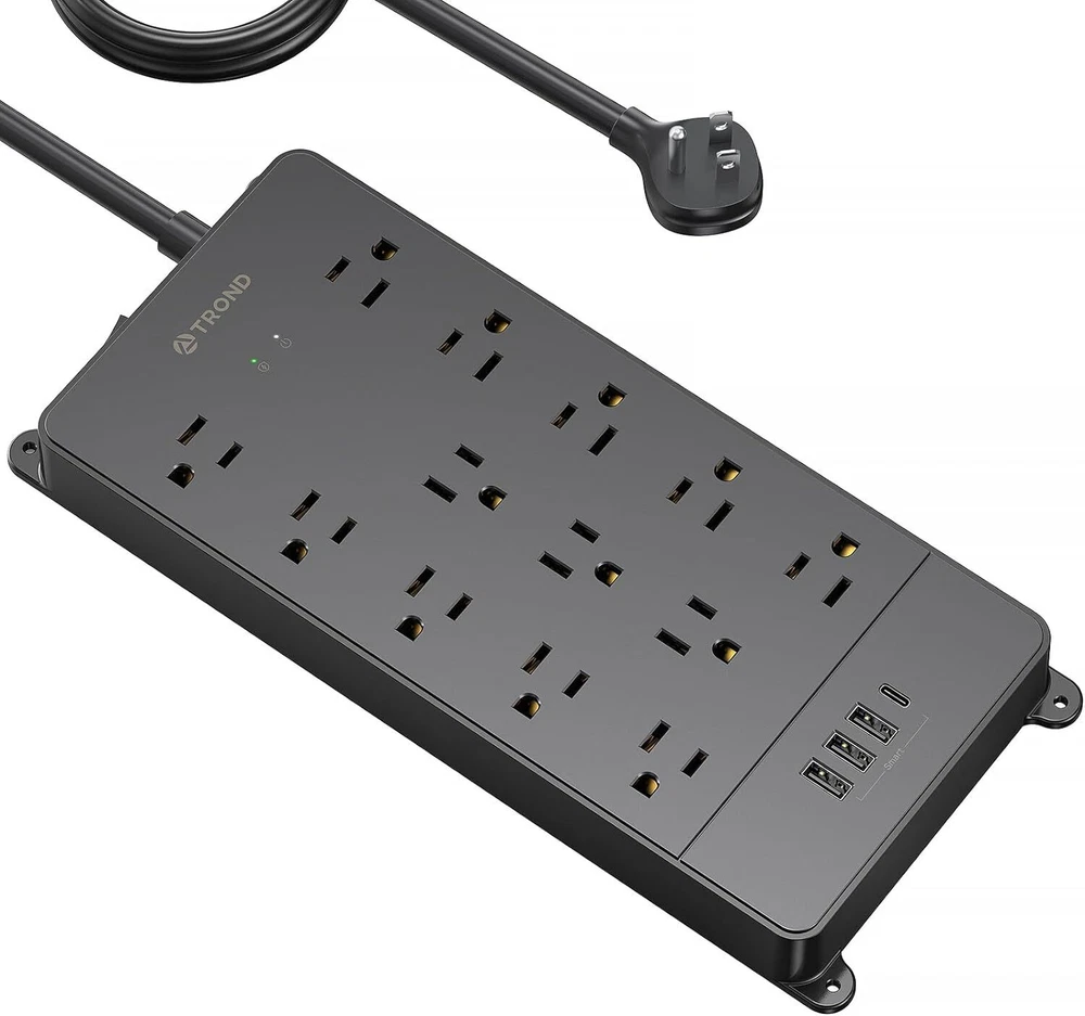 Product Description Surge Protector Power Strip 15 ft Cord - Long Extension Cord, 13 Widely-Spaced Outlets Expansion with 4 USB Ports(1 USB C), 4000J, Flat Plug, Wall Mount, ETL Listed, Office Desk Accessory, Black Power strip surge protector - ETL listed, this massive outlet expansion features 13 AC outlets and 4 usb charging ports(17w total usb output), which provide power and charging for up to 17 devices from a single wall outlet. Max. power: 1875w (125v~15a) 13 widely spaced AC outlets - Extra space in-between(38mm vs. 30mm on other power strips) can provide room for large plug adapters without blocking adjacent outlets. Easily plug in your PC, monitor, printer, TV, android box, echo & more 15ft extension cord flat plug - Made of 14awg pure copper, the 15-foot long power cord is heavy-duty and has better current carrying capacity (15A). The low-profile space-saving 45° angled flat plug doesn’t block the bottom receptacle Wall mountable design - 4 screw-mounting tabs allow you to securely install this surge protector power strip in various applications, including the entertainment center, behind the TV, dorm room, guest room, garage, desktop, under desk/counters, workbenches, etc. Safety assurance - It’s ETL listed, and made of the top-grade ul94 v-0 flame-retardant material. With 4000j surge protection, it safeguards your TV, computers, phones & office equipment from potentially damaging power disturbances, creating peace of mind About Us We are a reputable seller with many years of experience selling on eBay. Our goal is to provide high-quality products and excellent customer service. Shipping Items will be shipped within 1-3 business days when we received payment. (Orders are not processed on weekends & holidays) Tracking information will be sent once item is shipped. Delivery time depends on destination and other factors Item is shipped to ebay address. Leaving correct address can minimize delay. For international shipping and shipping to Guam, Hawaii and Alaska, Please contact us before placing the order. International buyers please note: Import duties, taxes and charges are not included in the item price or shipping charges. These charges are buyer’s responsibility. We will try our best to reduce the risk of the custom duties. Local pick-up is unavailable at the moment. Contact Us We reply any email messages within 1 business / working days(off-duty at weekend). If you do not get a response from us, then please check your junk or spam mailbox. Our Business hours: Mon-Fri 9:00-18:00, UTC/GMT +8 hours. Please contact us either by clicking "contact seller" in the "purchase history" section or simply click "ask a question" at the bottom of this page. If you are unsatisfied with our item or service, please contact us before leaving any feedback. We are committed to resolve all issues in a friendly and satisfactory manner.