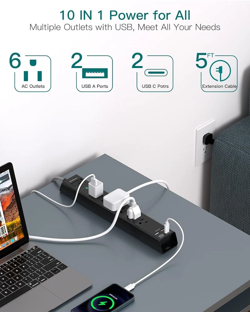 【10-IN-1 Extension Cord with Multiple Outlets】- The slim power strip with 6 AC surge protector outlets (15A/1875W) and 4 usb ports (3.1A/15V), provide ample space for multiple devices and adapters to be plugged in simultaneously. It can charge your cellphone, laptop, tablet, cameras without a variety of converters, save your space and make your desktop organized. Suitable for the home, office, and college dorm room essentials. 【2 USB- C Fast & Smart Charge】- Added extra 2 USB C ports for your devices, the power strip with USB C ports can charge up to 5V/3A. USB-A ports can charge up to 5V/2.4A Max. With smart charging technology, the outlet extender can auto-detects your devices and reach faster charging efficiency, perfectly fit for your iphone, ipad, tablet, bluetooth earphone etc. 【Ultra Thin Flat Plug & 5ft Heavy Duty Power Cord】 - With only 0.35-inch flat wall plug and 45-degree right angle design, this flat outlet extension cord is much thinner than traditional plugs. Flat plug power strip can close to the wall easily and hide in the back of furniture, bed or refrigerators, save every space for your home. 5-foot extension cord offers flexibility and allows you to easily reach distant power outlets, making it ideal for home, office, school, dorm room to use. 【Easy Mount on Wall and Desk 】- Mountable power strip with unique screw fixation design on both end, allow this white compact extension cord securely installed in various applications (4 screws included). It is easy for mounting to walls, desks or furniture. Keep your desktop organized. The low profile extension cord also can be stable on your desktop or nightstand without slipping off, the flat extension cord makes it lighter than ordinary power strip. 【Multi Safety Protection with ON/OFF Switch】- This power strip has surge protection (900J), overload protection, short-circuit protection, over-current protection, short-circuit protection to help keep your devices safe. The on/ off switch can automatically shut off when the power exceeds rated value, to protect your expensive devices like computers, TV etc. ETL safety certified, with extension cord and other major components certified by UL. Product Description 15W USB-C Fast Charging Desktop Charging Station with USB Ports Dual Fast Charging USB-C Ports Upgraded Power Strip added 2 USB-C ports to meet more charging demand. USB-C port can up to 15W/5V/3A max which is up to 30% faster than other chargers. Smart Charging Technology It can auto-detects your connected devices and can reach faster charging efficiency. 4 USB ports total 5V/3.1A output, each USB-A port provide 5V/2.4A max. Easy Wall Mounting Wall Mountable Power Strip Unique Wall-Hanging Hole Design Addtam mountable power strip have unique screw fixation design on both end. No additional measurement required, the power strip can be installed on the wall or desk easily with two mounting holes. This white power strip can be securely installed in various applications 4 Mounting Screw Included Come with 4 screws, the slim power strip can be securely installed on workbenches, wall mounts, behind tv, garage, bedside, under counters/desk/cabinet, dresser Plug in Anywhere Ultra Thin Flat Plug Power Strip 0.35 inch Low-Profile Flat Head Flat plug could be easily hide in the back the furniture, which can maximum save your outlet space occupied 0.12 inch Ultra Thin Flat Extension Cord Flat cable is thinner than the standard round cable. It could run snugly under the carpet, sofa, even your room door 1 Surge Protection 2 All-round Protection Overload Protection Switch With an integrated circuit breaker switch, it will trip off automatically and safeguards your expensive computers, tv, and all other electronics. Wall Mountable Design Additional 2 keyholes on back can allow you install this flat wall extension cord on wall, workshop etc. Save your spaces. USB C Fast Charging Station All USB Ports Output is 5V/3.1A, 15W max which is 30% faster than other power strip.(Note: The UCB C port is not Quick Charger 3.0) 5FT Heavy Duty Extension Cord This extension cord is UL approved with right angle plug is perfect for the hard-to-reach outlets behind your bed or sofa. Addtam Surge Portector Power Strip - Ultra Thin Flat Outlet Extension Cord Turn a single outlet into 6 AC outlets, 2 USB-C port, and 2 USB-A ports to power up a wide range of appliances and mobile devices.
