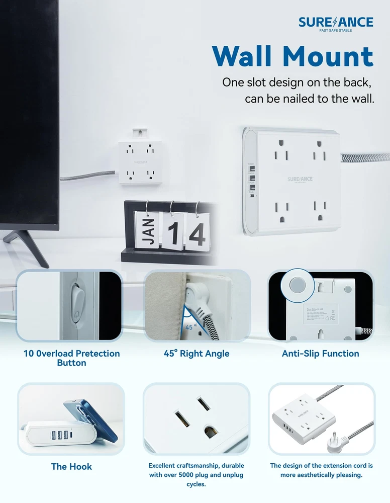 【10-in-1 Versatile Power Strip】Offering a total of 8 sockets, including 4 AC outlets, 3 USB-A ports (5V 2.4A), and 1 USB-C port with 15W fast charging capabilities. With a maximum power capacity of 1250W/10A and surge protection of 1050J, this power strip ensures safe and stable charging for multiple devices. The 5FT extension cord with high-conductivity yellow brass construction provides reliable power transmission and resistance to bending. ETL certified. 【Multi-Functional Small Hook】The sleek power strip is equipped with a small hook on the side, which can be pulled out when needed and retracted according to your own wishes. The hook can be pulled out to act as a phone or PAD stand, making it more convenient for watching videos or taking photos. It can also be hung on a nail-free wall, saving space and adding functionality and convenience. Suitable for various scenarios: home Equipment, office Accessories, workshop essentials, gaming room. 【11 Safety Protections】The power strip surge protector offers comprehensive safety protection with 11 safety protections. These include a fireproof casing, 1050J surge protection, overload protection, grounding protection, short circuit protection, overcurrent protection, overvoltage protection, overheat protection, high-frequency anti-interference protection, aging resistance and moisture protection, as well as anti-electric shock protection. This ensures that your devices are safeguarded against various potential risks, providing peace of mind during charging and usage. 【Comprehensive & Spaced Outlets】A switch on the side that automatically shuts off the circuit board in case of circuitissues, ensuring circuit safety (10A overload protection button). The wider spacing between the outlets accommodates plugs of different shapes and sizes. 3USB−A&1USB−C charger with a 5Vdc 3.4Amax output, ideal for travel as it can charge three iPhones simultaneously within two hours, and is compatible with various devices like phones, headphones, Pads, small fans, and toothbrushes. It measures L3.9” x W4.13” x H1.16”. 【Mountable and Flat Plug】The electric plug multiplier, designed with one holes on the back for easy installation. Featuring a flat plug with a slim profile, this power strip is perfect for tight spaces. The plug is also inclined at a 45-degree angle for convenient access and ease of use. The back features anti-slip pads for effective skid resistance. Excellent craftsmanship, durable with over 5000 plug and unplug cycles. UL94 V-0 flame-retardant material, electrical resistance withstands up to 1382 degrees Fahrenheit.