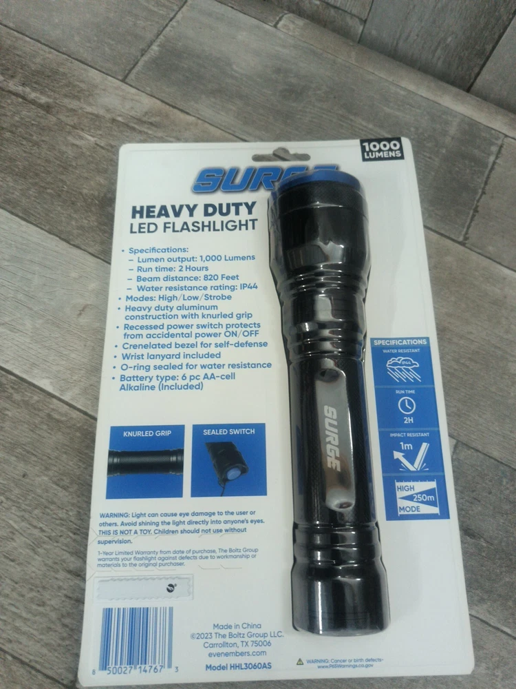 Experience the power and durability of the Surge Tactical 1000 Lumens LED Flashlight, a must-have for any outdoor enthusiast or professional security personnel. Crafted from robust aluminum, this flashlight promises to withstand the rigors of heavy use while providing a bright, reliable source of illumination. The sleek black design is both stylish and functional, enhancing your tactical gear with its compact and efficient LED lighting technology. Its high lumens output ensures visibility in the dark, making it ideal for camping, hiking, or any low-light situation. With its AA battery technology, this flashlight is both practical and easy to maintain.