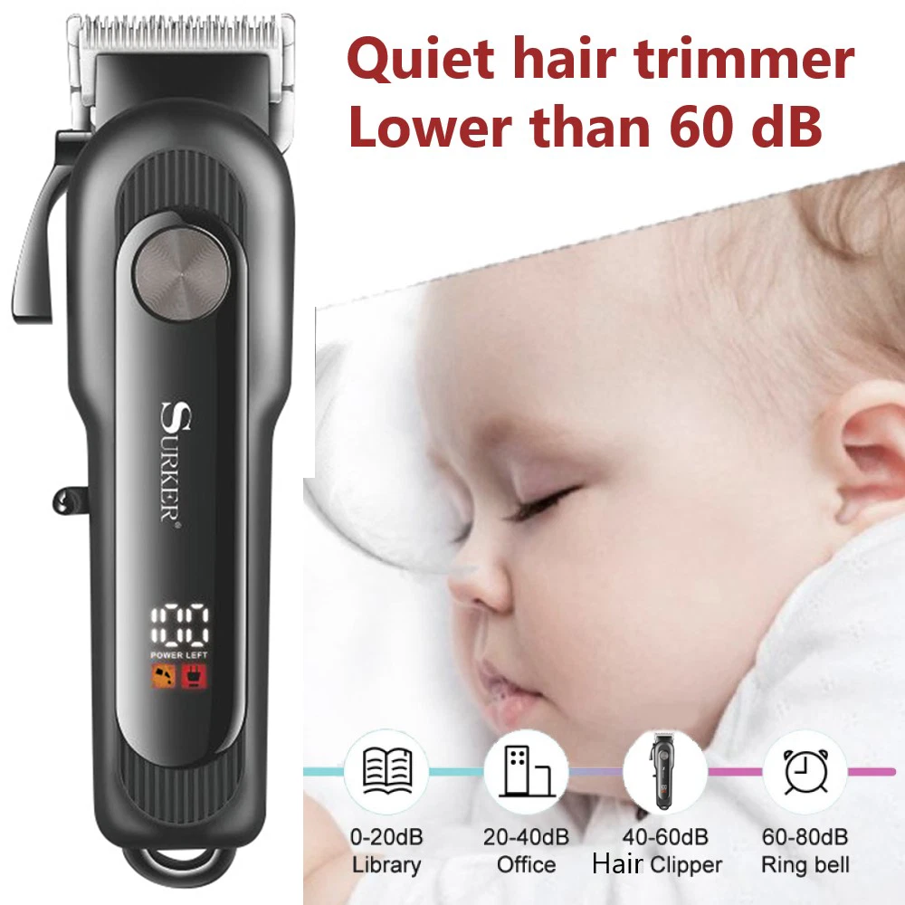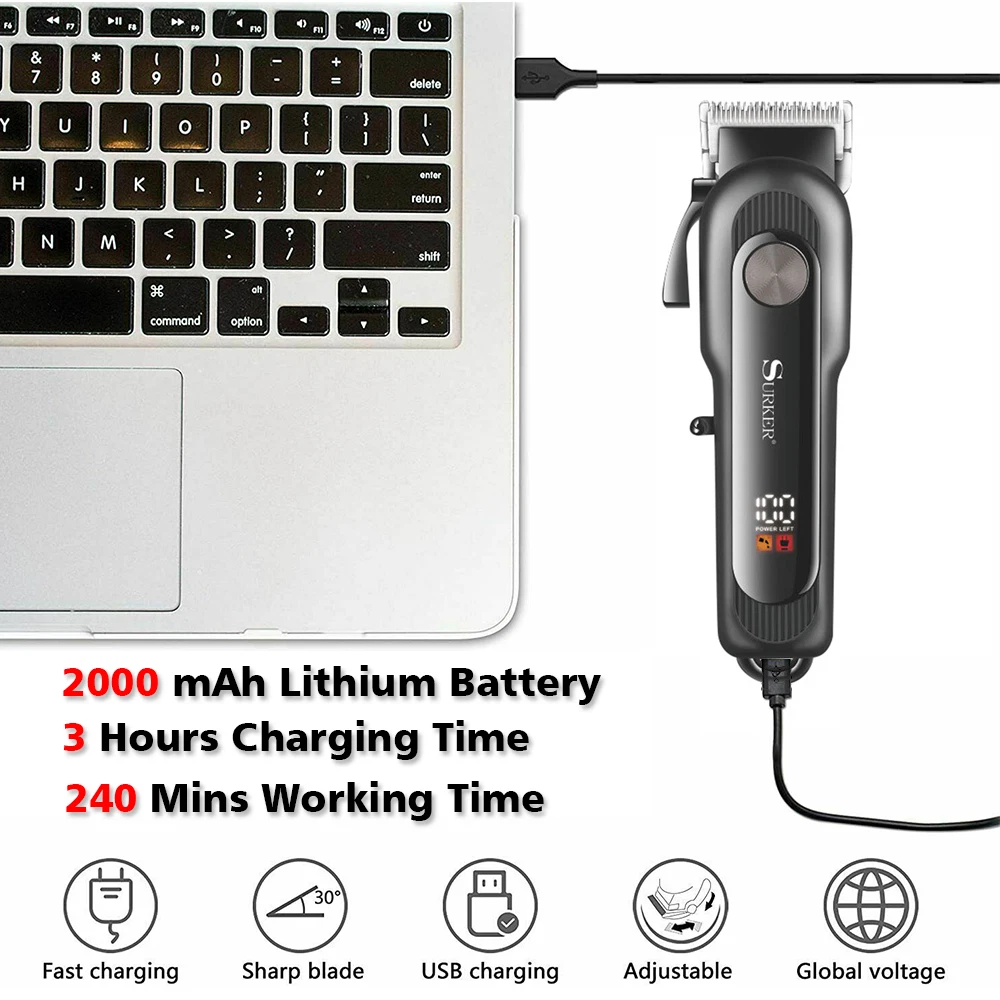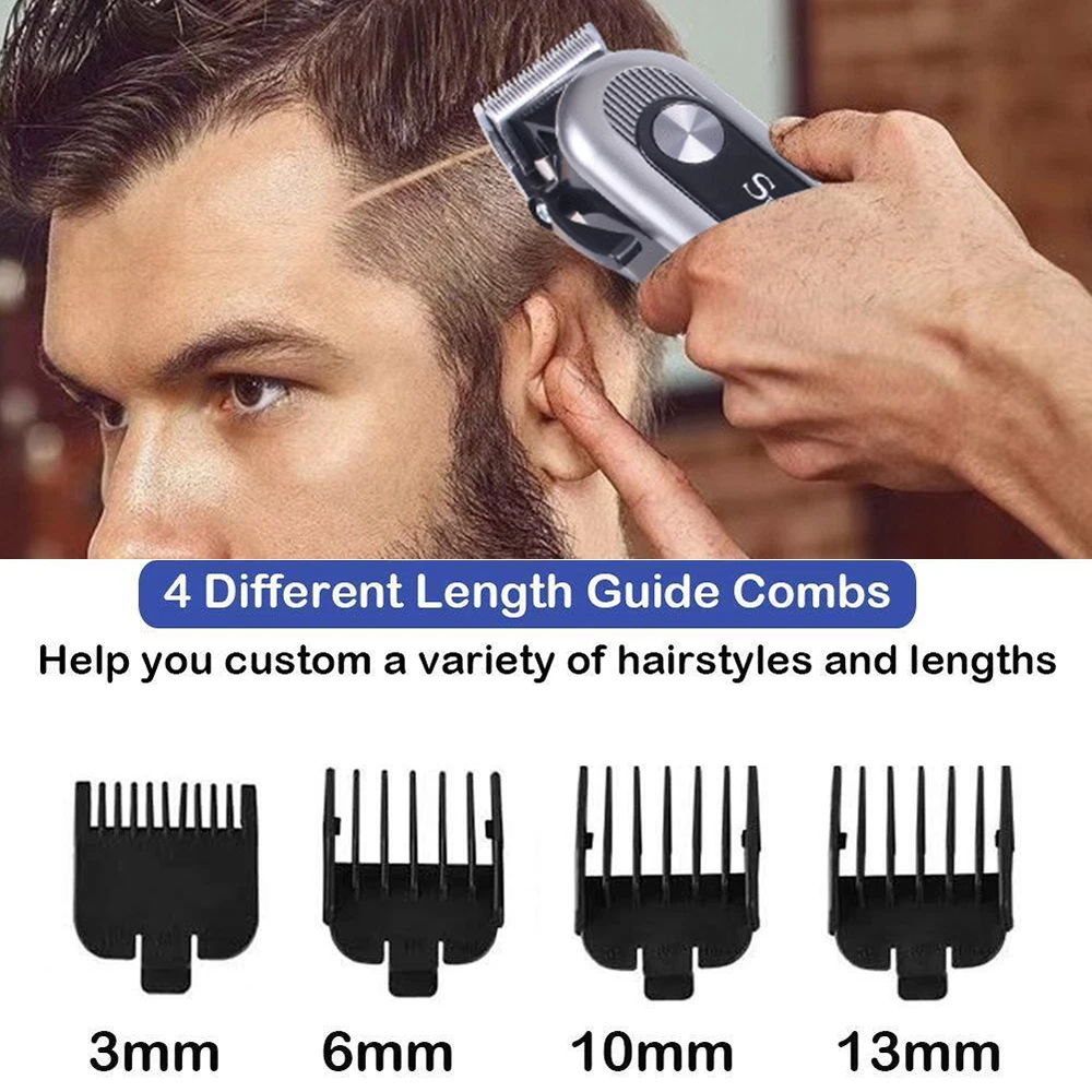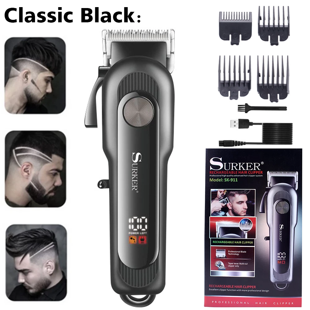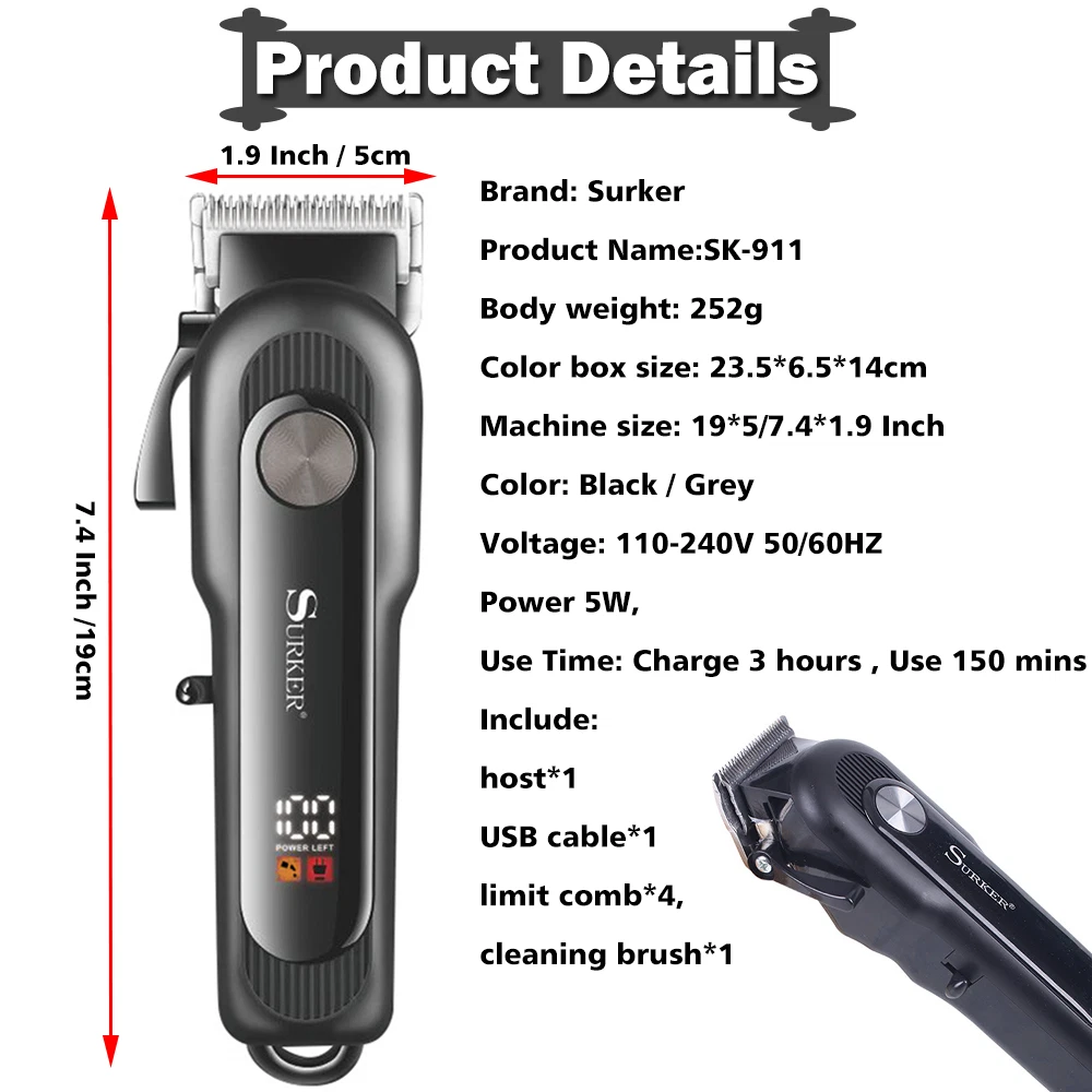 Product details: 1 Using high quality steel, sharp and durable. 2: limit comb * 4 (3/6/9/12mm) 3: The R-type blade safely, cuts hair easily and does not hurt the skin. 4: waterproof design, easy to clean. 5: Large capacity lithium battery can work up to 240 minutes. Product parameters : Brand: Surker Product Name:SK-911 Body weight: 252g Color box size: 23.5*6.5*14cm Machine size: 19*5/7.4*1.9 Inch Color: Black / Grey Voltage: 110-240V 50/60HZ Power 5W, Use Time: Charge 3 hours , Use 150 mins Include: host*1 USB cable*1 limit comb*4, cleaning brush*1
