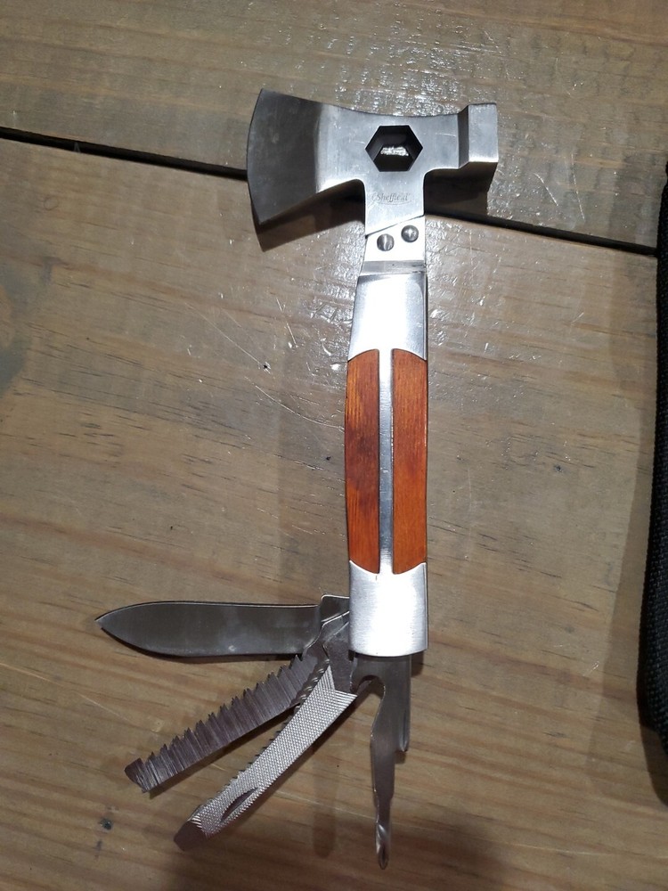 This multi-tool kit is the perfect addition to your camping or emergency survival gear. The set includes a Sheffield brand axe, hatchet, hammer, and pliers, all made of durable stainless steel. With a total length of approximately 7 inches, this multi-tool kit has everything you need for any situation. The features of this kit include interior angle wrench, bottle opener, belt pouch, Phillips/slotted screwdrivers, wire stripper, knife, saw, fish scaler/hook remover, and file. It is suitable for both indoor and outdoor use, and is a must-have for any adventurer or emergency preparedness kit. Get your hands on this essential tool set today!