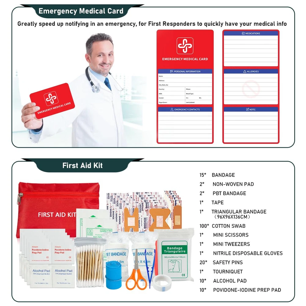 [Preparedness for the Unknown]: While no one can predict when or how severe a disaster or accident will be, our 262pcs survival kit ensures your family’s safety during the critical first 72 hours. Designed for family use, it was developed in collaboration with first responders, doctors, special forces operators, mountain guides. Whether you're preparing for earthquakes, tornadoes, wildfires, or hurricanes, our survival kit provides peace of mind [Comprehensive First Aid Kit]: The included first aid supplies are stored in a bright red pouch, containing tweezers, scissors and pins, non-woven pad, triangular bandage, tournquet, cotton swabs, cotton balls, a generous supply of bandages etc, meeting all your medical and emergency needs. It also includes medical emergency card to record your basic information, helping first responders quickly identify and treat you if you're incapacitated [Safety Companion for Journey]: Our emergency kit includes many survival gear and supplies to ensure access to food, water, warmth, and light in a crisis. The fishing kit and multi-usage spoon help you catch and prepare food, while the collapsible water container bag helps store water. Fire starter and stick make it easy to build a fire. A flashlight,camping lamp, and glow sticks provide up to 72 hours of lighting, crucial for signaling for help and safe navigation [Essential Survival Gear]: Additionally, this survival kit includes a detachable multifunctional axe with hammer and a 2-in-1 shovel with pick, made of sturdy cabon steel. Combined with wire saw, emergency tent and blanket, rope, and compass, you can quickly set up an emergency shelter while maintaining your body temperature. Unlike others mini axes, our axe and shovel are 17 inches long, providing effective protection in the wild against animals or in other emergencies [Convenient Packaging]: The survival gear and supplies are packed in a crossbody bag, making it easy to carry and access in emergencies. The bag features multiple compartments and molle compatible straps and D-rings, allowing you to attach extra pouches or survival tools. The crossbody strap is also detachable, making it easy to connect to a tactical survival backpack using carabiners or the molle system [Customer Support]: Every item has been rigorously tested and developed based on guidelines from disaster and emergency agencies, ensuring they can withstand the harshest conditions, whether you're engaging in outdoor adventures, hunting, camping, hiking, or facing natural disasters like earthquakes, tornadoes, or floods. If you have any questions, feel free to contact us, and we'll be here to assist you within 24 hours