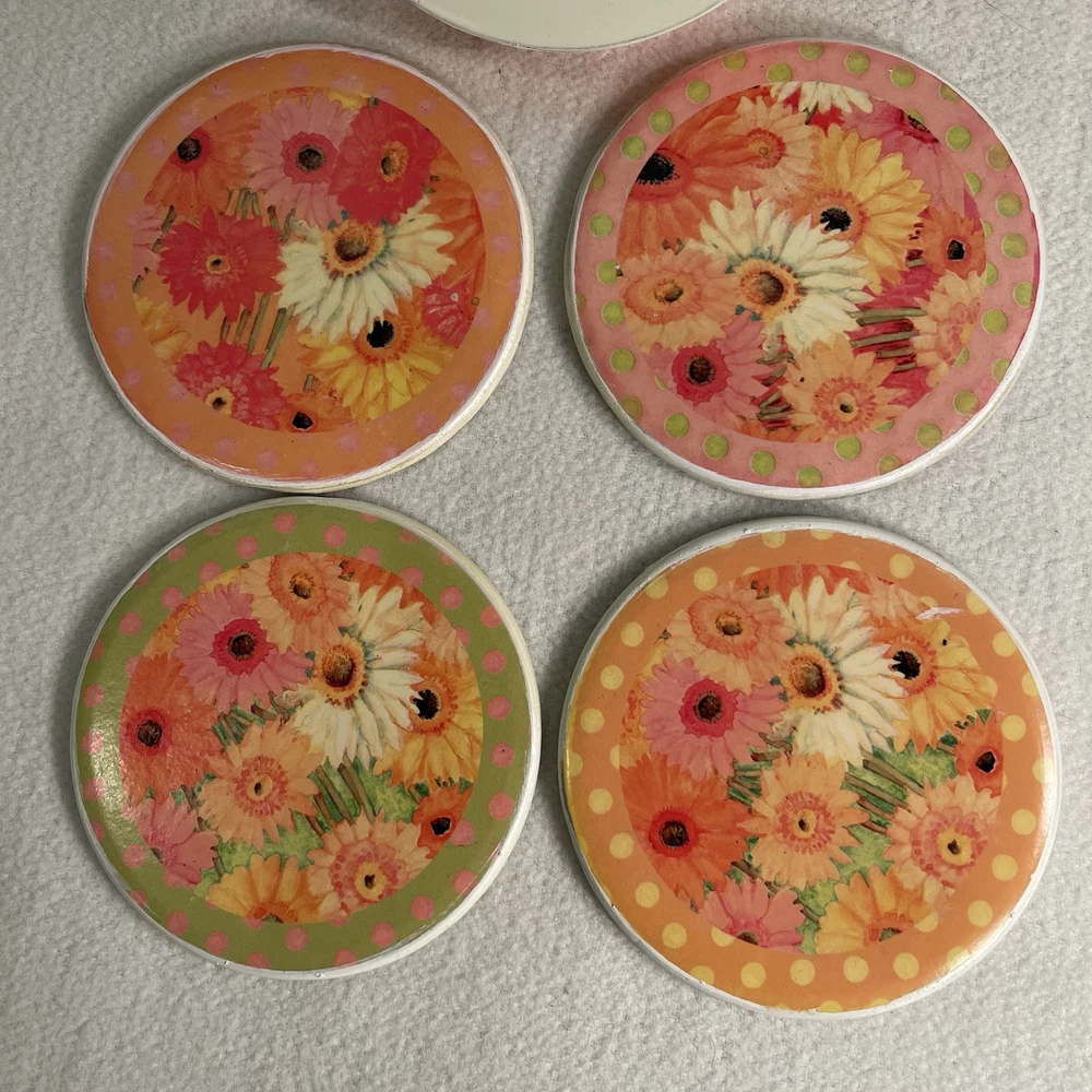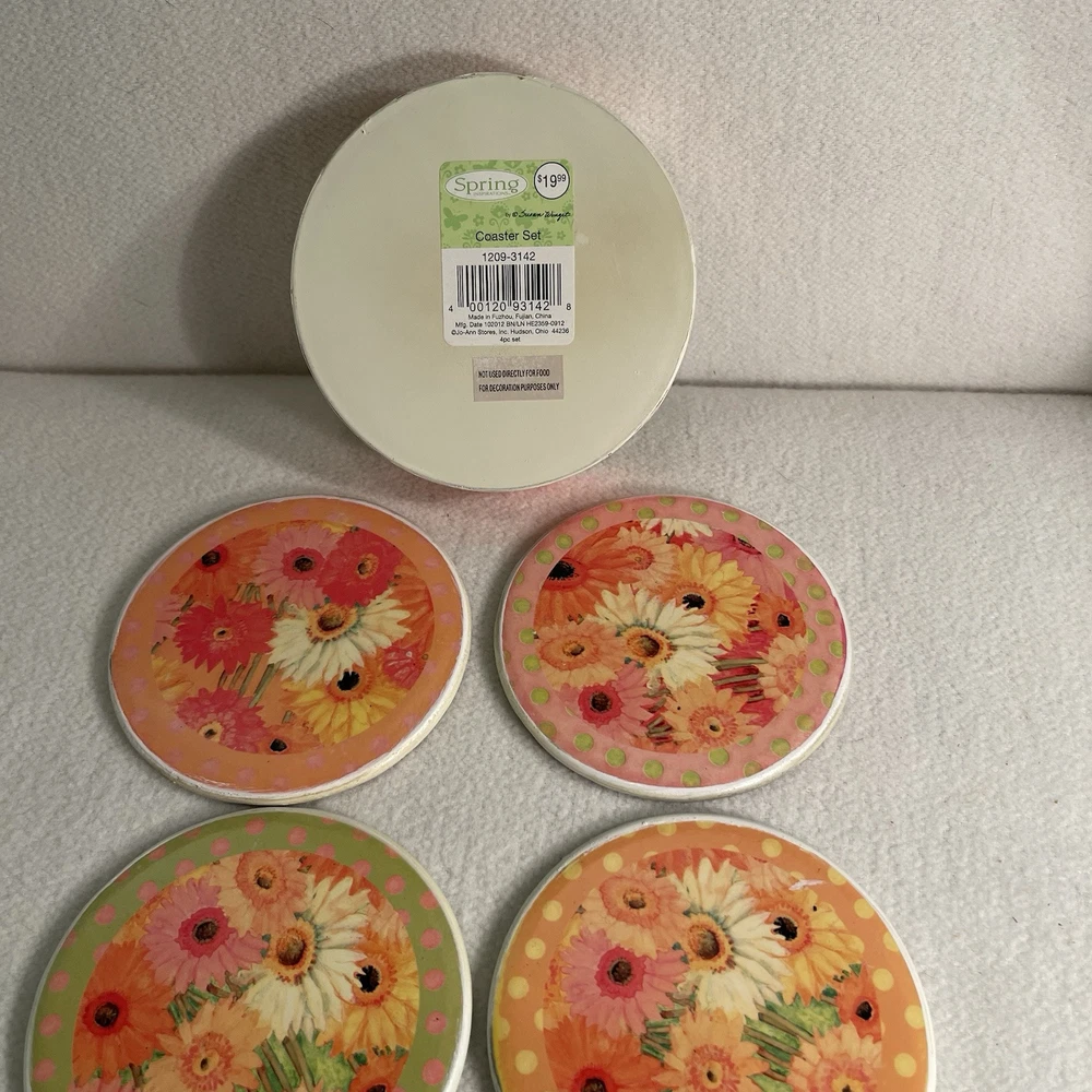 The Susan Winget Spring Floral Coaster Set includes 5 round coasters featuring a modern floral design. The set comes with a lightweight plastic rack/holder for easy storage. Each coaster has a width of 4.5 inches and is stackable for convenience. Perfect for all occasions, these multicolored coasters add a touch of style to any home decor. Excellent condition. New with opened box. Weight 14.2 oz Height 1.25”