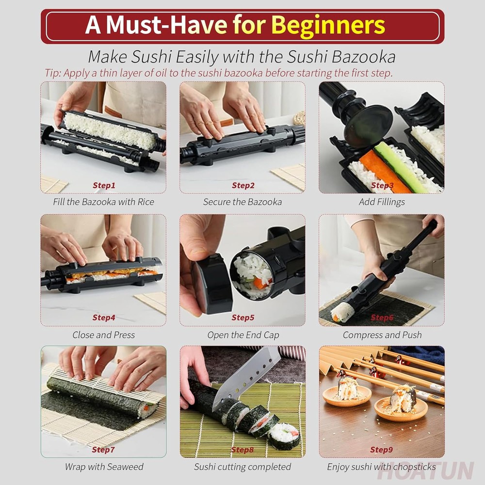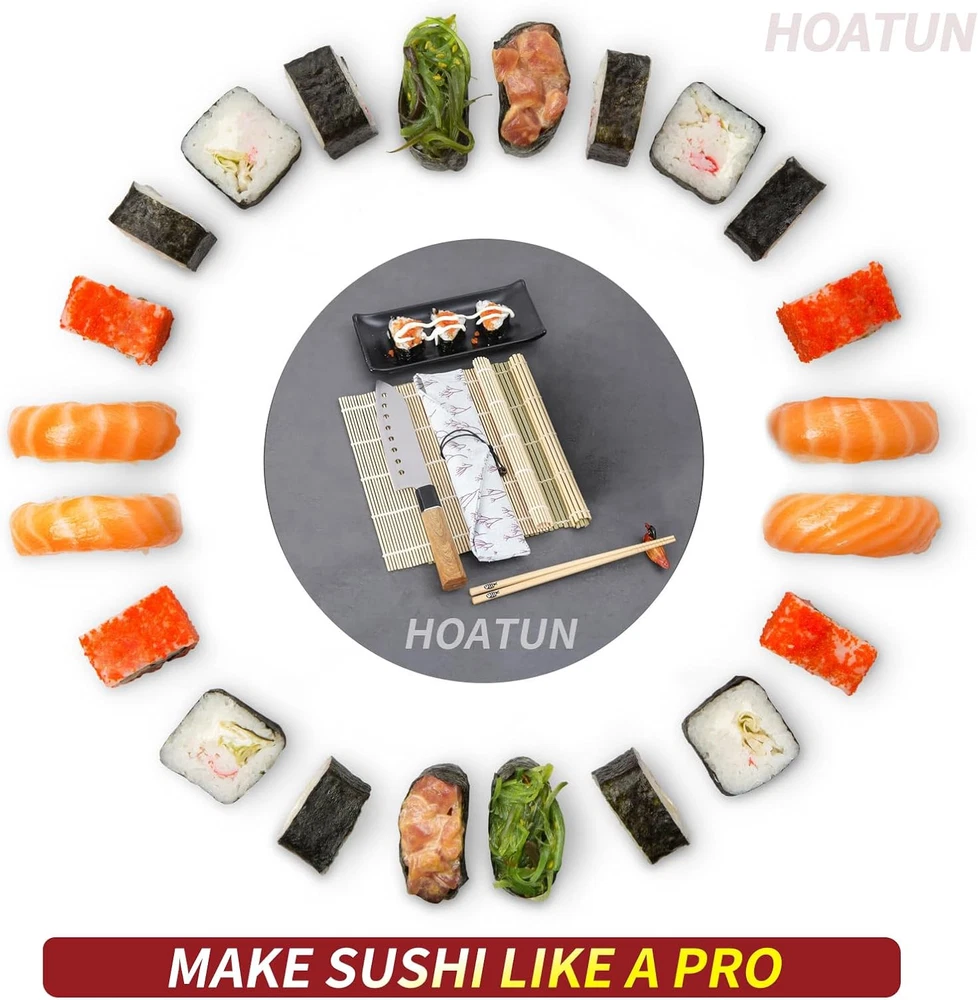 Sushi Making Kit, Mold for Beginners, standard, Black 15pcs Product Details Material: Plastic, Bamboo Brand: HOATUN Color: Black 15pcs Special Feature: Reusable, BPA Free, Durability, Handcrafted, Eco-Friendly Occasion: Christmas, Party, Picnic, Birthday, Home Style: Black 15PCS Shape: Square Seasons: All Seasons Product Dimensions: 3.74"L x 3.74"W x 12.78"Th Recommended Uses For Product: Sushi Pattern: Japanese Product Care Instructions: Hand Wash Only Size: standard Item Weight: 1.5 Pounds Is Microwaveable: No Net Content Weight: 1.5 Pounds Material Feature: Natural, Food Grade Is Dishwasher Safe: No Included Components: Chopsticks Holder, Bamboo Chopsticks, Sushi Roller Bazooka, Rice Paddles, Bamboo Sushi Mat Theme: Japanese Product Name: Sushi Making Kit Reusability: Reusable Package Type: Box Set Manufacturer: HOATUN Item Weight: 1.5 pounds Country of Origin: China Item model number: sushi-02 DIY SUSHI FEAST - If you are tired of going to expensive Japanese restaurants eating fixed flavors. Then this is the sushi making kit for you! You can put your favorite ingredients to DIY your sushi, maybe cheese, butter, bacon, or others. Whether you are a beginner or a professional sushi chef, the HOATUN ALL-IN-ONE Sushi Set has everything you need to prepare a sushi feast in minutes! SAVE TIME AND MONEY! EASY USE & EASY CLEAN - Food-grade plastic sushi bazooka delivers, spreads, and rolls up rice. 100% natural bamboo mat rolls the rice roll and nori together. The professional sushi knife has a nonstick coating to ensure smooth sushi cutting. After making delicious sushi, just wash the tools with clean water. ♻️FOOD-GRADE & HIGH QUALITY - The HOATUN sushi maker set is crafted from BPA-FREE FOOD-GRADE material. All items are sterilized and disinfected! The top-quality natural bamboo material with a light bamboo fragrance, no splinters, and no unraveling of the cotton string stitching. The upgraded sushi knife conforms to ergonomics, creates a secure grip, and is easily cut. All the tools ensure your safety and satisfaction! EXCITING EXTRA ACCESSORIES - In addition to the comprehensive sushi making tools, we provide extra Japanese-style accessories: 4 x Chopsticks, and 4 x Chopstick Holders, 1 x Rice Spreader, 1 x Shamoji Rice Paddle. All of these are made from 100% natural bamboo, which is healthy and adds an eye-catching touch to your dining table. IDEAL GIFT CHOICE - HOATUN sushi tool set is perfect for a sushi party, a family night, a food party with friends, or a family time with children. All items are packaged in an attractive box, making it a fantastic and thoughtful gift idea for birthdays, Christmas, or Thanksgiving Day. Problem with your purchase? Don't worry! We are committed to providing excellent customer service and are always ready to assist you. Sushi Making Kit, Sushi Making Mold for Beginners, Professional Home Sushi Maker, Sushi Rolling Machine with Sushi Roller Bazooka, Sushi Mat, Chopsticks, All in One DIY Sushi Machine, Black