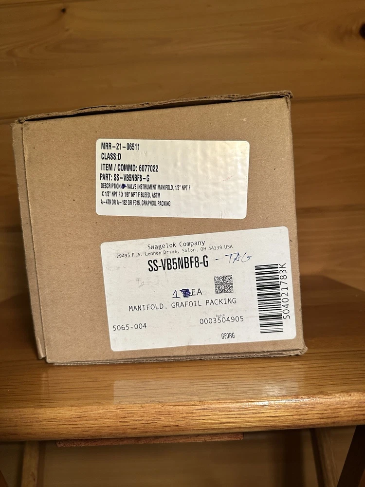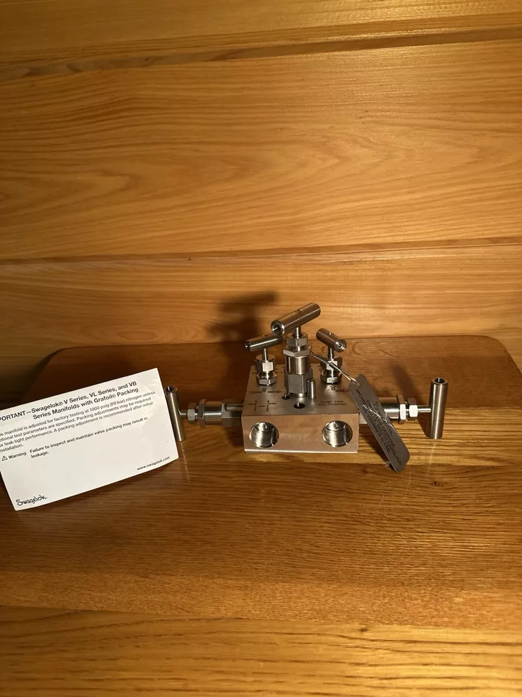 Swagelok SS-VB5NBF8-G Valve Instrument Manifold with Grafoil Packing Part: SS-VB5NBF8-G Description: Valve Instrument Manifold, 1/2” NPT F X 1/2” NPT F X 1/8” NPT F Bleed, ASTM A-479 or A-182 GR F316 MRR-21-06511 Class: D Brand New!