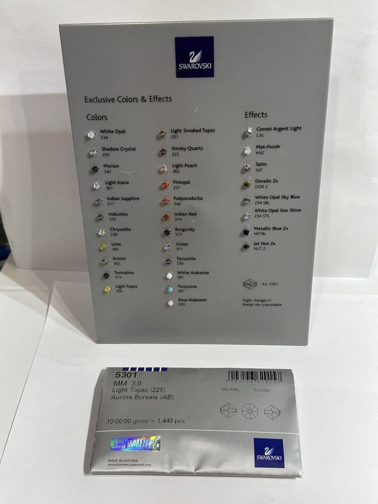 Swarovski Crystal Beads 5301, Bicone 3MM, Light Topaz (226) Aurore Boreale (AB) ,1440Pcs The product is a set of Swarovski Crystal Beads in a bicone shape measuring 3mm in size. The beads are in a light topaz color with an Aurore Boreale finish. These high-quality crystals are perfect for various crafts and jewelry making projects, adding a touch of elegance and sparkle to any creation.
