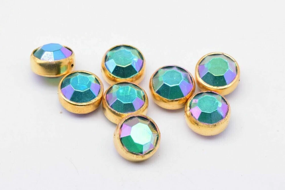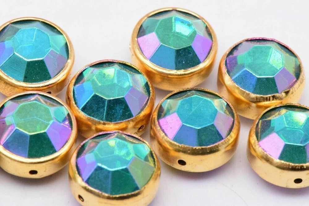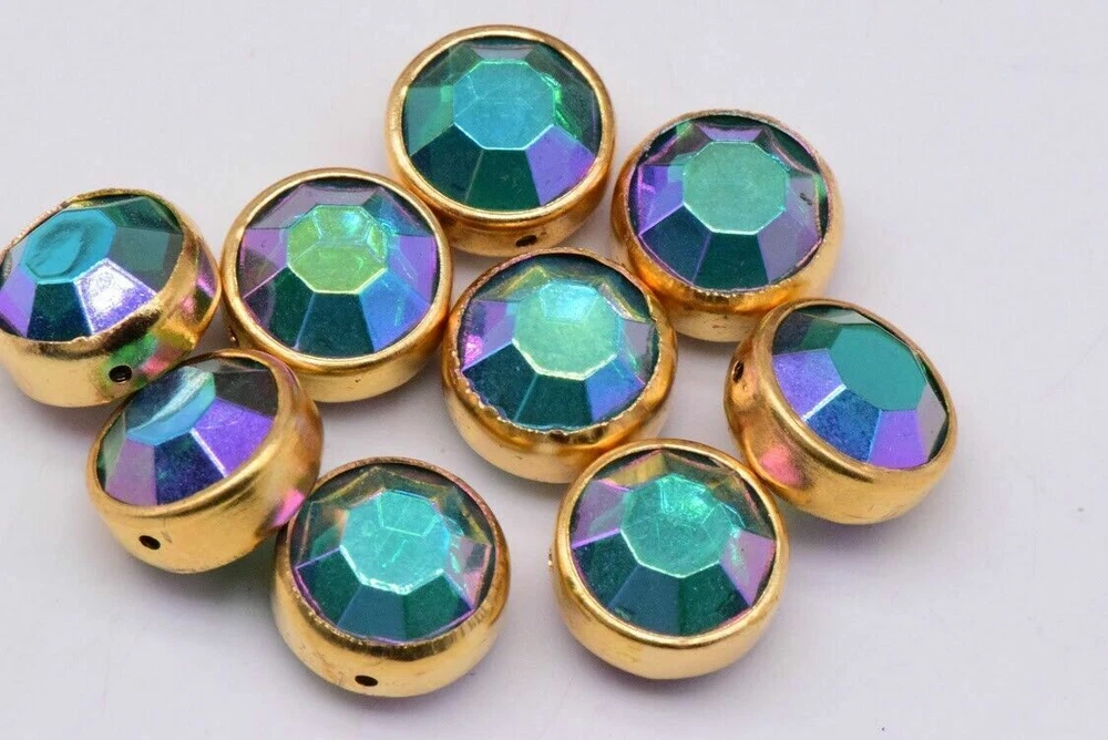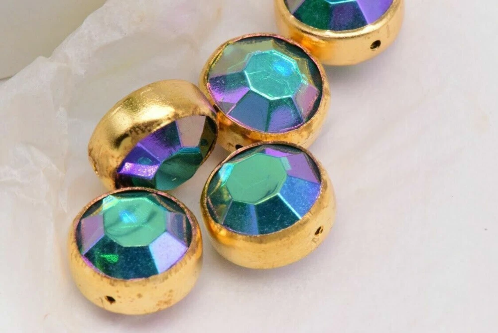 Glass Aurora Borealis Emerald & Gold Rondelle Beads Faceted 12 mm Vintage Please view all photos Since We Offer Free Shipping On Orders $50.00 PLUS, Ebays System Doesn't Combine Shipping On Smaller Orders. (They State That It Is Working The way It Is Suppose Too ;-( ) We ONLY Charge $5.99 For 1st. Item & .99 each Additional Item. Please Pay In Full & We Will REFUND The All The Shipping Overages. Just Send Us A Note To Confirm. Thank You For Your Business!!
