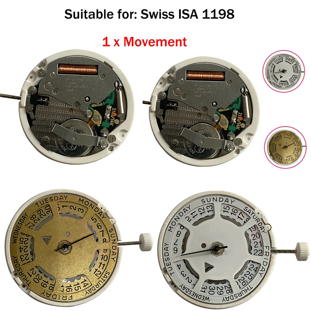 Product Description Features: Quartz movement, watch replacement part accessory, high and reliable quality. Perfect for repairing, replacing or making clocks. Made of quality quartz material, durable and sturdy, having long service time. Wonderful replacement for the old or broken quartz watch movement. Exquisite workmanship, easy and convenient for installation, reliable in use. Suitable for Swiss ISA 1198 Specifications: Size: 11 1/2 ligne Diameter: 25.60mm(1 inch) Height: 4.10mm(0.16 inch) 3 hand, 1 jewel Date at the 3 o'clock position and the day at 12 o'clock Hand dimensions are 150/90/20 (h/m/s) Battery: 927(included) Package include: 1* Watch Movement(With battery) Shipping Returns Contact Us Payment 1. Items sent from US warehouse. 2.Receiving time = Processing time + Shipping time 3. Processing Time: Around 1-2 business Days 4. Shipping Time: 3-5 business day it may have a little delay during some holiday (such as Christmas),any problem ,please feel free to contact 1. 30 days warranty from the purchased date. Please contact us via email before returning the defective item. 2.Our warranty does not extended to any product that are physically damaged or that are not under normal operating conditions as result of misuse or improper installation on the buyer/user's part. 3.Return items should include the original packaging and all accessories. buyers MUST contact us for the returning address. 4.In all cases, buyers pay shipping fees at their own cost to return products for exchange or refund. We will be responsible for the postage of replacements. Refund will be made upon receipt of the returned item. Pls contact us if you have any problems,we will try our best to solve for you We accept all verified payment from eBay. Shipping 1. Items sent from US warehouse. 2.Receiving time = Processing time + Shipping time 3. Processing Time: Around 1-2 business Days 4. Shipping Time: 3-5 business day it may have a little delay during some holiday (such as Christmas),any problem ,please feel free to contact Returns 1. 30 days warranty from the purchased date. Please contact us via email before returning the defective item. 2.Our warranty does not extended to any product that are physically damaged or that are not under normal operating conditions as result of misuse or improper installation on the buyer/user's part. 3.Return items should include the original packaging and all accessories. buyers MUST contact us for the returning address. 4.In all cases, buyers pay shipping fees at their own cost to return products for exchange or refund. We will be responsible for the postage of replacements. Refund will be made upon receipt of the returned item. Contact Us Pls contact us if you have any problems,we will try our best to solve for you Payment We accept all verified payment from eBay. powered by