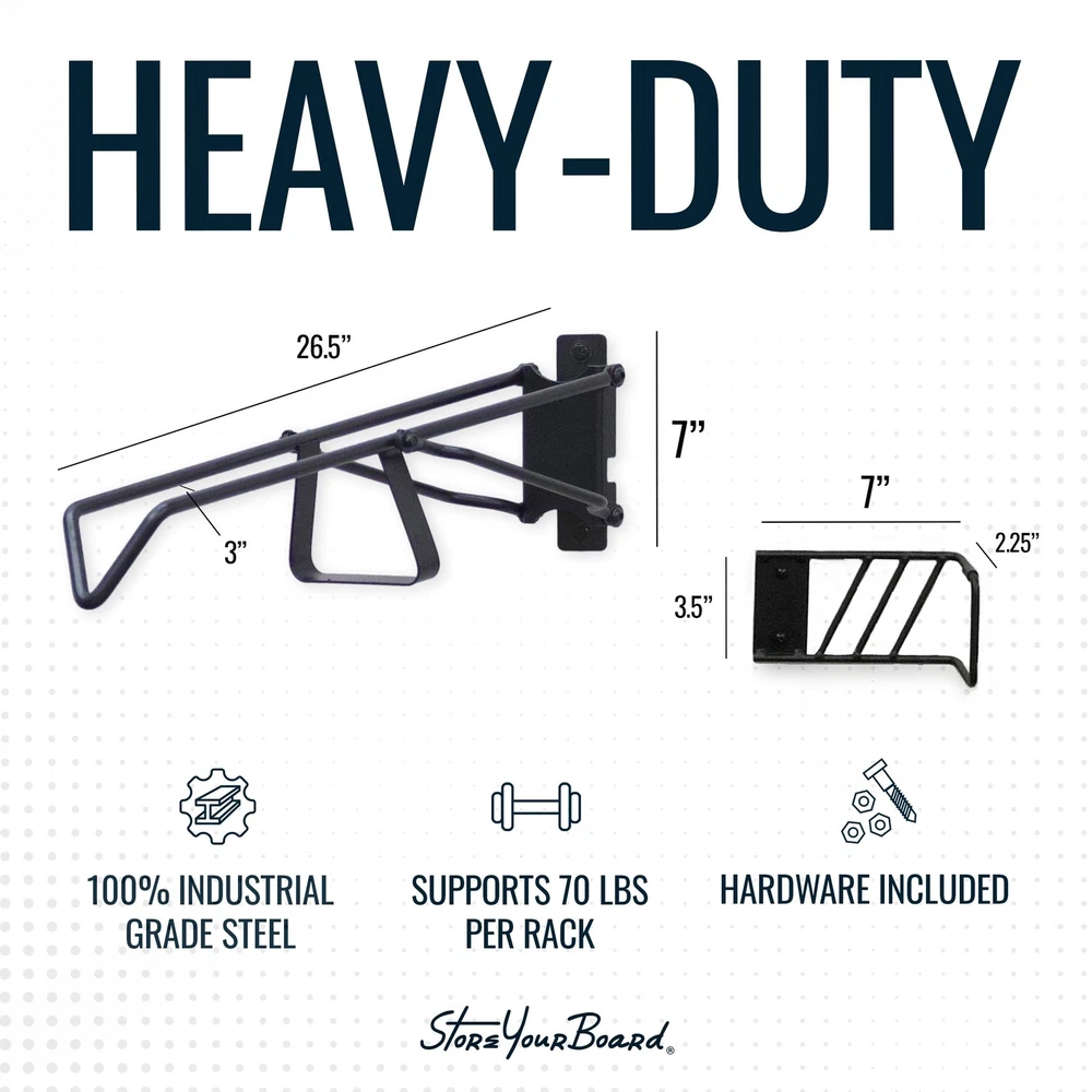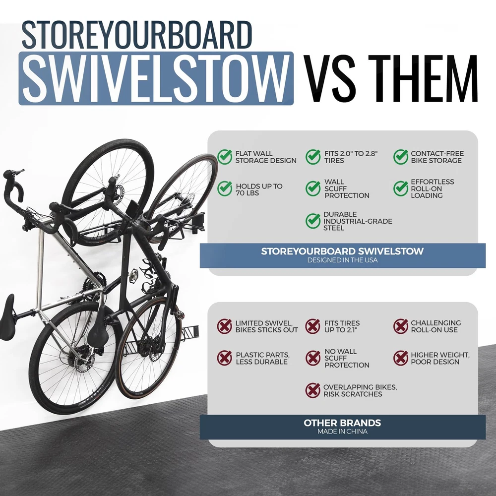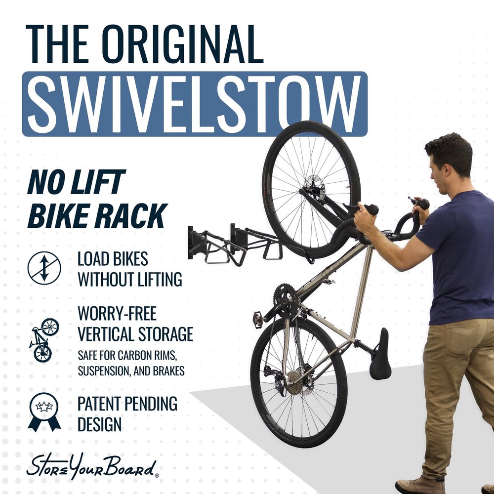 Effortless bike storage starts with the No Lift design, allowing you to roll your bicycle onto its back tire and easily glide it into place. This 2-pack of Swivel Bike Racks is perfect for garage organization, storing bicycles flat against the wall and accommodating tires between 2.0" and 2.8". From carbon frames to e-bikes, these racks keep your bikes ready for adventure. The patent-pending swivel mechanism saves garage space by tilting the bike flat for compact storage and enabling side-by-side mounting without contact. Built from durable, industrial-grade steel, each heavy-duty rack supports up to 70 lbs, ideal for MTBs, e-bikes, and more. A scuff-free design includes a rear tire catch to protect your garage walls from tire marks, ensuring your space stays clean and damage-free. No-Lift Bike Storage: Wall-mounted bike rack garage solution that eliminates heavy lifting. Simply roll your bike onto its rear tire and glide it into place. Ideal for effortless bike storage in garage or shed. 2-Pack Bike Rack Wall Mount: This garage bike rack wall mount stores mountain bikes flat against the wall. Fits bikes with tires 2.0'' to 2.8'' wide, including carbon frames and e-bikes. Perfect bike organizer for garage walls. Heavy-Duty Steel Construction: Built from industrial-grade steel with no plastic parts for durable bike organization. Each bike hanger wall mount supports up to 70 lbs, making it robust enough to store your most valuable bikes, including MTBs, e-bikes, e-mountain bikes, and more. Scuff-Free Wall Protection: Keep walls pristine. This bike rack includes a protective rear tire catch that supports your bike wheels and protects your wall. It serves as a barrier to prevent damage from tire marks, ensuring your space stays clean and damage-free. Patent-Pending Swivel Design: Engineered for ultimate space-saving. With an original handlebar tilt, this wall mount bike rack swivels the entire bike flat for compact storage against the wall. This design also allows for contact-free side-by-side mounting. Built To Last – Backed By Life-Long Support: All our products are designed for durability and reliable performance. Manufacturer support is available when used and maintained as instructed. We stand behind the quality with warranty for life.