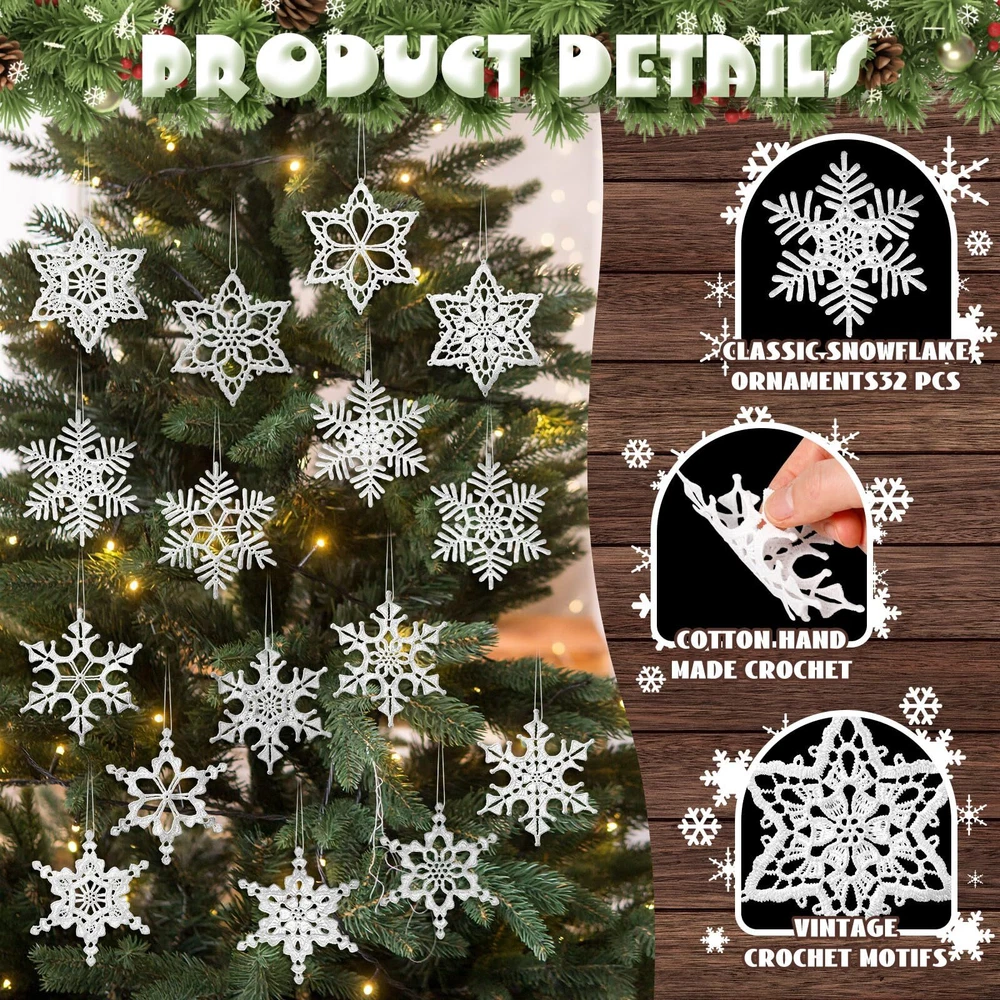Features: These ornaments are perfect for dressing up Christmas trees, but they can also be applied for other indoor and outdoor decorations. They can be applied to decorate walls, ceilings or windows, adding a touch of winter charm to any area. With the traditional snowflakes design, these ornaments bring in the winter and holiday spirit to your home or business. The beautiful crocheted details make them aesthetically pleasing. Specifications: Main material: cotton Main color: white Size: about 3.15 inches/ 8 cm Package includes: 32 x Crochet snowflake ornaments Notes: Manual measurement, please allow slight errors on size. The color may exist a slight difference due to different screen displays. Sufficient Quantity: the package includes 32 pcs crochet snowflake ornaments in 16 styles, 2 pieces for each style; Rich quantities and style, you can generously sprinkle snowflakes across your decoration, creating a snowy Christmas environment Suitable Size: Christmas snowflake ornament measure approximately 3.14 inches/ 8 cm, lightweight and can be hung in places easily with ropes, portability, suitable for hanging on Christmas trees, doors, stairs, windows, walls, wreaths and many other place Comfortable and Sturdy: the Christmas tree decorations are designed using cotton thread, comfortable and solid, carefully woven and not easy to break, tear and deform, washable and reusable; Our crocheted snowflakes are designed to last for many upcoming years Elegant Design: our white snowflakes ornaments come in a beautiful and elegant white color, these Christmas ornaments mimic the actual snowflakes adding to the authenticity of your Christmas decor, and with any winter or Christmas color scheme Applicable Occasions: these Christmas tree crocheted ornaments can not only be applied at Christmas, but ideal for winter themed parties, holidays, festivals, etc., You can send them to your mates, family members, and other people as thoughtful presents