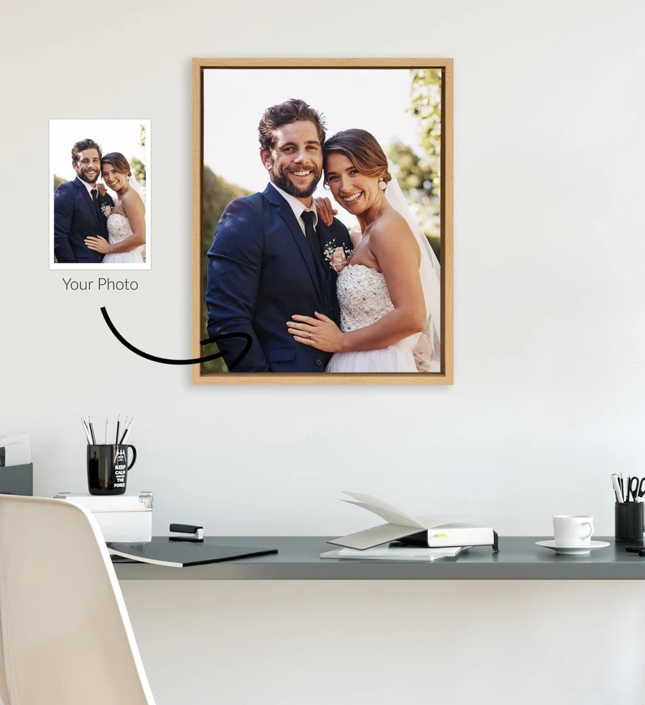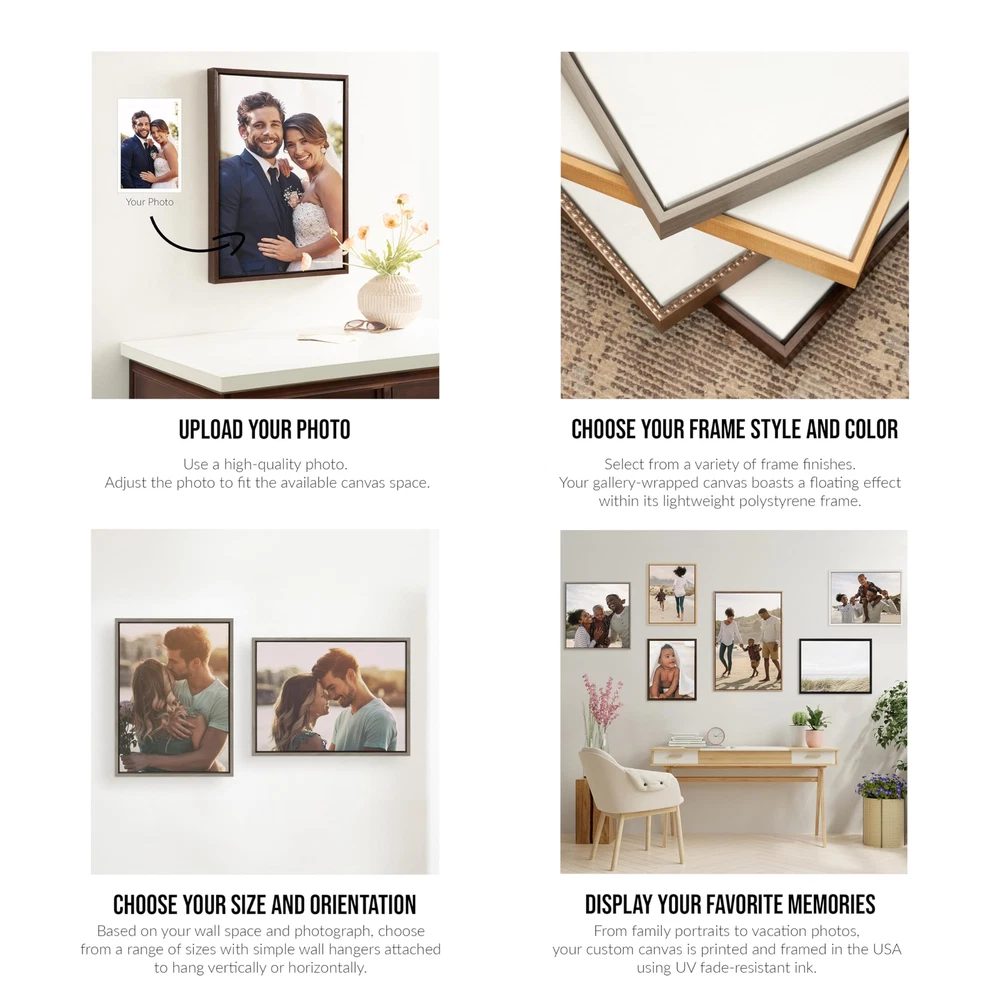 Add your own personal touch to your decor with this custom framed canvas print. Framed in a sleek modern frame, this canvas allows you to create your own masterpiece with a high-quality frame to go along with it. Choose your photo, adjust it to fill the canvas, and select your frame color to match your style. Then, pick the perfect frame size based on your available wall space. Framed in the USA in Waunakee, Wisconsin, this custom canvas art is the perfect way to showcase family memories or scenic photos you've taken. Our custom framed canvases are printed with UV fade-resistant inks to ensure you're getting a high-quality print of your image that is made to last. The charming frame makes these a pleasure to look at every day in any room of your home or art studio. Looking for a Christmas gift for that difficult-to--for family member? Get this customizable framed canvas and showcase of their favorite family photos. This custom canvas wall art comes with attached hangers allowing you to display the piece in just a matter of minutes. The outer dimensions are 16 inches wide by 20 inches high by 1.6 inches deep. Print Pictures from Your : Showcase your favorite memories on the wall with these personalized canvas prints for a charming wall decor look. Outside display dimensions are 16 inches wide by 20 inches high by 1.6 inches deep High-Quality Personalized Canvas Print: Due to our UV fade-resistant inks, the customized photo prints will feature detailed and refined resolution as it is printed and hand-framed in the USA. These framed prints on canvas are the perfect option for family photos, baby portraits, animal pictures, scenic photography, or custom wedding prints Perfect Gift for Family: Professional framing can be very expensive. Our custom framed canvas takes out that extra time and expense, serving as the perfect gift for a housewarming, Christmas, weddings, graduations, Mother's Day, Father's Day, pets, family portraits, and more Choose Your Size and Frame Color: Choose from a variety of sizes and frame finishes to create the exact image for your available wall space; the frame profile is 0.5 inches wide by 1.6 inches deep Easy to Hang: Due to the custom artwork's cutout hangers, you can hang it easily to showcase your favorite family photos or personal art pieces. Buy multiples and create a professional museum-style gallery wall with ease