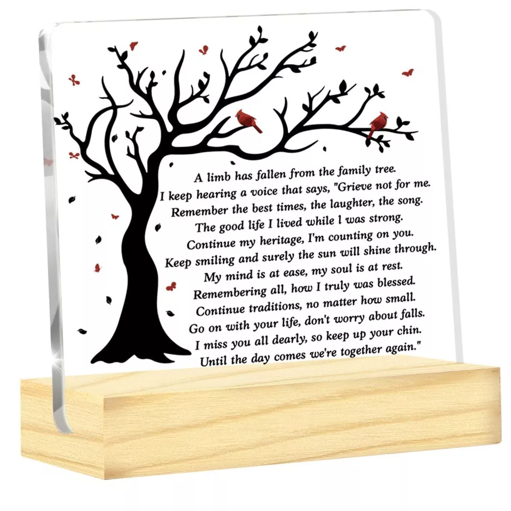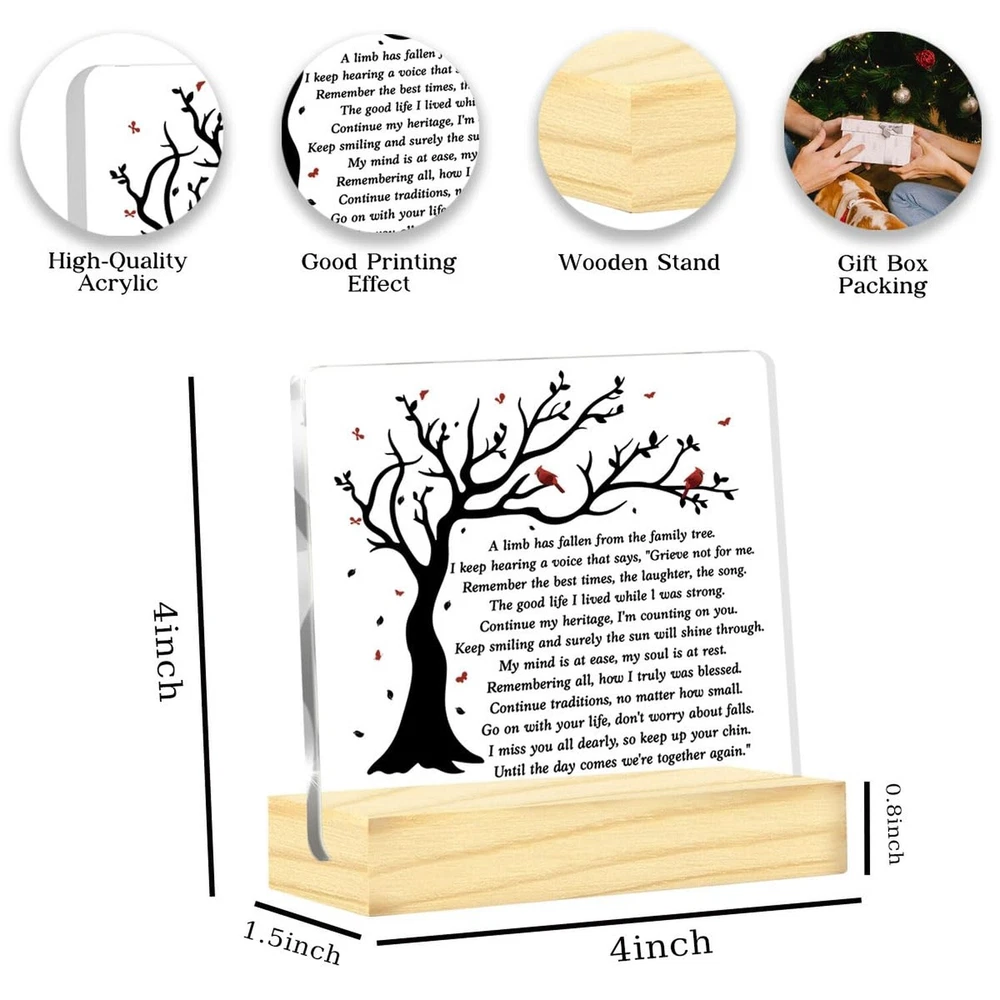Sympathy Gifts for Loss of Loved One Bereavement Gift Ideas Memorial Gifts for Women Men Grieving Gifts Remembrance Sympathy Gifts Clear Acrylic Desk Decoration 4 x 4 Inch Family Product Details Color: Limb Brand: XFW Material: Acrylic Theme: Inspirational Product Dimensions: 4"L x 4"W Shape: Rectangular Style: Modern Product Dimensions: 4 x 4 x 0.04 inches Item Weight: 1.76 ounces Manufacturer: XFW Country of Origin: China Item model number: XFW1010 Perfect SizeStand out from the crowd! Our exquisite acrylic sign measuring 4 x 4 inches, perfect and cute, sizethis sign fits seamlessly on desks or shelves in offices. Premium MateriaThe sign made with transparent acrylic material, each acrylic decoration sign is fitted with a wooden base. This acrylic sign is durable and will stand the test of time. This is a simple and effective way to decorate and beautify your home or office space. Sympathy Gifts for Loss of Loved OneEach letter on this clear acrylic sign symbolizes strength, courage, and hope. Make a special healing gifts for a woman, friend, or family member who is loss of loved one, our acrylic sign are perfect! Be well suited as sympathy gifts for loss of mom, dad, grandma, memorial gifts for loss of mom, dad, mother, father. Help lift their spirits, give them the mental boost they need. Memorial Gifts for Loss of Mom DadUnique memorial gifts acrylic sign with inspiring message, the combination of exquisite design and powerful text makes this acrylic sign a truly unique and thoughtful gifts idea. Whether it's a feel-better gifts, an encouragement gesture, or get out of the trough soon gifts, this clear acrylic sign is sure to bring hope and strength to the recipient. Show your support with this meaningful and uplifting gifts. Healing Gifts for Women MenThis healing clear acrylic sign is no less than a big hug for a person who is in a low period, and give her infinite strength. It serves as a reminder of your love and care every time she look it. A special sympathy and memorial gifts for women or men loss of mom, dad, grandma, get out of the trough soon, or in need of ease grief. Show your support with this meaningful present. Introducing the Exquisite Sympathy Theme Clear Acrylic Sign - A truly unique and thoughtful gifts for women in ease grief. This clear acrylic sign serves as a beautiful expression of your heartfelt wishes for get out of the trough soon, letting the recipient know that they are surrounded by love and support during difficult times. Perfect Size and Material The acrylic sign measuring 4 x 4 inches, crafted from high-quality transparent acrylic material, each acrylic decoration sign is fitted with a wooden base. It allows you to use it for a long time and enjoy the positive emotions it brings. Each clear acrylic sign comes with powerful words, making it a perfect gift filled with warmth, encouragement, and inspiration. It is a touching reminder that your friend is not alone and that better days are ahead. Perfect for sympathy gifts for loss of mom, dad, grandma, memorial gifts for loss of mom, dad, mother, father, healing gifts for women. Whether you are looking for cheer-up gifts, inspirational tokens, or ease grief presents, this clear acrylic sign is ideal for sisters, mothers, coworkers, grandmothers, or any special woman in your life. It is a symbol of hope, resilience, and the unwavering bond of friendship. Let this heartfelt gift convey your warmest wishes, sending hugs and good vibes to those who need it most. With its timeless design and meaningful message, this healing acrylic sign is sure to provide comfort and support to those going through a tough time. Choose this acrylic sign as a touching gesture of love and encouragement, a small token that speaks volumes of care and compassion.