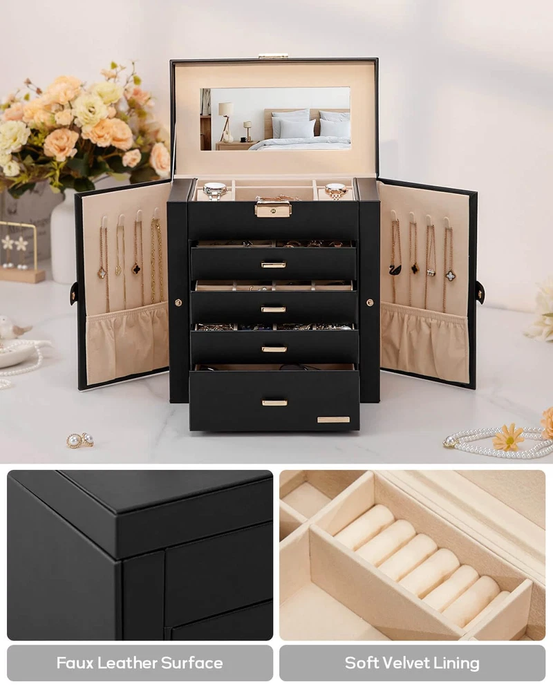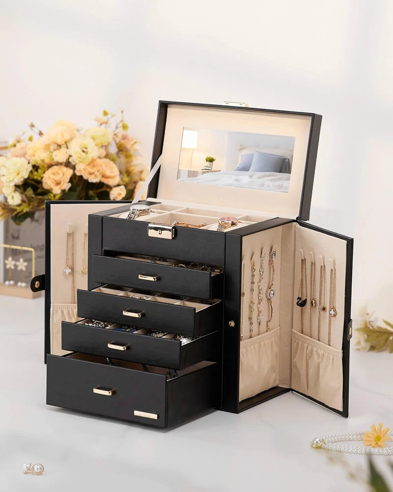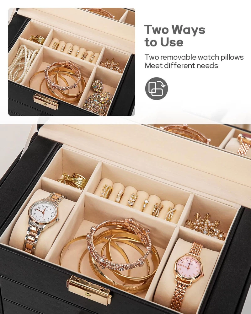 Jewelry and Watch Box: With 4 removable pillows in the top layer, you can store not only your jewelry but also your watches. ELEGANT: Attractive appearance with black faux leather surface and soft velvet lining. Over Dimension: 10.43’’ (L) X 6.10’’ (W) X 11.14’’ (H), large enough to hold your watches, necklaces, earrings, bracelets, hairpins, brooches and other jewelry. 4 Pull Out Drawers, includes a deeper bottom drawer and 3 equal size drawers. Drawer 1 has 4 earring cards and a ring roll. Drawer 2 has 12 equal size compartments. Drawer 3 has 4 equal size compartments. The deeper bottom drawer has only one compartment to store large jewelries. Each drawer is equipped with a delicate handle which can be opened easily. Swing Out Cabinets, each with 8 necklace hooks and 2 storage ledges, help to keep your necklaces from getting tangled. Perfect gift: The lid has a ribbon attached to keep it from falling back, mirror makes it easier to dress yourself, lock with a key adds elegance and security. Ideal gift for Valentine's Day, Mother’s Day, Thanksgiving Day, Christmas, birthday and wedding. Watch and Jewelry are not included.
