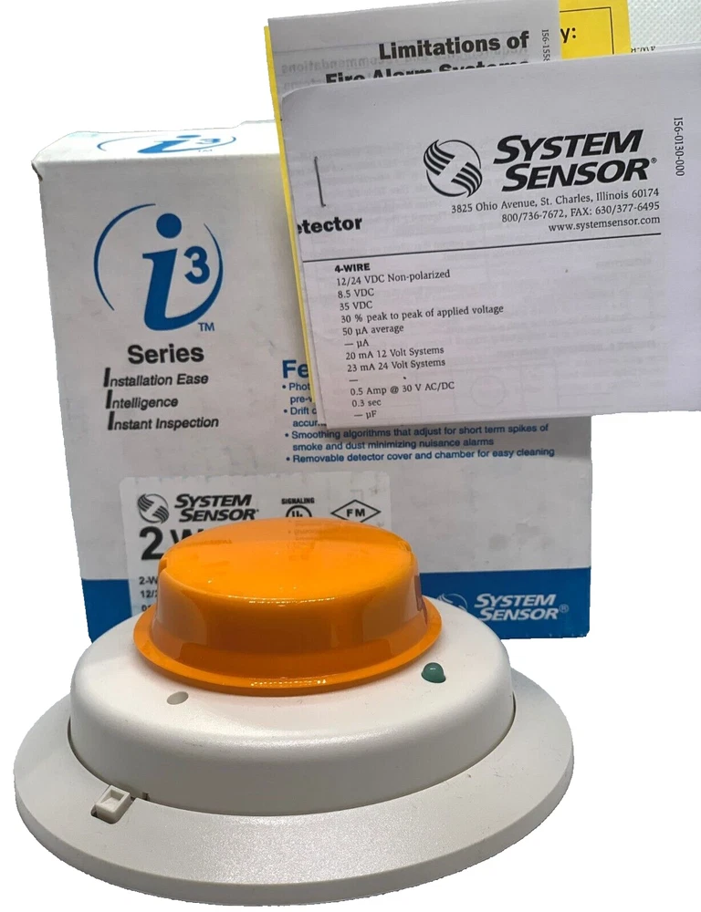 Installation ease. The i3 line redefines installation ease with its plug-in design. This allows an installer to pre-wire bases (included with heads). The large wire entry port and in-line terminals provide ample room for neatly routing the wiring inside the base. The base accommodates a variety of back box mounting methods as well as direct mounting with drywall anchors. To complete the installation, i3 heads plug into the base with a simple Stop-Drop ’N Lock™ action. Intelligence. i3 detectors offer a number of intelligent features to simplify testing and maintenance. Drift compensation and smoothing algorithms are standard with the i3 line to minimize nuisance alarms. 2-wire i3 detectors can generate a remote LEDindicated maintenance signal when connected to the 2W-MOD2 loop test/maintenance module or a panel equipped with the i3 protocol. The SENS-RDR, a wireless device, displays the sensitivityof i3 detectors in terms of percent-per-foot obscuration. Instant inspection. The i3 series provides wide-angle red and green LED indicators for instant inspection of the detector’s condition: normal standby, out-of-sensitivity, alarm, or freeze trouble. When connected to the 2W-MOD2 loop test/maintenance module or a panel with the i3 protocol, the EZ Walk loop test feature is available on 2-wire i3 detectors. This feature verifies the initiating loop wiring by providing LED status indication at each detector.