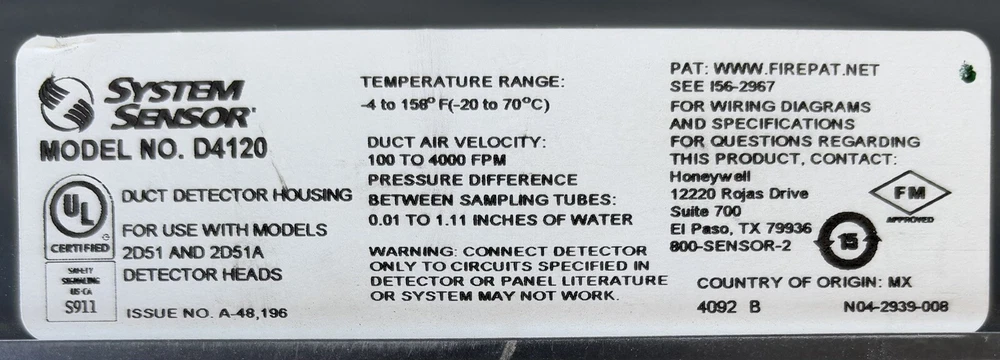 System Sensor D4120 4 Wire Photoelectric Duct Smoke Detector