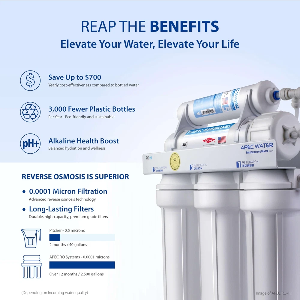 The ROES-PH75 is a 6-stage 75 GPD reverse osmosis water filtration system that adds calcium minerals to enhance the water taste for people who prefer mineral water. This system features a premium mineral cartridge that adds only high-purity calcium carbonate to effectively raise pH in the water for those who desire alkaline water. Other re-mineralization reverse osmosis systems will claim to add various beneficial minerals back into the water; however, their mineral formulations are often from unknown and uncertified sources that can lead to potential health concern. With the ROES-PH75 RO system, users will enjoy unlimited great tasting healthy water right at home for drinking and cooking. Save money, time, and from buying costly, bottled water and live healthier with ultra-safe pure mineral water that is worry free. Designed, engineered and assembled in the USA, this 6-stage water filtration system is ROES-PH75 system has been tested and certified to the highest standard in the industry- WQA gold seal, to guarantee the highest impurity removal rates, giving you the purest water possible. Based off APEC 20 years of experience in reverse osmosis systems design and production, this system will provide users with high-quality safe drinking water for many years to come. 1st Stage: High-capacity polypropylene sediment filter removes sediment, particles, and rust. Protects and extends the life of the membrane and system. 2nd & 3rd Stage: Premium extruded carbon block gets rid of unpleasant chlorine, tastes, odors, cloudiness and colors. Also removes VOCs and other common harmful impurities from the water. 4th Stage: High Rejection TFC reverse osmosis membrane removes up to 99% of total dissolved solids (TDS - total dissolved solids) and impurities such as arsenic, lead, fluoride, chromium, radium and much more. 5th Stage: Advanced coconut shell refining carbon filter (TCR) removes any possible residual taste from the tank. 6th Stage: PH+ alkaline re-mineralizing calcium filter adds calcium carbonate to increase water alkalinity. Supreme quality – Designed, engineered and assembled in USA to guarantee water safety & your health. This 75 GPD 6-stage system ROES-PH75 is guaranteed to remove up to 99% of impurities such as Chlorine, Taste, Odor, VOCs, as well as harmful Fluoride, Arsenic, Lead, Heavy Metals and 1000+ impurities. Max Total Dissolved Solids - 2000 ppm. Feed Water Pressure 40-85 psi Premium made filter cartridge uses premium-grade calcium from trusted source for safe, proven water ph enhancement. Enjoy ultra-pure drinking water with added calcium minerals for improved alkalinity and great taste. WQA certified system. Premium long lasting filters used to treat tap/well water. Provides unlimited clean drinking water. America's no.1 rated water filter brand with 20 years of success guaranteeing trouble free, noise-free system for long lasting, dependable, pure drinking water.