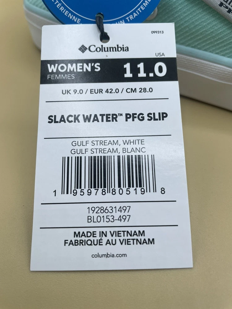 These Columbia Slack Water PFG Slip On Sneakers are women's shoes in size 11 (UK 9, EU 42). They feature a low top style with a multicolor solid pattern and slip-on closure. The shoes are designed for comfort and performance, suitable for casual wear, work, or travel. Made with breathable fabric and a rubber outsole, they are ideal for walking, the beach, and fishing in summer, fall, or spring seasons. The shoes have Columbia branding accents and come without the Original box