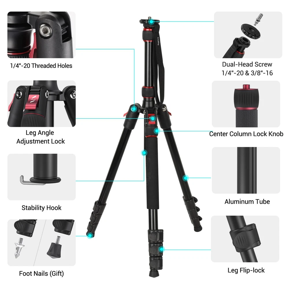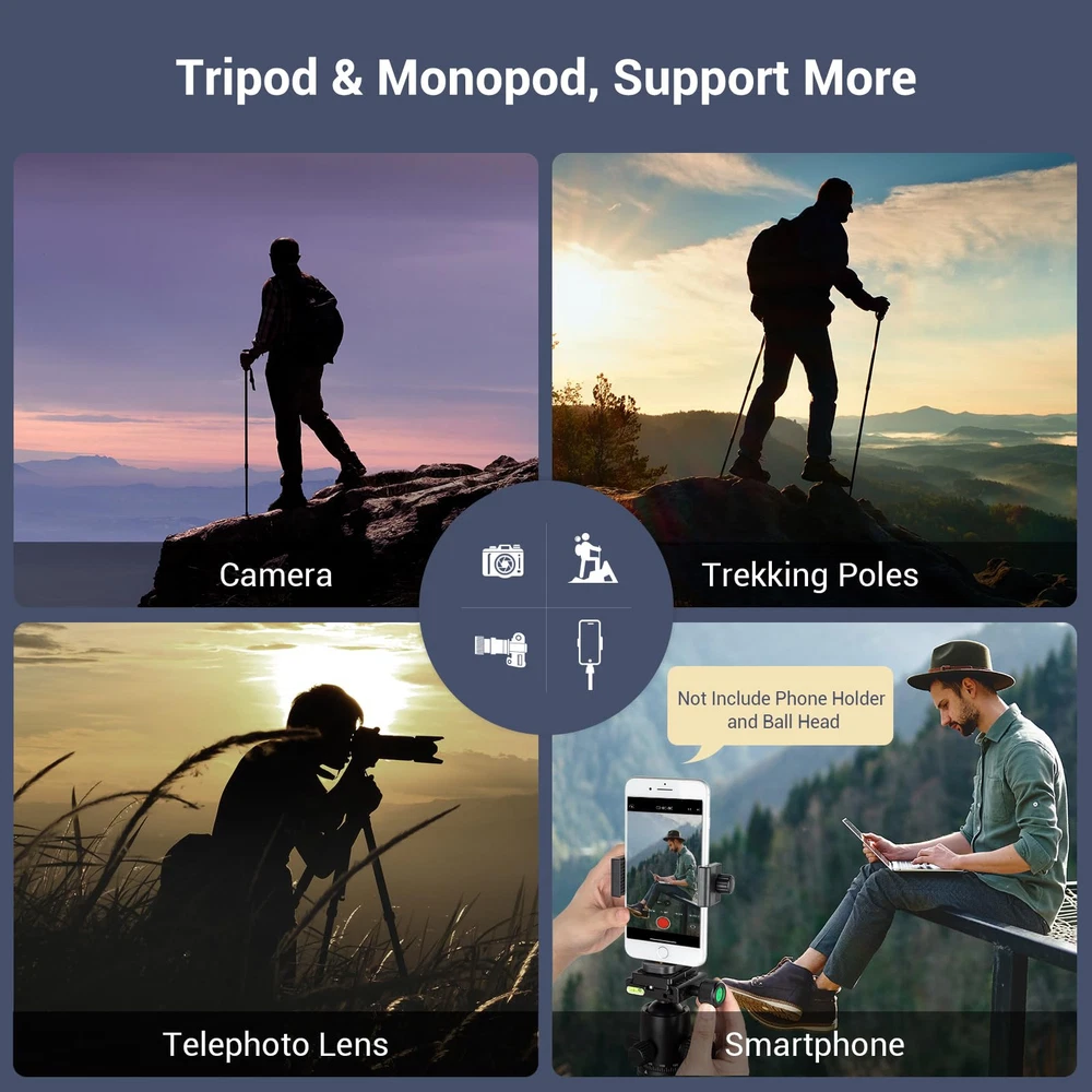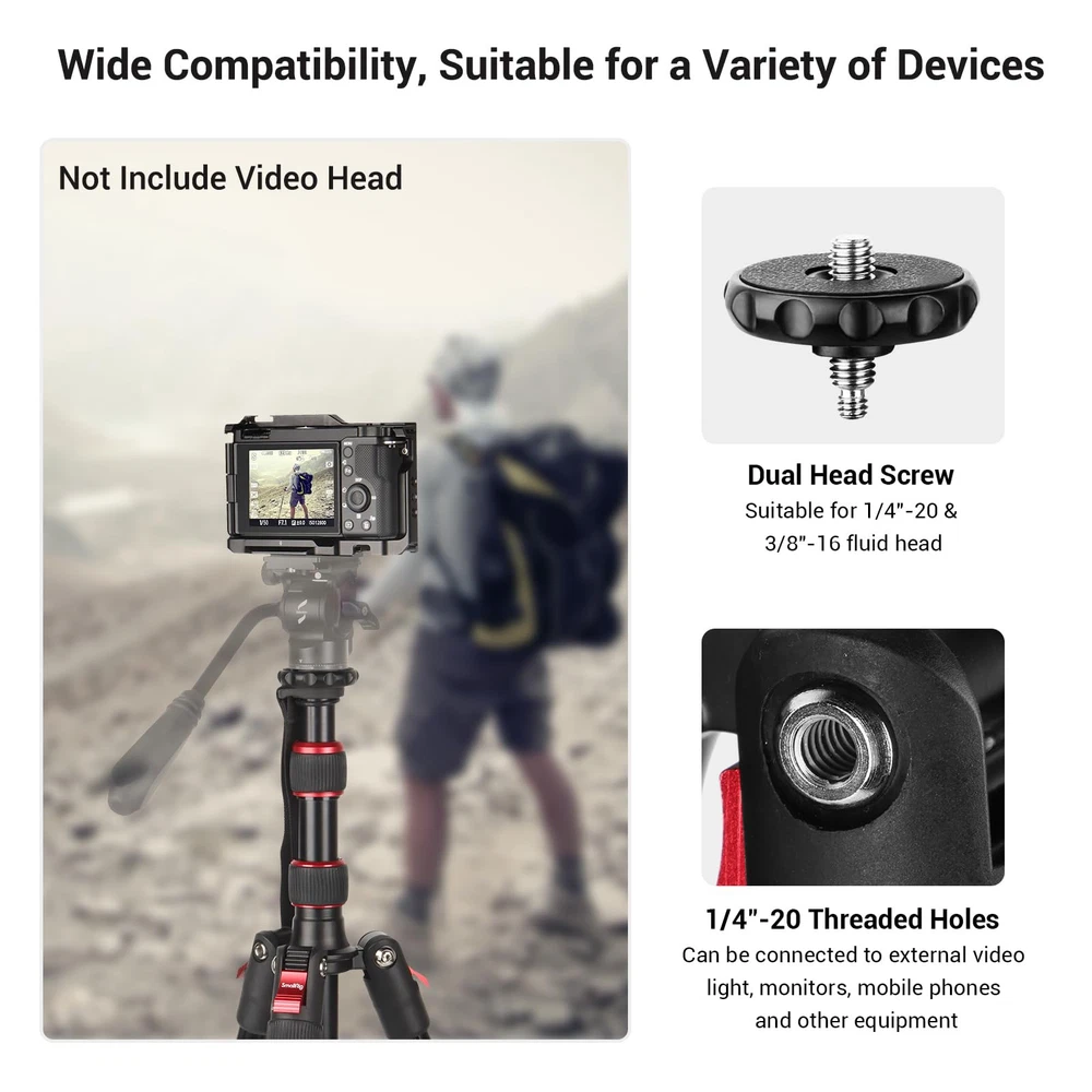 Compatibility: This video tripod for camera is universally compatible with all 1/4"-20 and 3/8" threaded holes video head, after equipped with ball head and quick plate, you can easily use the tripod to support your device such as DSLR, action cameras, mirrorless cameras, cell phones and projectors.【Note】video head and quick release plate are not included, for camera with telephoto zoom lens, you need to buy a tripod mount ring additionally or telephoto lens bracket for better balance. 2-in-1 Tripod & Monopod: The aluminum tripod can be easily turned into a monopod or walking stick, it is a good companion for you to go hiking or traveling. And the central pole can be inverted to allow for low angle shooting and macro photography. Height Adjustble and Innovation Design:The height of tripod is adjustable, 4-section column legs with 3 quick release flip-locks allows you to adjust the working height from 19.7" to 67.7" in seconds, the storage size is 16.14“. Different from other ordinary tripods, this tripod has three 1/4" threaded holes added to the bracket, which can meet the needs of external magic arms, mobile phones, monitors, etc. Note: Please pay attention to the size information to avoid purchasing errors. Lightweight and Easy to Carry: The dslr tripod offers high level of stability using great quality level of magnesium aluminum alloy. It can withstand up to 33 lbs (15 kg). The net weight of the tripod is 2.42 lbs, comes with a carry bag, you can easily take the tripod to anywhere you want to go. This tripod is without head, so it is lighter and not a heavy tripod. You can use it with your own video head as needed. Note: Please pay attention to the weight information to avoid purchasing errors. Package Include: Tripod (without head) *1, Carry Bag*1, Alen Wrench*3, Maunual*1, Stainless Steel Foot Screw*3. Note: Please pay attention to the package contents (only the contents listed above, not including other accessories) to avoid purchasing mistakes.