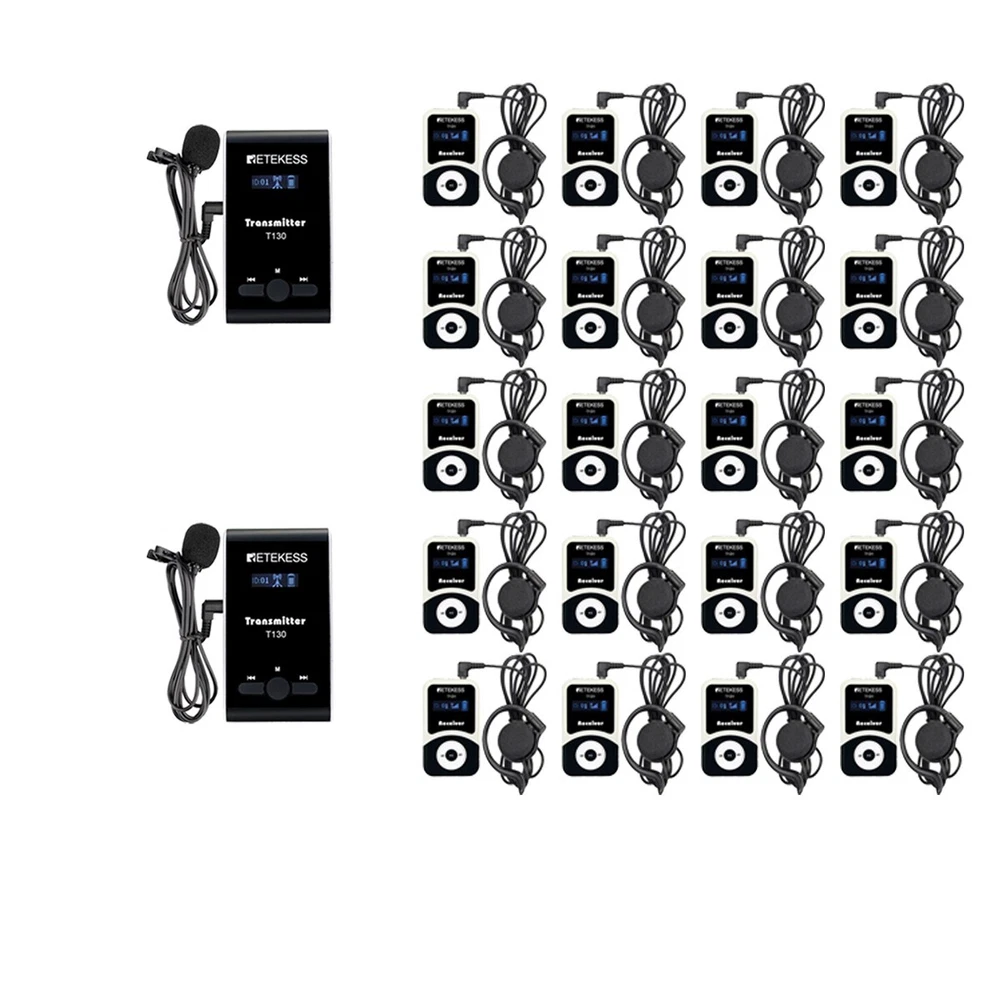 Model TT116T+TT116R TT125 T130S+T131S Product Frequency Range UHF:902-928mhz 2.4 GHz 195-216MHz Transmission distance 200m(Open Area) 150m(Open Area) 120m(Open Area) Standby Time about 10h(Transmitter) about 18h(Transmitter) about 20h(Transmitter) about 13h(Receiver) about 80-100h(Receiver) about 20h(Receiver) Channel number 50 channels 999 channels 49 channels Noise Reduction Technology YES YES NO One-key Pairing YES YES NO One-key Mute YES YES YES Charging Port Type-C Type-C USB Battery Capacity 3.7V 1000mAh 3.7V 3000mAh 3.7V 4200mAh(T)/900mAh(R) Microphone Omnidirectional Omnidirectional / Earphone D-shaped;Suitabel for both ears D-shaped;Suitabel for both ears D-shaped;Suitabel for both ears Size 114.8X54.8X20.6mm(T&R) 114.8X54.8X20.6mm(T&R) 205X60X20mm(T)+73X42X12mm(R) Weight 65g(T)+56g(R) 100g(T&R) 140(T)+45g(R) Tourists hear the clear and smooth sound that the tour guide says in the earphones even when they fall behind. Several groups devices can be used at the same time and the same place, suitable for simultaneous conferences. In a conference, everybody hears clearly wherever you sit. With the interference reduction function, students will hear clear what teacher says even whey they are discussing. Make sure every visitor hear the introduction when the machines are working. The wireless sound system, which works within 60m, enables the pastors to get rid of nasty cables and move freely in the church while speaking. Speakers are easily heard by everyone, even if the audience is kind of far from the speakers. Available for multiple devices used at the same time and the same place, such as multiple languages preaching for different language speakers in a same church. We have two ways to set ID: Wireless ID setting and manual ID setting. W ireless ID setting works better for the occasion that needs many receivers ; Manual ID setting works better for the occasion that needs few receivers . The clear and high-quality sound offers enjoyable listening experiences. Makes a worship or a preaching more immersive and pleasant. Built-in rechargeable lithium battery. The transmitter works for up to 12 hours when fully charged in 4 hours. The receiver works for up to 18 hours when fully charged in 4 hours. These two feature long standby time, readily for a whole-day worship. Stable signal PLL technology for more stable frequency, lower interference noise. Ensures the clear and smooth audio transmission in a worship. The transmitter supports external audio input, such as MP3, smart phone, etc. Connect your phone with the transmitter via the AUX cable, share audios with prayers. LCD display, volume adjustable, battery consumption display, easy to operate. Easy to notice the parameter in dim surroundings. In the audience area, where it is quite dim, the information shown on the led display is clear and perceptual and easy to notice when adjusted. The transmitter and receivers are mini-sized and light. Easily hang on your neck and it doesn ’ t cause neck pain even for a long-time wearing. Wireless Tour Guide System Mic 2 Transmitter 20 Receivers for Church Translation The transmitter with microphone used for Speaker, the receiver with earphone used for Listener. The guide speak to their group at a comfortable conversation speech level, listeners use receivers and lightweight earphones to hear every word clearly and easily, even in noisy surroundings. So listeners don't miss the message, and the presentation doesn't disturb others. Multiple frequencies allow 99 tour groups to operate in the same vicinity simultaneously, with no crosstalk or interference. Features: Portable design, the smallest and lightest PLL synthesized design, with high frequency stability 99 channel: allows 99 groups to operate simultaneously at the same place One transmitter can work with any number of receivers Over 60m(196ft) communicating distances The transmitter supports external audio input, such as MP3, Smartphone Bulit-in rechargeable lithium battery, make sure can use all day long LCD display, volume adjustable, battery consumption display, easy to operate Two way of ID setting: Wireless and Manual. If you have to set the ID for many receivers, the wireless ID setting method is more quickly Applications: Tour guide, Wireless meeting, Wireless teaching, Simultaneous interpreting, Corporate hospitality, Factory tour, Church sermon, etc.. Specification: Transmitter Frequency range 195-230MHz Channel 99 channels Frequency response 50Hz-18000Hz Frequency stability +/-0.005% Modulation deviation +/-75KHz Power supply Built-in 900mAh lithium battery Working hours 12 hours Charge DC 5V 1A, mini USB jack Working distance 60 meters Size 99 x 56 x 14mm / 3.9 x 2.2 x 0.5 in Weight 58g / 0.13lb Receiver Frequency range 195-230MHz Channel 99 channels Frequency response 50Hz-18000Hz Power supply Built-in 600mAh lithium battery Working hours 18 hours Charge DC 5V 1A, mini USB jack Size 72 x 42 x 12mm / 2.8 x 1.6 x 0.5 in Weight 45g / 0.1lb NOTE: The wire of the microphone and earphone has the antenna function, so please unfold the wire to make sure the voice signal transportation when using this system If you never operated this system before or don't know what it is for, we advise you just to buy one set to test this system and completely understand its functions. If you like it after testing, you could buy many sets/units one time Actually depending on the situation. Different environments, different effects, the signal will also be affected, and obstacles will shorten the distance. Package Include: 2 x Wireless transmitter 20 x Wireless receiver 2 x Lavalier microphone 20 x Single earphone 22 x Lanyard 22 x USB charging cable 2 x English manual About Us