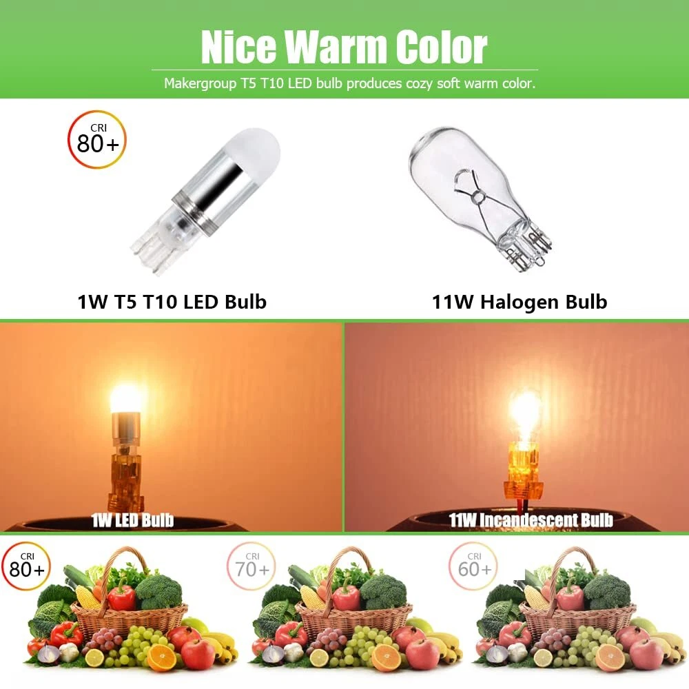 Important Note: This 12V wedge base LED bulb could not with electronic transformer in under counter or cabinet lighting, which might cause flickers. Please kindly check before purchasing. Tips: these LED bulbs are some longer than some old incandescent/halogen wedge bulbs. Please check the measurement on the picture to make sure they are suitable for your fixture. For landscape lighting, the LED bulb is used to replace the T3 T5 T10 921 912 904 194 miniature wedge bulbs. For RV lighting, the LED bulb is used for T10 wedge bulbs , NOT for the automotive T5 Instrument Cluster Gauge Dashboard Indicator lamps . The base is miniature wedge base. Parameters Wattage: 1Watt Lumen output: 100lm Color Temperature: soft warm white 2700K-3000K Color Rendering Index: 82 Low voltage working system: 12AC/DC Base type: Miniature Wedge base Dimmable: No Dimensions: 0.47"(W) x 1.48"(L) Working temperature: -35 to +55°C Long lifespan: Over 25,000 hours Wide applications: landscape Lighting pathway lighting fixtures, step lights etc. Cross Reference: T3 T5 T10 921 912 904 194 1W T5 T10 Wedge Base LED Bulb. It is an ideal bulb for some light fixtures that do not need too much brightness. Wide applications: it can fit numerous 12V low voltage outdoor landscape lighting, step lights, deck lights, driveway lights, path lights, gazebo lights, paver lights and RV Tailer Lighting(for dome lights only). Weather-proof design. It is designed with plastic cover to protect it from moisture and dusts. Energy Saving and Nice Color. 100 Lumen output in 1 Watts. It is equivalent to 7W/11W wedge base bulbs. It produces nice soft warm white color. Easy plug-and-play installation.Note: please check the measurement before purchase.The LED bulb is some longer than some traditional 921, 912, 904 and 194 bulbs. 100% Satisfaction . 30-Day Money back and 1 Year Hassle-Free . If you meet any problem, please feel free to write us an , we would make it right for you quickly.