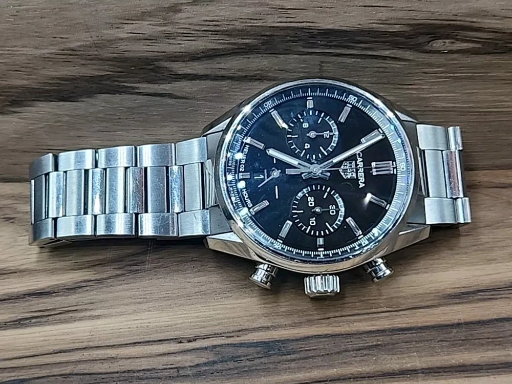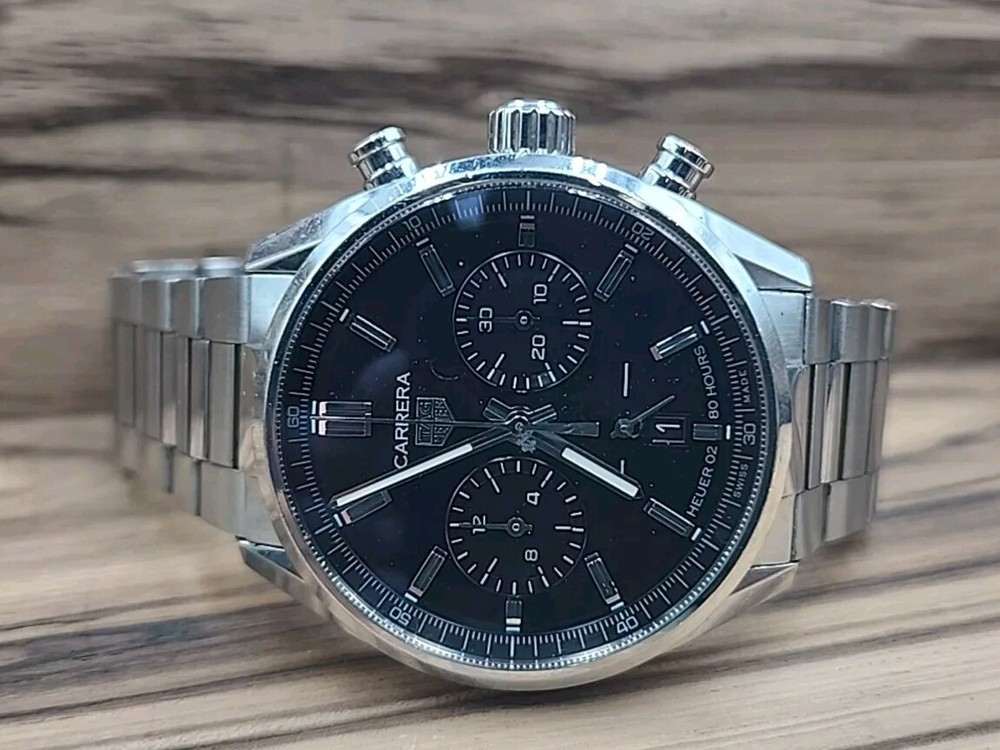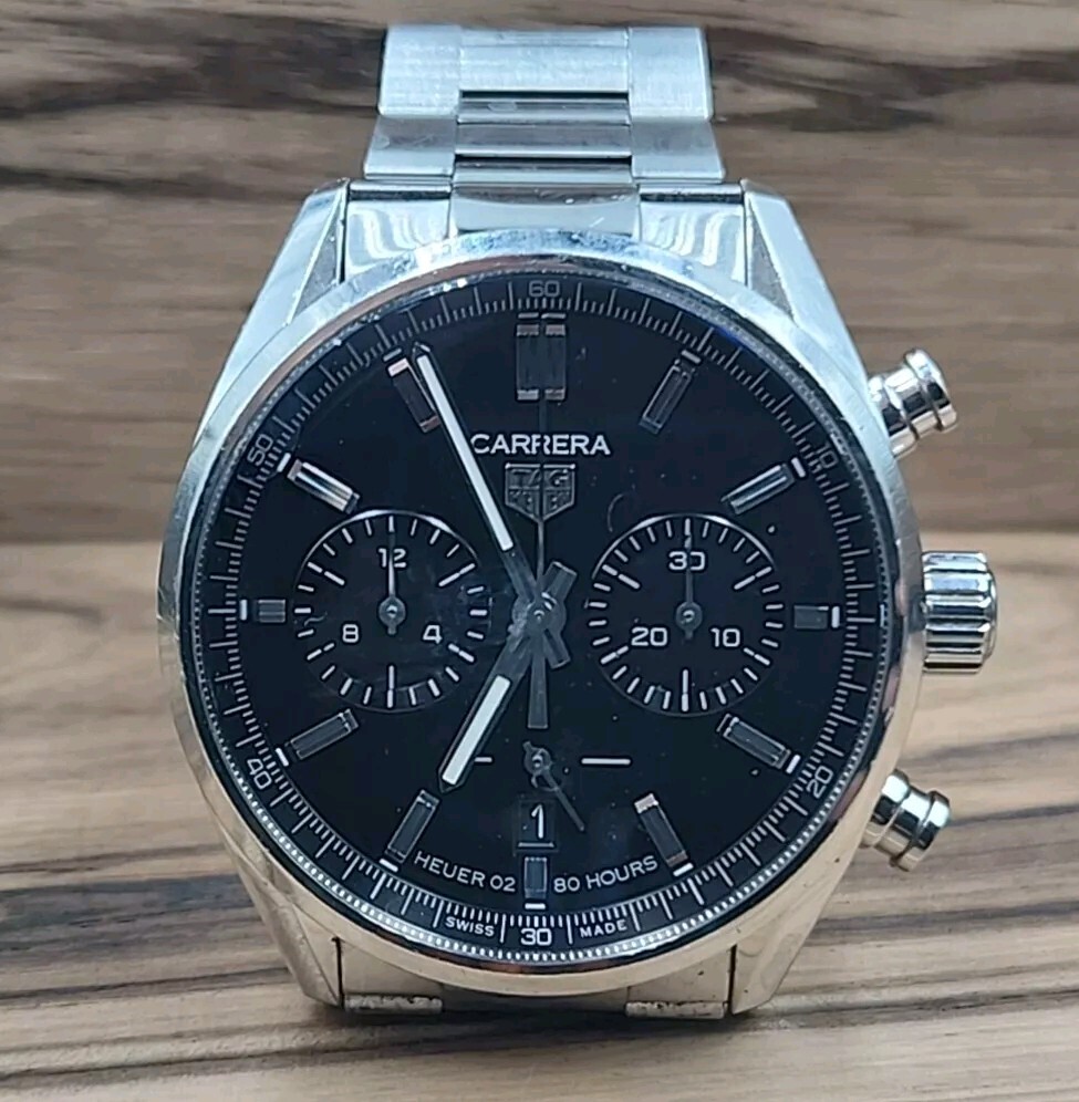 TAG Heuer Carrera Chronograph 42mm Heuer 2 Black Dial 80 Hours Men Watch. Used Condition. It has several scuffs on the watch. Band Size 7.25 or 7.50. Please view pictures to avoid returns. Thank you. ITEM111524PO1250.