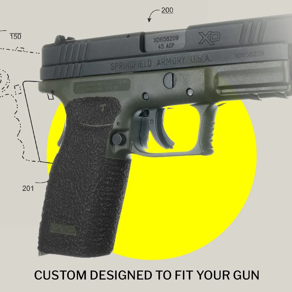 TALON Grips for Full Size Springfield XD 9mm/.357/.40 models with both the 4" and 5" barrels. This rear wrap grip is available in both granulate and rubber textures. This grip has full coverage on the side panels through the thumb rest, logo cutouts on each side, ample coverage on the backstrap and full coverage under the trigger guard. Improved Confidence, Safety & Control: Our stick-on pistol grip creates a functional and positive interface between you and your firearm Faster, More Accurate Follow-Up Shots: Improve your performance with better traction and reduced recoil; at less than 0.5mm thick, our non-slip pistol grips feel natural in your hands and are strong enough for competition US-Patented Gun Grip: Custom designed and manufactured for the Springfield Armory XD Sub-Compact handgun, our 100% USA-made wraparound gun grip offers maximum coverage and an OEM-quality fit and finish Trusted by Pros: Available in rubber or granulate textures, TALON grips are used by law enforcement officers, military personnel, competitive shooters and firearms enthusiasts; in fact, the NTOA has given us a 4.81 rating out of 5 Install in Minutes, Use for Years: Our comfortable black rubber grips last 1-3+ years and are built to enhance the comfort, features and performance of your Springfield firearm; they suit both concealed carry and open holster carry, as well as personal and home defense