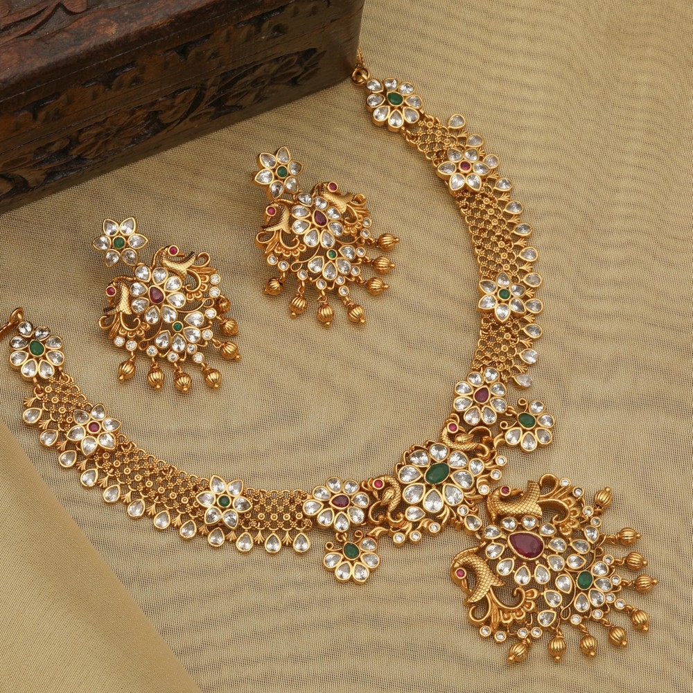 TARINIKA Antique Gold Plated Vira Short Necklace Set with Floral Design - Indian Jewelry Sets for Women | Perfect for Ethnic Occasions | Traditional South Indian Necklace | 1 Year Warranty* Product Details Package Dimensions : 8.78 x 6.61 x 1.54 inches; 9.59 ounces Department : womens Date First Available : May 28, 2021 Manufacturer : TARINIKA Country of Origin : India Brand, Seller, or Collection Name: TARINIKA Metal: gold plated brass Material: Brass Gem Type: Cubic Zirconia Chain: Rope Clasp: Fishhook Clasp Number of stones: 50