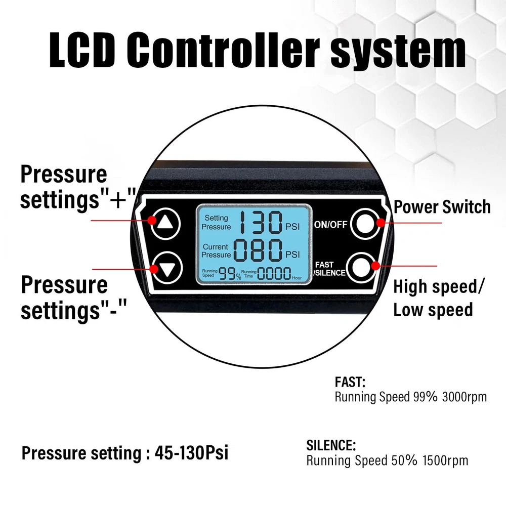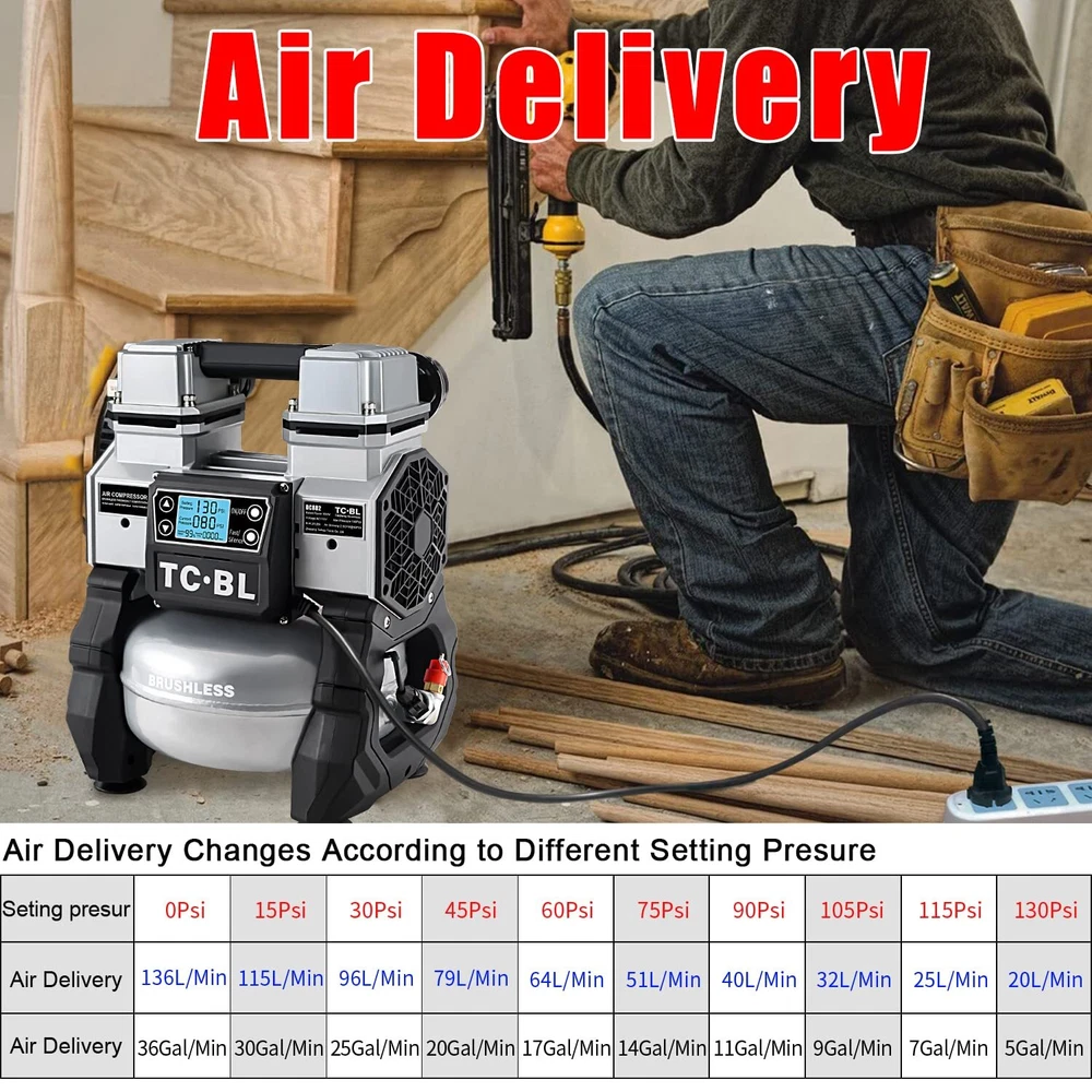 TC·BL Portable Air Compressor,110V Quiet Small Air Compressor,Lightweight and Oil free with 5L Aluminum Tank BRUSHLESS AND OIL FREE MOTOR:More power up to 900 watts, and lifetime maintenance free. PORTABLE AND POWERFUL:The N.W. of the air compressor is only 20LBS,Heavy Duty Double cylinder design,130PSI Max,2.8 SCFM@90PSI allows for quick compressor recovery time. ULTRA QUIET:Oil-free motor for maintenance-free operation,the air compressor has high and low speed mode.Low speed mode is about 60dBA and high speed mode is 75dBA noise,ensure a quiet work setting. INTELLIGENT CONTROL:The air compressor is equipped with a control panel, which can precisely adjust the air pressure. The display shows the real-time air pressure. When the air pressure reaches the set pressure, the machine will automatically stop working. WIDE APPLICATION:This air compressor is widely used in many fields,such as inflation, brad nailing, stapling and air brushing applications. TC·BL Portable Air Compressor DC882 AC110V Oilless,Ultra quiet,Lightweight Shipping We offer FREE shipping on all orders! We use a selection of shipping services such as UPS, FedEx, USPS etc. We only ship to the lower 48 states, no APO/FPO addresses or PO Boxes allowed. Local pickups and combined shipping options are not provided at this time. Return You can return a product for up to 30 days from the date you purchased it. Any product you return must be in the same condition you received it and in the original packaging. Please keep the receipt. Payment We accept payment by any of the following methods: PayPal Please pay as soon as possible after winning an auction, as that will allow us to post your item to you sooner! Feedback Customer satisfaction is very important to us. If you have any problem with your order, please contact us and we will do our best to make you satisfied. Contact Us If you have any queries, please contact us via ebay. We usually respond within 24 hours on weekdays. Please visit our eBay store to check out other items for sale! Thank you for shopping at our store.