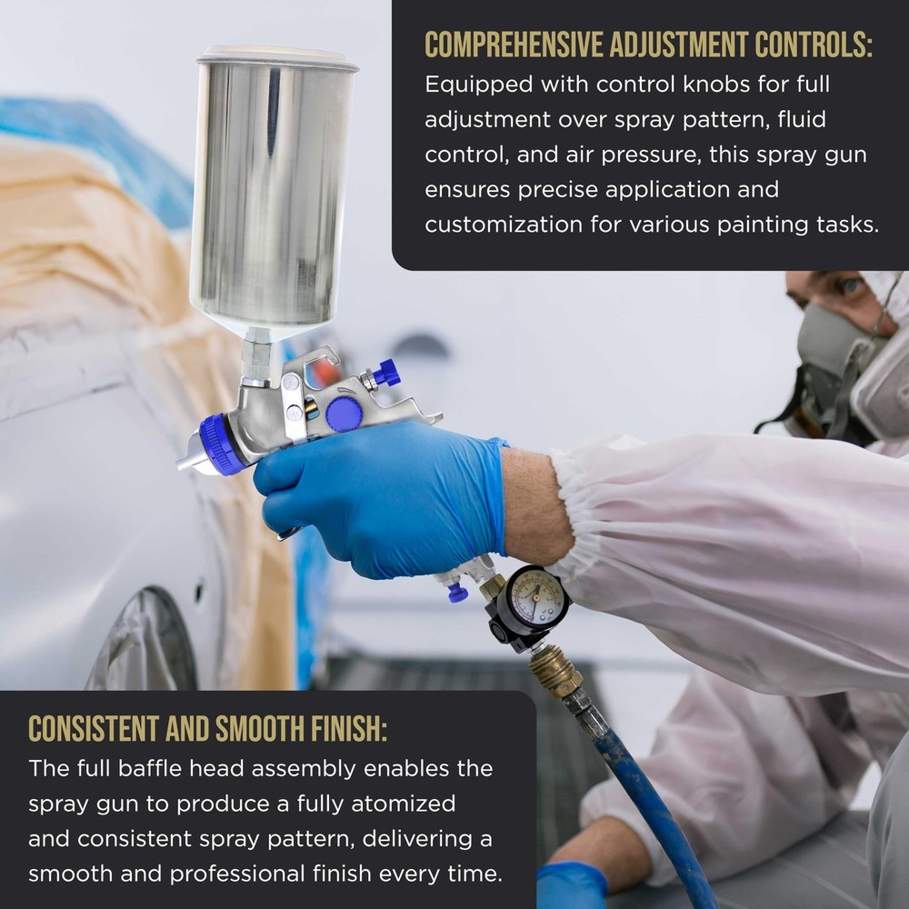 Elevate your automotive painting projects with our Professional HVLP Spray Gun, the ultimate tool for achieving flawless finishes on vehicles. This premium gravity feed paint gun for cars delivers exceptional atomization for basecoats, clearcoats, primers, and single-stage paints, ensuring professional results every time. Designed for both professionals and enthusiasts, this automotive paint sprayer features precise control systems that allow you to customize your spray pattern, fluid flow, and air pressure for perfect application on any surface. The full baffle head assembly guarantees even coverage and eliminates common issues like orange peel or uneven application. The durable aluminum construction and generous 1-liter cup capacity make this auto paint gun ideal for extended projects without frequent refills. Its gravity feed design maximizes paint transfer efficiency, reducing waste and saving you money on materials. Compatible with standard air compressor systems, this hvlp gun kit provides the perfect balance of air consumption and atomization power. Whether you're refreshing a single panel or repainting an entire vehicle, this spray gun for painting cars delivers consistent, professional results. Experience the difference a quality automotive paint gun makes in your finishing work. From small touch-ups to complete auto paint jobs, our spray paint gun for cars provides the control and performance you need for showroom-quality results. Professional Performance: High-performance car paint spray gun with 1.8mm fluid tip; Perfect for basecoat, clearcoat, primer, and single stage materials; Delivers optimal atomization for automotive paint projects; Ideal for car painting enthusiasts Complete Control System: Precision adjustment knobs for spray pattern, fluid flow, and air pressure; Complete customization for any paint gun automotive project; Air spray paint gun designed for professional-grade results; Easy to use controls Superior Finish Quality: Full baffle head assembly ensures even spray patterns; Creates showroom-quality shine with this spray gun for painting cars; Air paint sprayer gun perfect for professional automotive painting Durable Construction: Large 1-liter aluminum cup reduces refill frequency; Sprayer built for long-lasting performance; Gravity feed spray gun design maximizes paint transfer efficiency; Automotive paint gun ideal for auto paint applications Versatile Application: Perfect hvlp spray gun kit for professionals and DIY enthusiasts; Works with various automotive paint types; Car spray gun set delivers smooth finishes on all vehicle surfaces; Compatible with standard air compressor systems