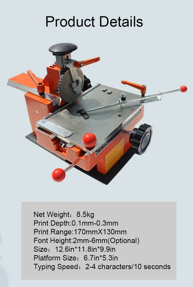 4mm Semi-automatic Plate Embossing Nameplate Marking Machine with Fixture Scope of Application: This semi-automatic sheet emboss on all types of aluminum, copper, stainless steel, plastic tag for mechanical, electrical, pumps, valves, automobiles, motorcycles, electrical appliances. It embosses variable parameters: such as dog tag, specific model, date, batch number, serial number, serial number and so on. How to use: 1. How to place the nameplate: Place the nameplate on the upper left corner of the workbench, and fix it with a nameplate clamp or magnetic steel so that the nameplate is not loose. 2. The loading and unloading of the letter wheel: Turn the handle and open the pressing plate to quickly replace the letter wheel. 3. Printing and starting position adjustment: first measure the row spacing position of the nameplate with a steel ruler, then place the nameplate on the upper left corner of the workbench, adjust the fixed fixture, switch the clutch switch handle (disconnected state), and coordinate the rotation of the row spacing handwheel and Move the hand wheel on the table, move the longitudinal head to the printing starting position (the scale wheel shows the position of the line spacing), lightly lock the line spacing handle, switch the clutch handle, press the feed handle, and turn the word spacing handwheel at the same time, adjust the self-spacing, and rotate the characters The code wheel aligns the characters to be printed with the concave notch, taps the rubber head with the palm to type a character, presses the feed handle, moves one grid, and achieves continuous printing with the same action operation. Notice: 1.Font size: 2 mm,3mm, 4mm, 5mm, 6mm(This item Font size is 4MM,if you need other size,please tell us) 2.The external force (hand pressure or a rubber hammer) will emboss letters or numbers on the metal plate with a certain depth (0.1 ~ 0.3mm deep). Its stepless adjustment agent will adjust the embosser position, word spacing, and line spacing. The character heights can be adjusted by changing different. Different letters and numbers can be easily changed by turning around the plate. 3.Maximum label size: 170*130mm(Tie rod clamps can only be used within the specifications of the square nameplate <100mm*50mm, and other specifications should be fixed with magnetic steel.) 4.Print characters: uppercase letters, digits, and simple symbols 5.Print speed: about 2-4 characters / 10 seconds 6.Printing content including: A B C D E F G H I J K L M N O P Q R S T UV W X Y Z? 123456789 . x / - Item Included: Item# Description QTY Unit Note 211001 4mm Semi-automatic Plate Embossing Nameplate Marking Machine with Fixture 1 set This item Font size is 4MM Shipping & Handling Details Default Shipping Cost or Free Shipping Information: ▲ Default shipping cost or free shipping service is only for the customers from Canada or the lower 48 United States by Canada Post, USPS or the UPS Ground. Customers from other areas or needs other shipping ways, please contact us. ▲ Buyers from Guam, Puerto Rico, Virgin Islands, American Samoa, Alaska, Hawaii, PO Boxes, APO/FPO addresses or other countries/areas, there WILL be extra shipping costs, please contact us for more detailed information. ▲ Please make sure your address is valid for both UPS and USPS services. Any costs incurred because of incorrect or undeliverable address should be undertaken by buyer. Handling Time: Shipping is usually made in 1-3 business days after payments cleared. Orders are processed from Monday-Friday; Not on the weekends & public holidays. Sales tax / Customs duties: Any sales taxes or Customs duties are not included. If came out, they must be undertaken by the buyer. Damage In Shipping: Email or call us First! We will work with you to get the case resolved in the fastest method. Return / Refund If you are not 100% happy with your purchase, please contact Us. Please don't directly opened a request or case without informing us, or else, we will do some discounts on the warranty and other sales-services later on. Hope for your understanding. Returns & Exchanges ▲ All returns must be made within 30 days of delivery date. Items must be in new, unused condition, with all original materials included with the shipment. A partial refund may be applied for opened or damaged items, depending on the condition. ▲ Items returned under the buyer’s remorse: The return shipping fee must be covered by the buyer; The original shipping cost will also be deducted from the refund. 15% restocking fee of the items purchase price will be charged. ▲ Returns that are the result of our seller's error: Buyer will receive a full refund of the item as well as shipping charges ▲ All returns require a RA (Return Authorization) number that will be given by our seller. Please contact with us at first for more details. Defective & Damaged Products ▲ If product was received damaged or not as described, please send us some pictures or videos, so we could well understand your problem, then solve them for you ASAP. Besides, it's much helpful for us to claim with UPS, remind our related department to pay much more attention to packaging later on. Hope for your understanding. ▲ Replacement or refund of defective or damaged products can only be returned in exchange for the exact same product, or else, the purchase price will be refunded back to your original payment method. ▲ If an item is received damaged, customer service must be contacted within 7 days of receiving your item. All returns require a RA (Return Authorization) number as above. Payment eCheck Issues: Payments via eCheck do not clear immediately. Usually you will wait 5-7 days after checkout for it to clear. Then we will arrange shipments for you. Warranty & Feedback ▲ 6 months' warranty for the machines, not for the consumables. We stand behind our products all the item, so even if your warranty period has expired, you can still seek for service or technical support f
