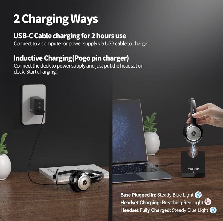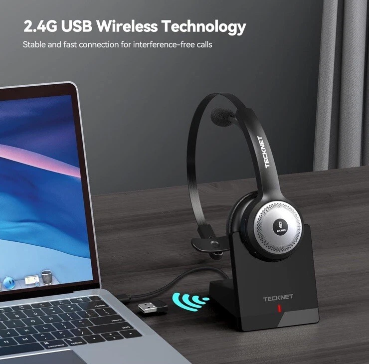 AI Noise Cancellation and Silence: TECKNET Bluetooth headphones with AI noise-canceling microphone effectively block 99.8% of background noise, ensuring a clear voice transmission without discomfort. The wireless headphones with microphone for working on the cell phone have an instant silence function that can be easily activated during conversations with the cell phone, making it ideal for private discussions or eliminating unwanted noise. NOTE: If a non-mobile phone device is connected, (such as the computer), the mute button does not work Dual connection and wide compatibility: Bluetooth 5.0 headset with microphone for PC quickly connect to multiple devices and switch seamlessly between computer meetings and incoming calls for an efficient life and work. Even on devices that lack Bluetooth, use a USB adapter for faster pairing and stable connectivity. (Notice: The USB adapter has priority connectivity, if you connect USB and connect via Bluetooth at the same time on a device, the device will select the USB connection 33ft/32.8 ft working range: Use this wireless headset with microphone to work and enjoy its impressive 49-foot range, seamlessly connecting to your computer, PC, tablet or cell phone. Ensure optimal connectivity by maintaining an open distance between the USB wireless headphones and your device, since obstacles can interfere with connection stability, and too many wireless devices around the device will also affect the connection, it is recommended to change the environment to test Adjustable headband and flexible microphone: TECKNET is always designed for comfortable use throughout the day, wireless headphones with microphone have an adjustable and elastic headband to fit both children and adults (not comfortable for larger head sizes). The wireless headset with microphone for work offers flexible microphone positioning, ensuring the perfect position for optimal voice clarity during calls. Note: the microphone is at least 3.9 in away from the mouth. Too close will result in an unclear sound Long-lasting battery with charging base: Bluetooth headphones with microphone for PC come with a plug-and-play charging base, which offers convenient charging and storage support, you can also directly use the USB-C cable to charge (included). Just 2 hours of charging provides up to 40 hours of working time and 400 hours of standby time for computer headsets with microphone. During emergency charging, the base can increase your device by 30% in 30 minutes. Notice: not compatible for use while charging Warning: TECKNET Bluetooth headphones with microphone with ambient noise cancellation are not suitable for studio recording and regular call recording, as their AI noise cancellation is limited to eliminating ambient noise in the vicinity of the caller during the call and transmitting clear human voice to the other party. When the device records a call, there will be noise in the recorded audio because the device does not have an ambient noise reduction chip