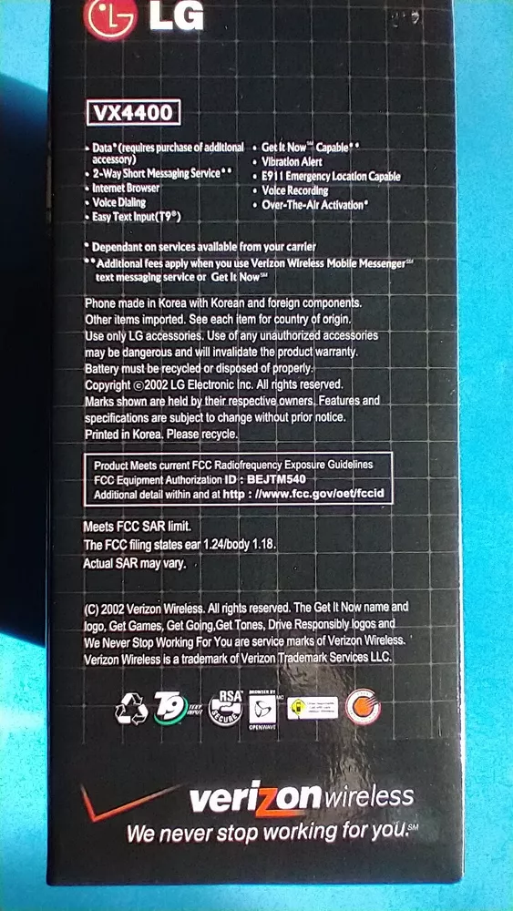 This listing is for a LG flip phone Model VX4400 of which I am the original owner. The phone has been tested and operates perfectly. The main reason for this listing is the original pristine box, original pristine user guide and functional charging cradle and charger. I am including the phone in this listing because someone may have a case with an inoperative phone and swap cases since this phone works fine. In addition to the phone the following items are included in the sale: (1) Original box (2) Original charger with cradle (3) Original user guide (4) Two batteries (5) Original belt clip(broken hinge) Although the phone has been used and has numerous signs of wear mostly worn paint and small dents in the front left corner and on the face (photos 16 and 17) it operated perfectly when last used. I have not been able to make a call with it recently because it is 2G. In addition, the original belt clamp has a broken hinge, shown in photo 18. As shown in photos (5&7) the battery is fully charged but it may not last long. This phone is primarily for collectors and not able to make calls because it is for a 2G system. Shipping will be by USPS Ground Advantage. Please ask questions prior to purchase. Thanks for looking.