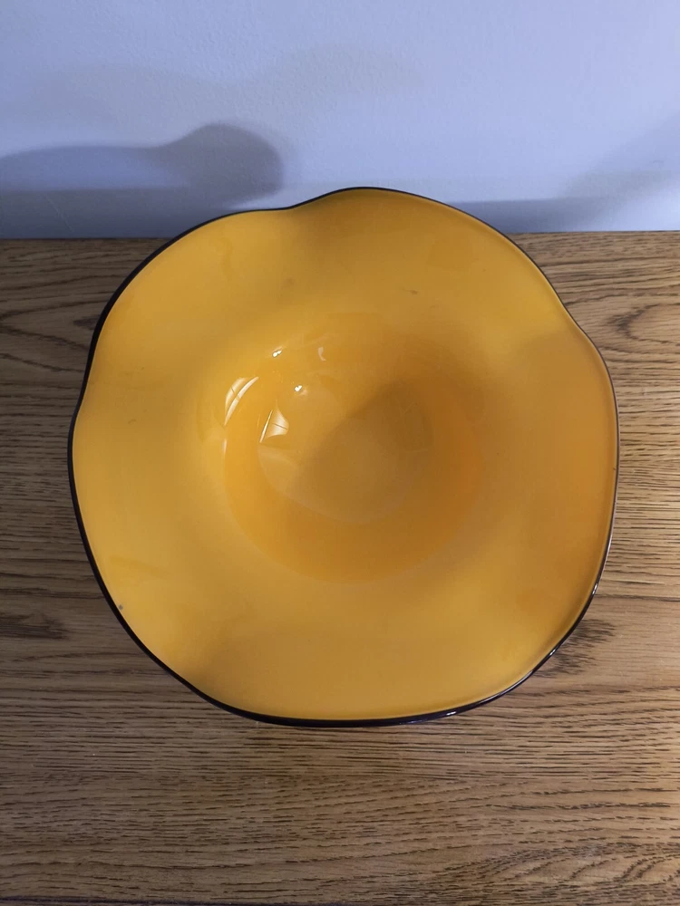 Add a splash of vintage charm to your home decor with this stunning TELEFLORA Ruffled Tango Art Glass Pedestal Bowl. The vibrant orange color of the bowl will add a pop of color to any table setting. Crafted from high-quality glass, this bowl is perfect for serving fruits, salads, or snacks. Item has been housed in a glass cabinet since purchase. The intricate ruffled design of the bowl is a beautiful addition to its vintage charm. This bowl is perfect for those who appreciate the unique and beautiful things in life. It is a great addition to any collection or as a standalone piece.