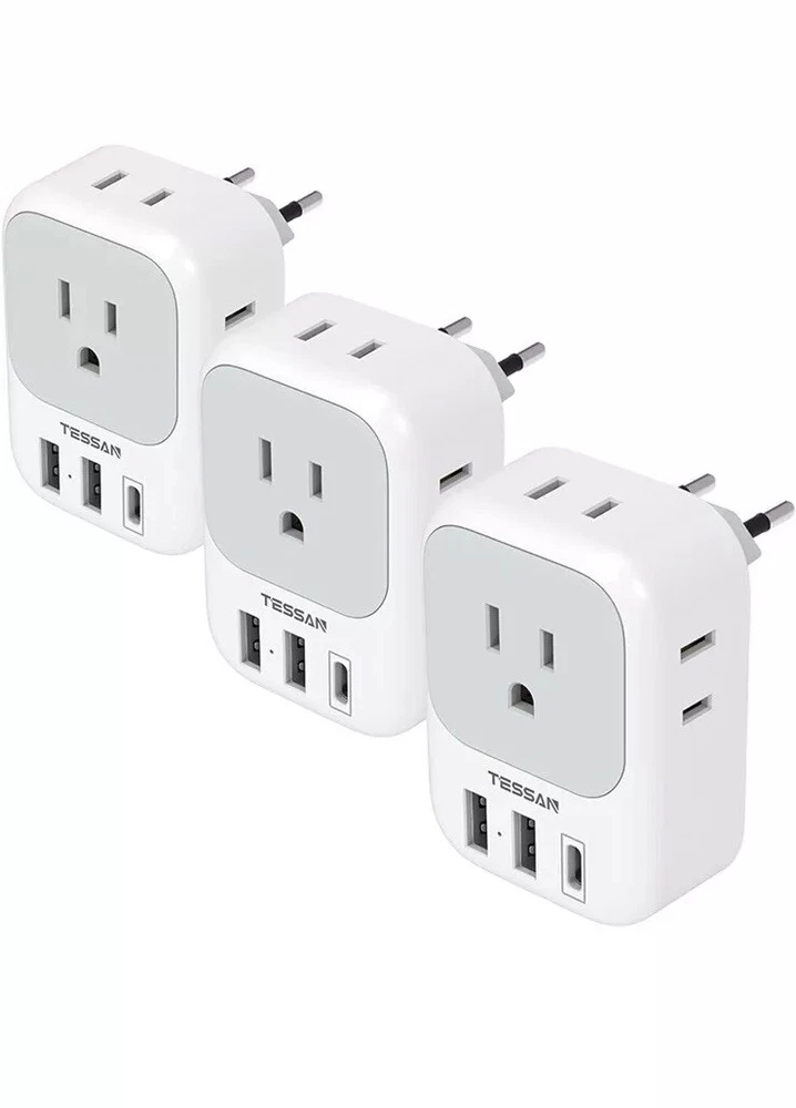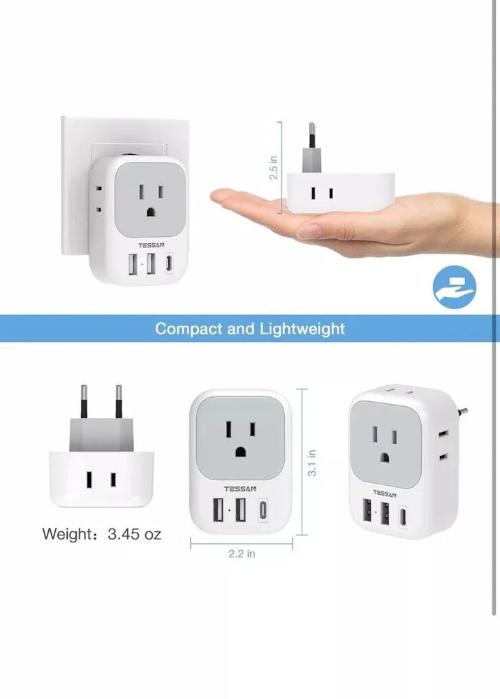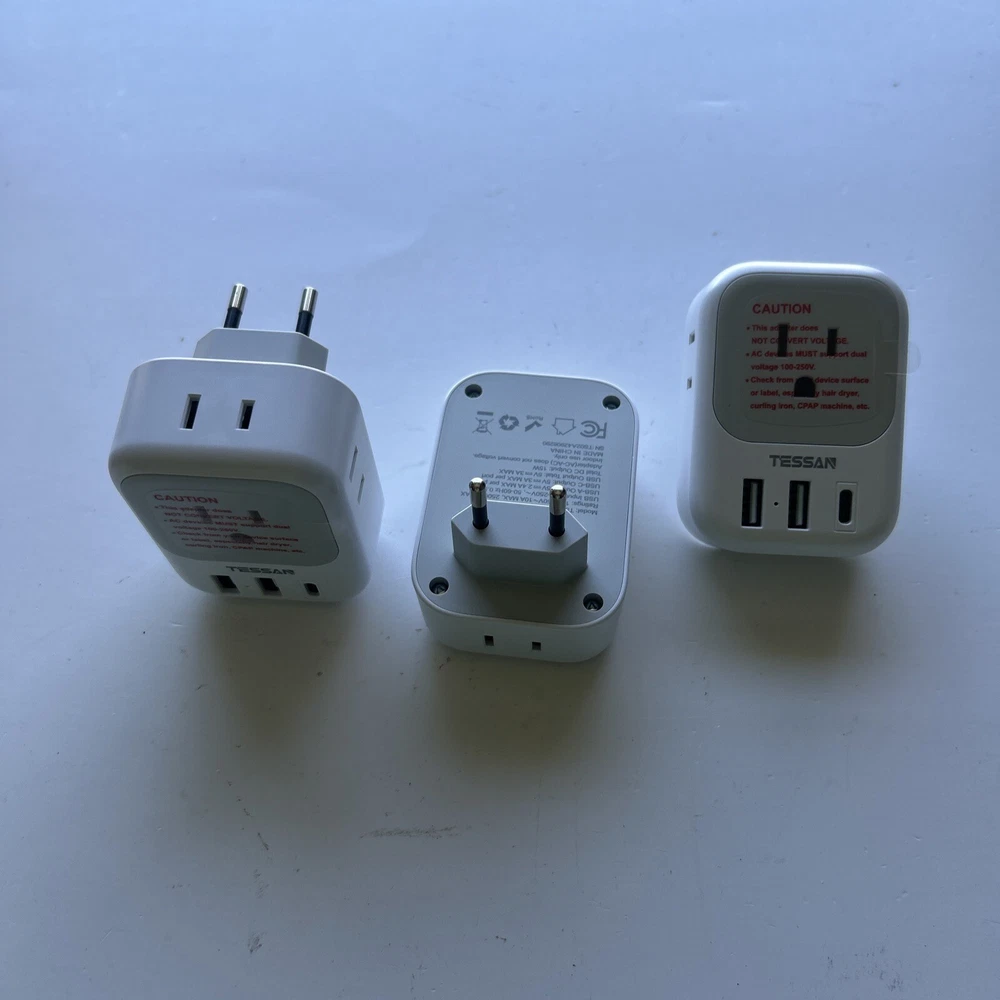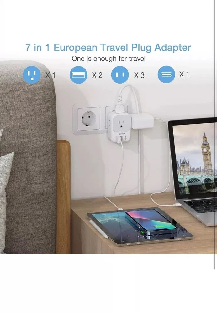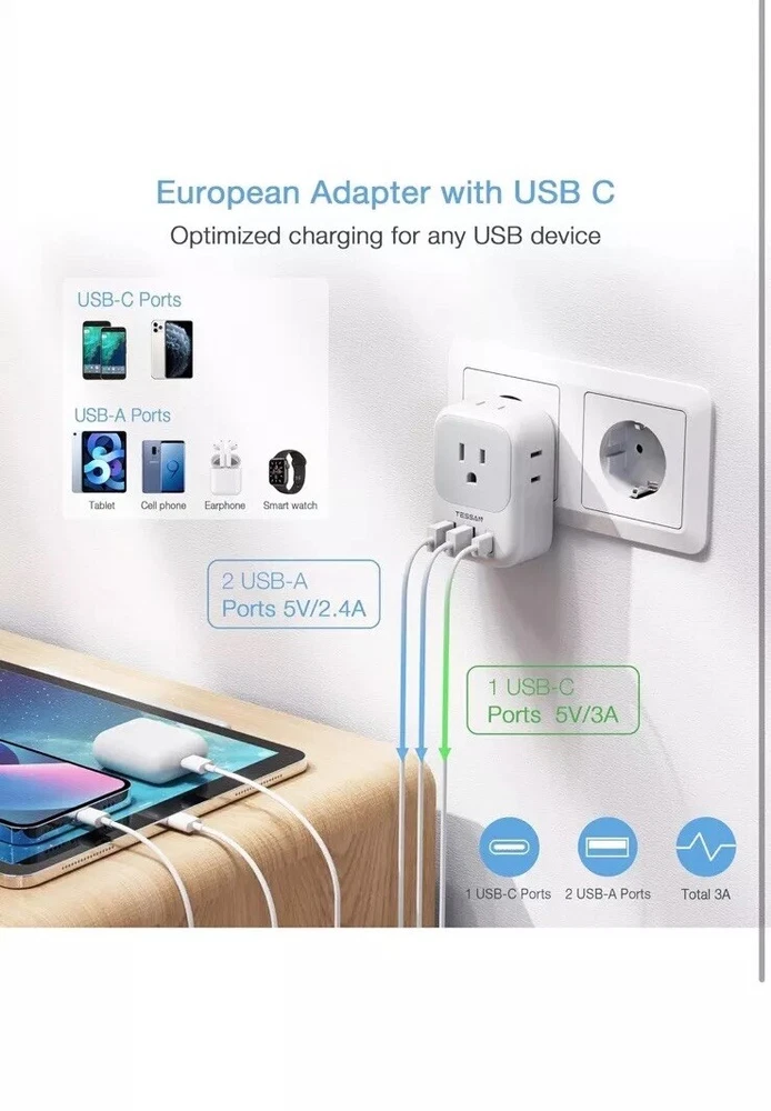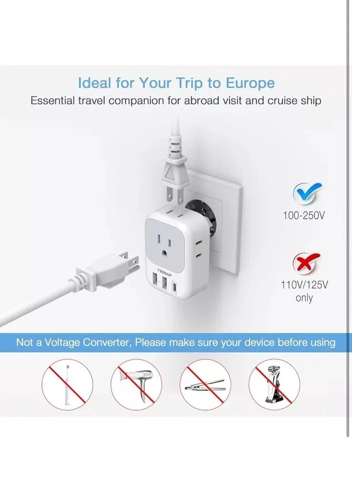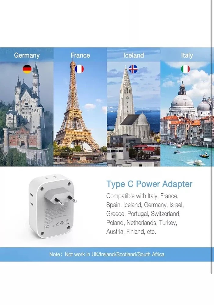 Open box New item! European Plug Adapter: Compatible in most European countries such as Portugal, Poland, Netherlands, France, Germany, Greece, Hungary, Spain, Turkey, Italy, Austria, Belgium, Croatia, Denmark,etc; Ideal for traveler, business man and foreign student; NOTE: Not work in UK/ Ireland/ Scotland 7 in 1 US to Europe plug adapter: It turns 1 European Type C socket into 4 American outlets and 3 USB ports(1 USB C) ; 4-side design can charge 7 devices at a time without blocking; You can charge devices with it anywhere like airports, hotels, office and dorm room European Power Adapter USB C: Dual USB A ports can charge up to 2.4A, and the USB C port can charge up to 3A; Ideal for cell phone, tablet, laptop, earphone, etc; Note: The UCB-C port is not Quick Charger 3.0, doesn't support any other devices which need 9~22V charging voltage Compact Size: With only 3.45 oz lightweight design, portable size allows this Adapters for Europe easily putting in your pocket even for 3 packs, effectively saving the space of your suitcase, backpack and handbag; No surge protection, no cords, making it fully cruise ship approved NOTE: This Type C Plug Adapter only works on 100V to 250V wide voltage devices. If you want to use your hair dryer, straightener or curling irons, they need to support wide voltage, or you may need a power voltage converter