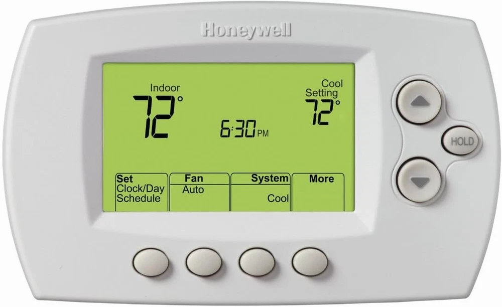 Wireless programmable thermostat powered by RedLink No need to run additional wiring Horizontal mounting design 5-1-1 Programming - Programming for the weekdays, Saturday and Sunday 5-2 Programming - Programming for weekdays and weekends Can display outdoor temperature and humidity Dual Fuel enabled - requires THM5320R1000 Equipment Interface Module and C7089R1013 Wireless Outdoor Sensor (sold separately) Requires (TrueZONE system - not included): HZ432 or HZ322 TrueZONE panel; THM4000R1000 Wireless Adapter Requires (Non-zoned system - not included): THM5320R1000 Equipment Interface Module 1 year battery life and 2 month low battery warning Product Description Honeywell TH6320R1004 Wireless FocusPro Thermostat From the Manufacturer Wireless Programmable FocusPRO, Stages Heat Up to 3 Heat Pump or 2 Conventional, Stages Cool 2, Temp Settings per Day 4, Programs per Week 5-1-1 or 5-2, Color White, Display Digital, For Use With Heating, Cooling Systems Enabled with RedLink Zoning Panels, Includes (3RCN4) Thermostat and, (2) AA Thermostat Batteries