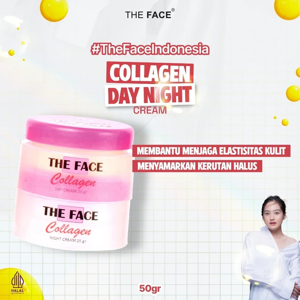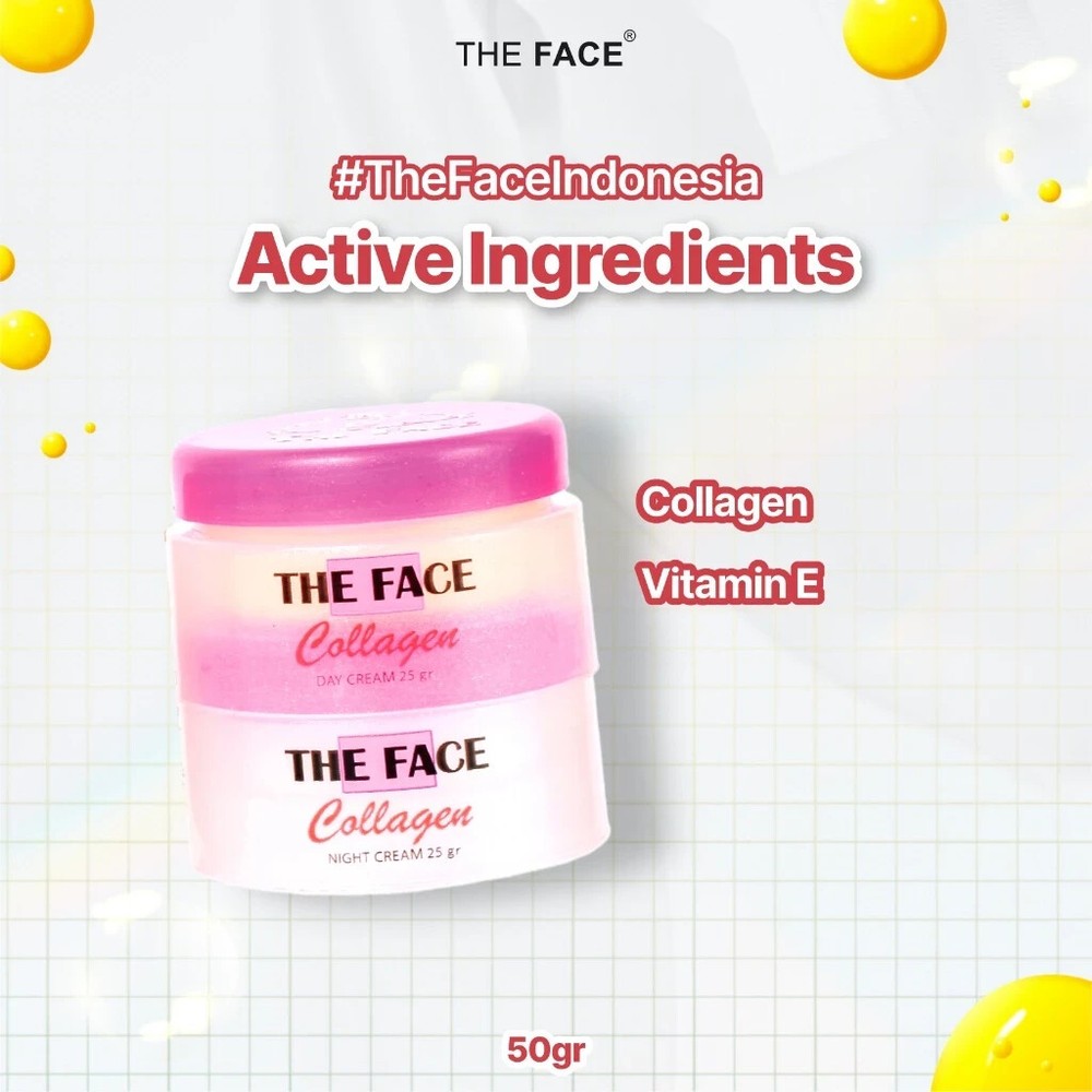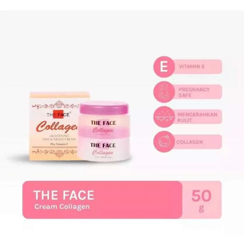 THE FACE Collagen Day & Night Cream Set 50gr THE FACE Collagen Day & Night Cream Set 50gr has several ingredients that can help care for your skin including: - Collagen: Helps maintain skin elasticity and makes skin look firmer and more supple, in addition it can help reduce wrinkles and fine lines, and can help speed up the skin healing process and help maintain skin structure and strength - Vitamin E: As an antioxidant that can protect the skin from free radicals produced from UV exposure, Helps maintain skin moisture and helps prevent wrinkles and fine lines THE FACE Lightening Night Cream Collagen Plus Vitamin E is a soft, moisturizing cream with Lightening content as well as Collagen and Vitamin E which are known to help maintain skin elasticity, disguise fine wrinkles so that the skin looks young, bright, soft, smooth and healthy. How to Use: Apply gently and evenly at night before going to bed. NKIT190001186