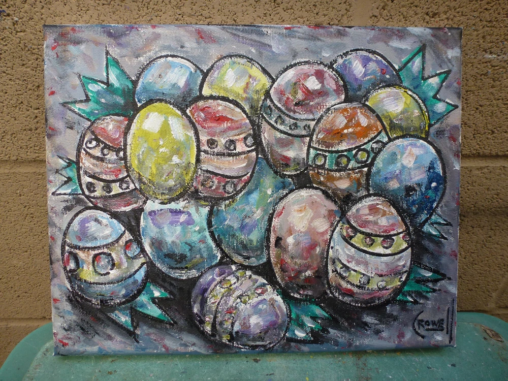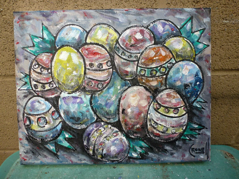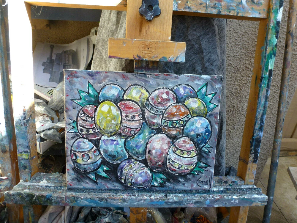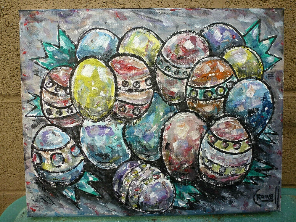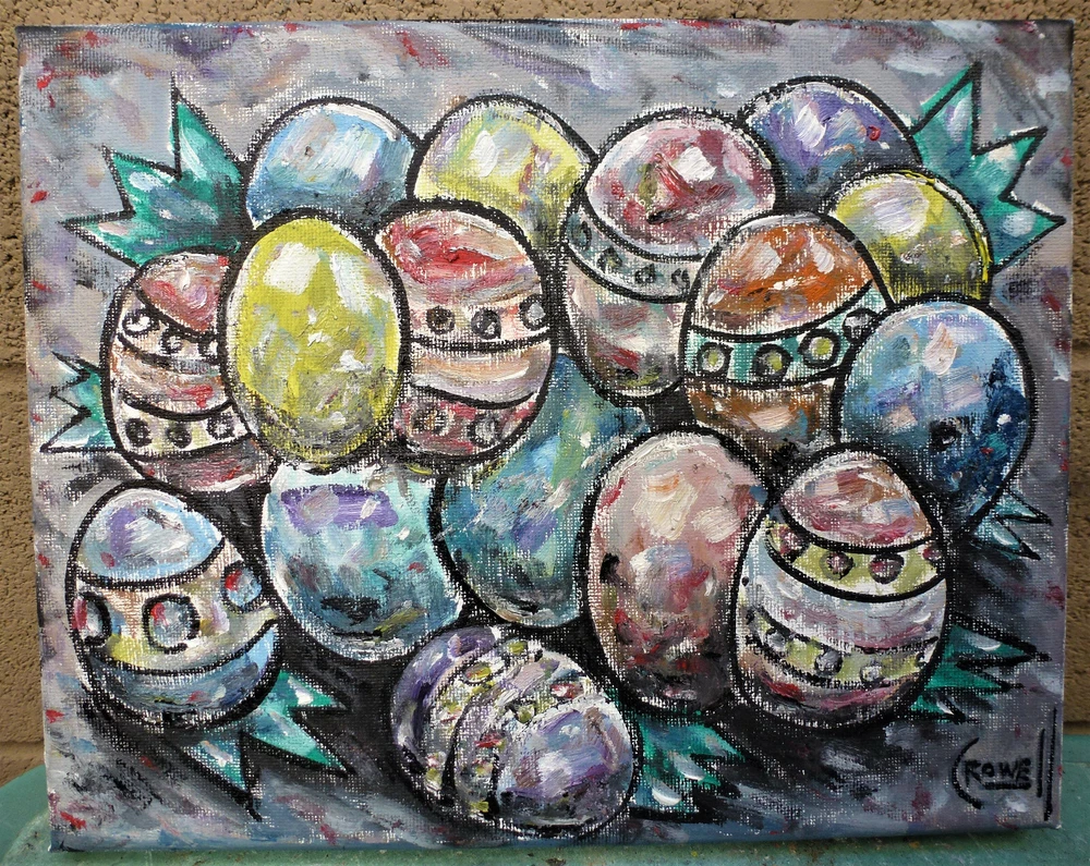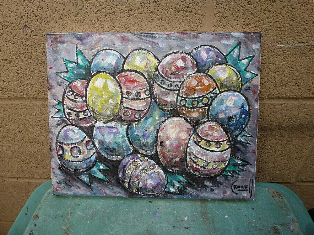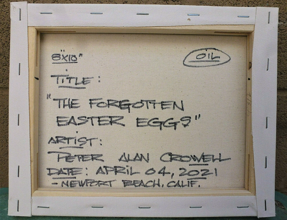 title: " THE FORGOTTEN EASTER EGGS ", a NEW, original oil painting , created on 04-04-2021, this item is Brand NEW, 100% Perfect condition, original 8x10 canvas oil painting signed by California Peter Alan Crowell. signed on front and back. Shipped with USPS First Class mail. I have sold thousands of oil painting Art pieces. since 1993. a signed COA is included with your purchase, for future investment value. Please note; This title, and IMAGE copyrighted 2021 by Artist Peter Alan Crowell, all rights reserved.