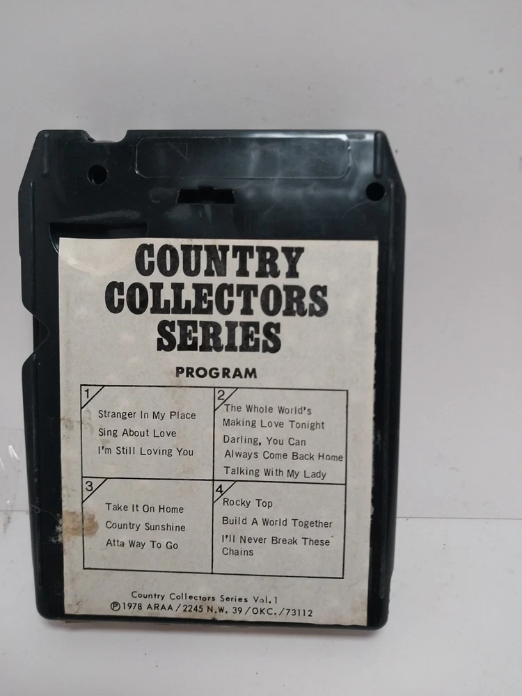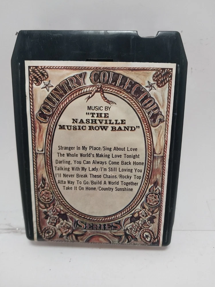 This is a country music collection titled "\"THE NASHVILLE MUSIC ROW BAND\" Country Collectors Series Vol.1 1978. It is in 8-Track Cartridge format and features various artists performing a range of country music styles such as Nashville Sound, Cowboy Country, and Gospel. The album includes songs from different years and has a special attribute related to Charlie Rich.