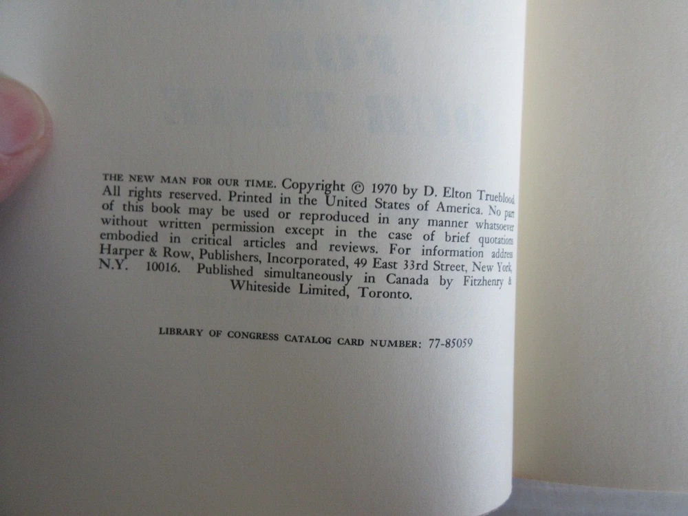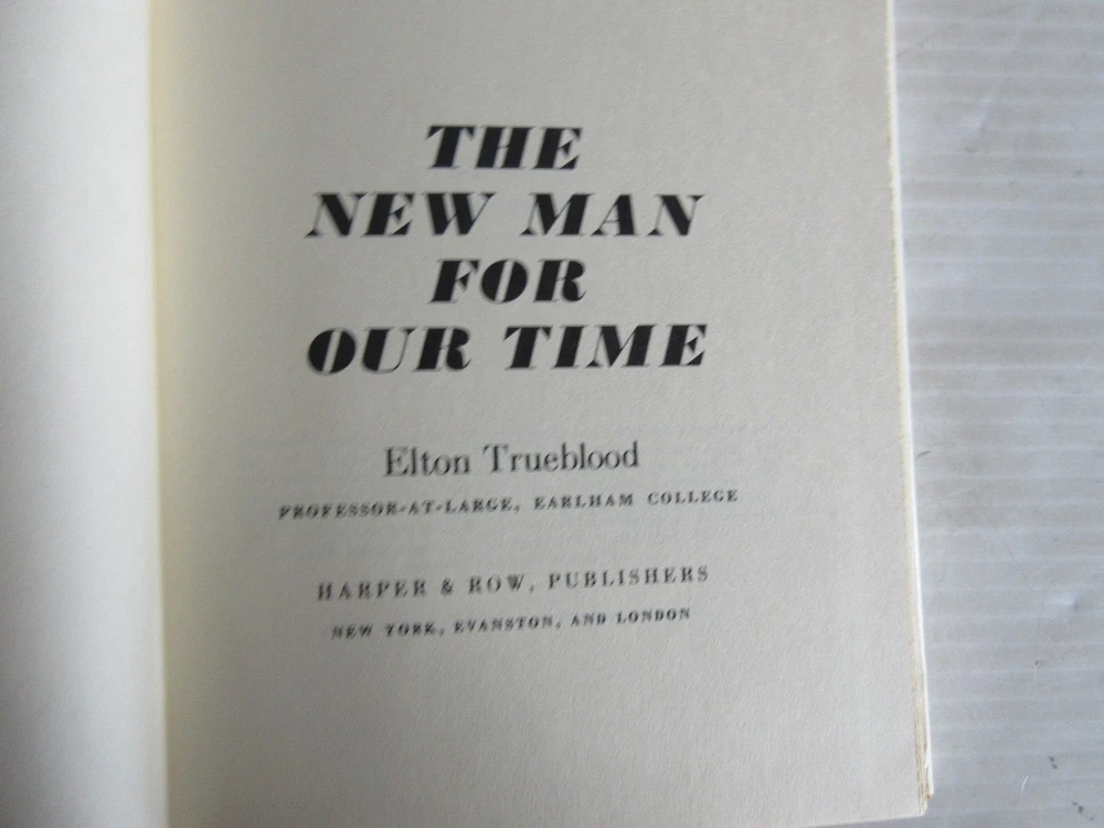 THE NEW MAN FOR OUR TIME BY ELTON TRUEBLOOD 1970 Thank you for viewing our auction. Excellent Item to add to your collection. Here is your chance to increase your book collection with a book titled THE NEW MAN FOR OUR TIME BY ELTON TRUEBLOOD 1970 . This is the item you will be receiving. The book is approximately 8 1/4 inches by 5 1/2 inches. Please let me know if you have any questions. Happy Bidding Joe # 25728