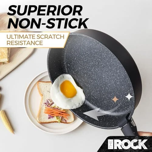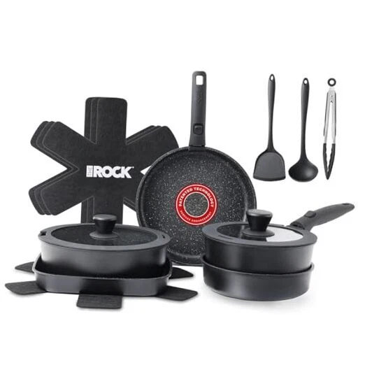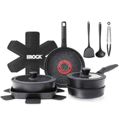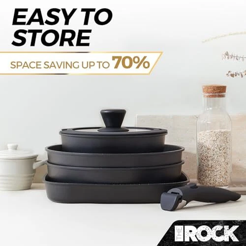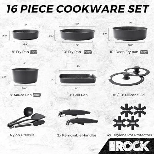 Return Policy Fast Delivery Trusted seller THE ROCK SMART SPACE 16pc Nonstick Pots and Pans Set with ROCK.TEC, Stackable Cookware Set with Detachable Handles, Scratch/Stain/Crack Proof, Induction Ready, Oven & Dishwasher Safe, PFOA-Free, Black Product Description 3x More Durable: The Patented Rock.Tec manufacturing process strengthens the surface of the cookware creating an ultra-hard, rock-like surface. The result is an outstanding release performance, 3x better than the standard non-stick cookware Easy to Store: This non-stick set features a stackable design with detachable handles, saving up to 70% more space for a clutter free kitchen Scratch/Stain/Crack Resistant: Reinforced with a PPG non-stick coating, offering superior durability to keep your cookware looking flawless meal after meal Versatile Detachable Handle: From stovetop to oven to table. The sturdy handles with secure locking system supports up to 30 lbs offering flexibility and convenience Compatible with All Stovetops: Compatible with gas, electric, ceramic and induction stovetops Even Cooking: Extra thick forged aluminum base for optimal heat distribution and superior performance Oven Safe: This cookware is oven safe up to 320°C / 160°F without the handles Shipping Returns Payment Shipping Shipping is FREE to all addresses other than APO/PO boxes in the lower 48 states. All our stock ships from US-based warehouses. Shipped via USPS or UPS (depending on location and package weight) Unless stated otherwise, all orders will ship within 24-72 hours of your payment being processed. Check our feedback to see the great reviews of FAST shipping we offer. Returns Seller does not accept returns Payment We currently accept payment via eBay managed payments only. Once payment is cleared, we will dispatch your shipment within 1-3 business days. Please refer to the "Shipping" tab for more information regarding shipping speed to your destination.