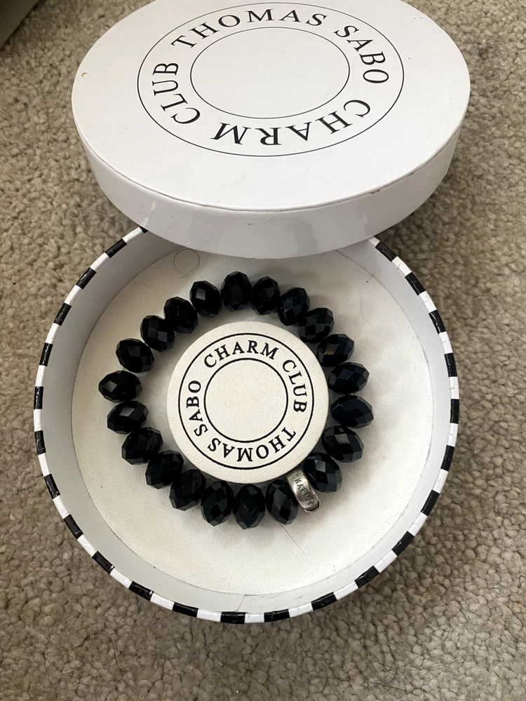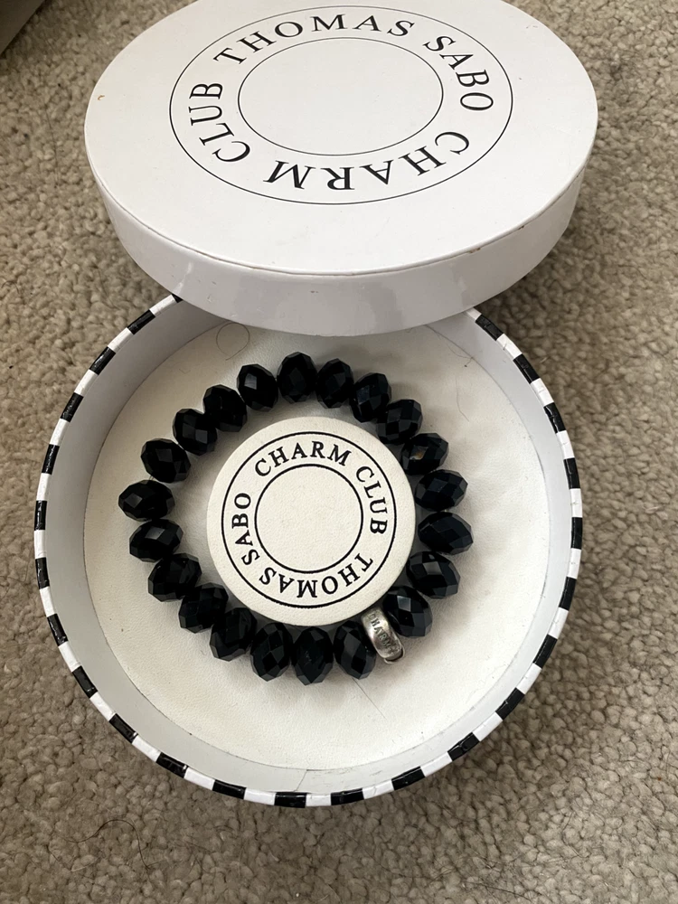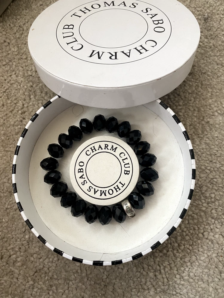 Thomas Sabo Charm Bracelet obsidian The Charm Club bracelet consists of black obsidian Beads. 17.50 cm The 23 beads in total The carrier made of 925 Sterling silver is branded with the THOMAS SABO CHARM CLUB logo. Box not included