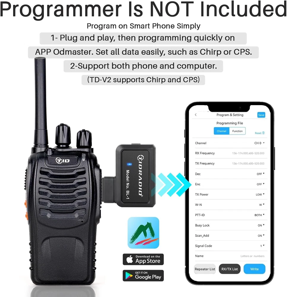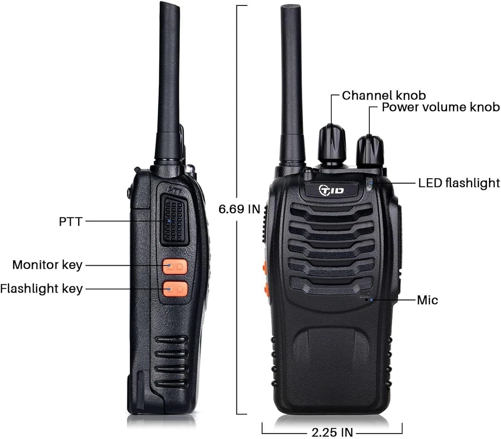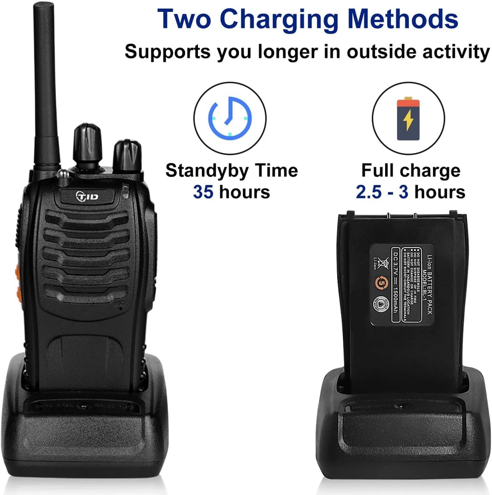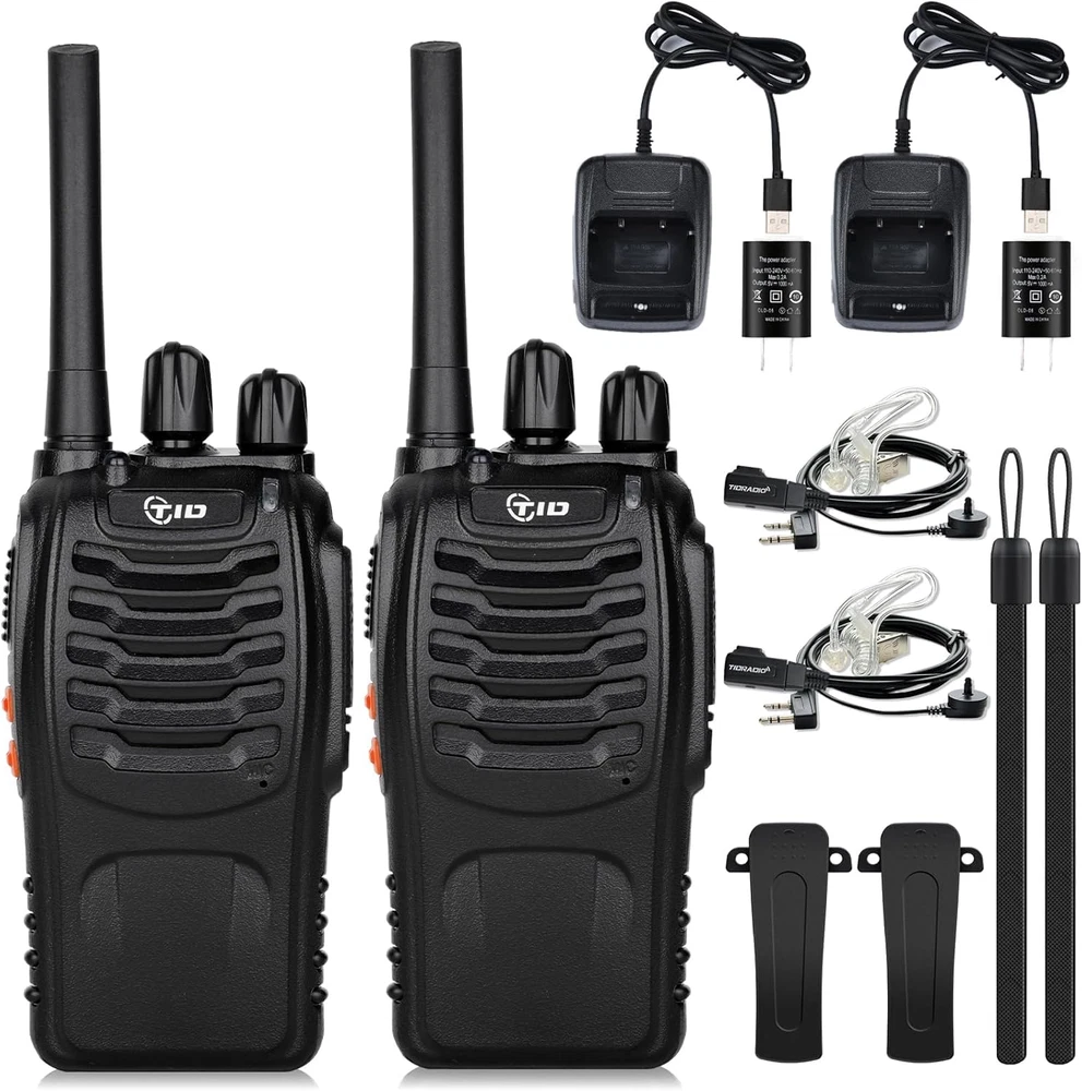 Store New Arrivals Add to Favorite View Feedback Contact TIDRADIO TD-V2 Walkie Talkies for Adults Long Range, Frequency Copy, Rechargeable Two Way Radio Earpiece with MIC,16 Channels Handheld Walkie-Walkie for Kids(2 Pack, Black) Description Item model number TD-V2 Frequency Range 400 - 470 MHz Color Black Brand TID Water Resistance Level Water Resistant Style 2 PACK Package Dimensions 9.29 x 7.01 x 2.48 inches Item Weight 1.43 pounds Tuner Technology UHF Number of Channels 16 Voltage 3.7 Volts Batteries 2 Lithium Polymer batteries required. (included) Number of Batteries 2 Lithium Polymer batteries required. (included) Special Feature Wireless Talking Range Maximum 4 Kilometer Manufacturer TID 💎【Out of the Box】TD-V2 2 way radios are pre-set to the same frequency, making them ideal for both business and family, and easy to use for kids. Just turn into the same channel for seamless communication. FCC ID: 2AWL3-TDV2 💎【Versatile Features】TD-V2 long range Walky Talky is equipped with a built-in LED flashlight, VOX system, and 155 CTCSS&DCS private codes for encrypted communication. Our walkie-talkies also feature scanning capabilities to help you locate conversations in progress. The other models can be compatible with TD-V2 walkie talkies after programming. (Non-default features need to be customised using Odmaster, Chirp or CSP) 💎【Convenient USB Charging】Our radios can be charged quickly and safely using the included USB charging cable and adapter, ensuring that your team is always connected 💎【Long-Lasting Battery Life】With a powerful 1500mAh battery, TD-V2 walkie talkies can keep you connected for up to 35 hours of continuous use. The durable battery ensure uninterrupted contact for camping, fishing, hiking or some business such as cruise ships, hotels, restaurants, supermarkets and train stations etc 💎【Upgraded Headset】We've included upgraded Air Acoustic Tube headsets to ensure that your calls are crystal clear in noisy environments. The acoustic tube earpiece are more comfortable to wear and deliver clearer sound quality, while protecting your privacy 💎【No Risk Purchase and Quality Guarantee】We stand behind our products and offer a 90-day quality guarantee. Click the yellow Add to Cart button with confidence. If you are not satisfied, we offer a replacement Product Description Integrated Multifunctionality VOX(hands free) 0-5 level of VOX sensitivity Hands-free convenient and efficient Transmission activated by speaking On the CH5, press and hold the PTT+SK1 to set the VOX Safe call 50 CTCSS and 105 CDC Ensure a secure call and minimize unnecessary messaging. Alarm function Sound the alarm and alert your partner. Ask for help quickly and prioritize your safety. Long range The upgraded antenna ensure stable long-range transmission. Complex space: 0.7-1 mile Open spaces: up to 5.5 miles (According to customer tests) Rugged enclosure& High-quality speaker Rugged shell: Anti-fall and anti-vibration PC+ABS durable material; Rugged enclosure; Wear resistance; Longer service life High-quality speakers: Superior audio quality These TD-V2 two way radios with a superior audio quality; which stand up to harsh job-site conditions common at manufacturing floor and retail warehouse Programmer Not Included 1 USB Charging Base 2 Security Earpiece & Mic 3 Support Phone Programming The outstanding performance of TD-V2 The video showcases the product in use. The video guides you through product setup. The video compares multiple products. The video shows the product being unpacked. Long Range Test Open spaces: up to 5.5 miles The upgraded antenna ensure stable long-range transmission. Complex space: 0.7-1 mile Open spaces: up to 5.5 miles (According to customer tests) Durability Test of TD-V2 Durable, drop resistant and long life The TD-V2's external materials have undergone continuous improvement and the design is optimized to withstand high intensity use without damage. This makes them more suitable for being used in harsh environments such as building sites. The design is small and compact. It is equally at home in warehouses, restaurants, camping and homes. The video showcases the product in use. The video guides you through product setup. The video compares multiple products. The video shows the product being unpacked. The video showcases the product in use. The video guides you through product setup. The video compares multiple products. The video shows the product being unpacked. Product Presentation Integrated Multifunctionality More functions: CTCSS/CDC, Scanning, VOX, Flashlight, Alarm, Monitor and so on. 1500mAh powerful battery: Keeps you connected for up to 36 hours of continuous use. And it only takes 3-4 hours to fully charge. Privacy headset: Make your business more secure and efficient. The TD-V2 supports programming by phone using the TIDRADIO Bluetooth Programmer. It can program quickly and improve work efficiency. Side buttons can be customized. Unboxing video of TD-V2 Walkie Talkies Your best business partner. The video showcases the product in use. The video guides you through product setup. The video compares multiple products. The video shows the product being unpacked. TID TD-V2 Two Way Radio 2-Pack 2 X TD-V2 2 way radios 2 X Acoustic Tube Headset 2 X 1500mAh Li-ion batteries,2 X USB Charger with cable 2 X Durable Belt clip, 2 X Lanyard, 1 X User manual Same High Quality - TIDRADIO TD-V2 & BaoFeng BF-88A Add to Cart Add to Cart Add to Cart Add to Cart Add to Cart Customer Reviews 4.5 out of 5 stars 603 4.4 out of 5 stars 750 4.6 out of 5 stars 265 4.5 out of 5 stars 219 4.7 out of 5 stars 35 Price $119.98 $ 119 . 98 $62.29 $ 62 . 29 $69.99 $ 69 . 99 $69.99 $ 69 . 99 $69.99 $ 69 . 99 License License Free License Free GMRS License Ham License License Free Support TIDRADIO BT Programmer Yes Yes Built-in Bluetooth Built-in Bluetooth Yes Quantity of Battery 10PCS 12PCS 2 2 4PCS Capacity of Battery 1500mAh 1500mAh 2500 2500 1000mAh Duration 35h