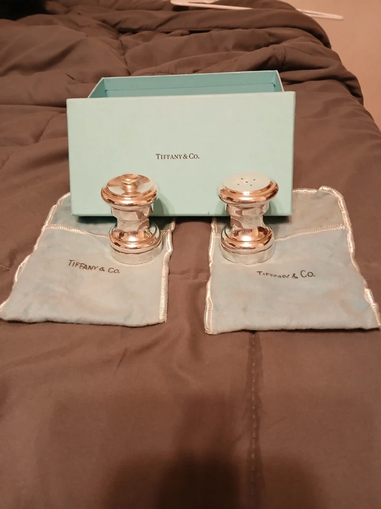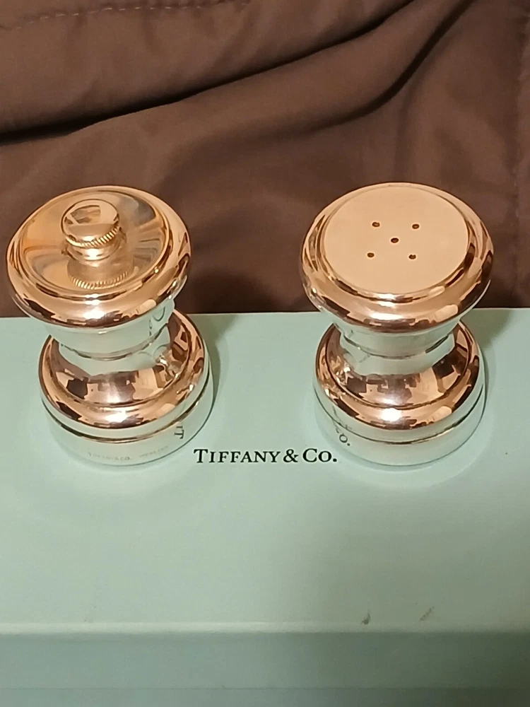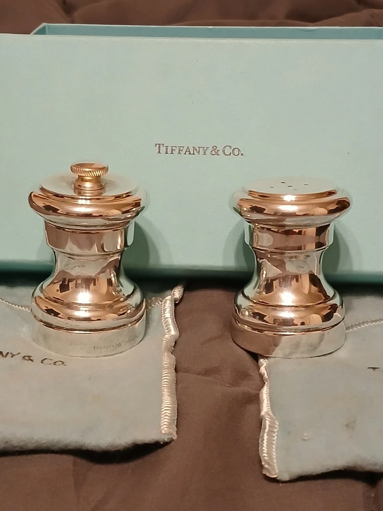 UNDER A $190 STARTING BID!! ONLY A $189 STARTING BID ๐คฏ๐ AUTHENTIC TIFFANY AND COMPANY .925 STERLING SILVER SALT AND PEPPER SHAKER, THE SET WEIGHS 128.39 GRAMS AND COMES WITH THE ORIGINAL BOX AND CLOTH BAGS. THE INSIDE OF THEM HAS SOME RUSTING WHICH IS MAINLY FROM AGING. THEY CAN BE CLEANED OUT PROFESSIONALLY OR BY DOING IT YOURSELF. I BELIEVE THE PEPPER GRINDER HAS WOOD AT THE BOTTOM TOO, THEY ARE VINTAGE, FROM THE 1970'S TO 1980'S. THEY ARE IN GREAT/EXCELLENT CONDITION FOR BEING 45-50 YEARS OLD, MADE IN ITALY ๐ฎ๐น๐ฏ๐ THERE ARE A FEW LITTLE SCRATCHES, PLEASE SEE PICTURES 19-21, I HAVE THEM CIRCLED. PEPPER SHAKER IS A PEPPER GRINDER AND IT COMES APART BY UNSCREWING THE SCREW AT THE TOP AND TWISTING THE LID OFF. IT IS EASY TO ASSEMBLE, THE SALT SHAKER LID JUST TWISTS ON AND OFF. BUY THE SET FOR A GIFT OR TO PUT AWAY FOR YOURSELF ๐๐ฃ FAST SHIPPING ON ALL MY ITEMS, INCLUDES FREE SHIPPING!! ๐ฏ THE WINNER OF THIS AUCTION WILL ALSO RECEIVE FREE ITEMS!! I WANT TO THANK YOU FOR LOOKING AND PLEASE DON'T FORGET TO SAVE ME AS A SELLER FOR MY FUTURE LISTINGS ๐ฃ๐ฏ GOLD, SILVER, COINS, JEWELRY, PANDORA, AND MANY MORE ANTIQUITIES TO COME ๐ฏ
