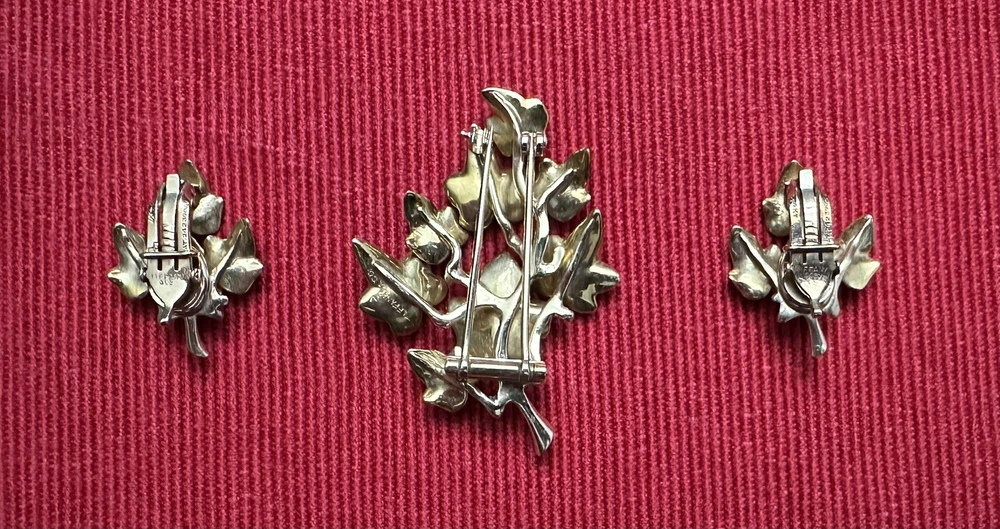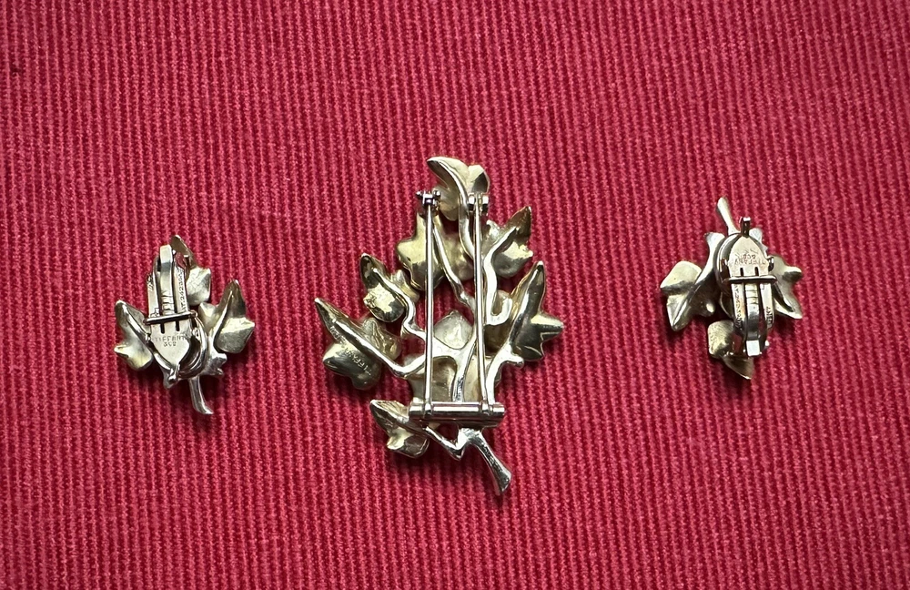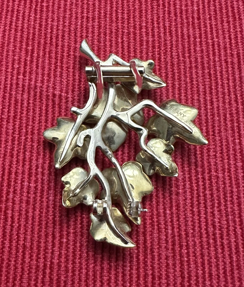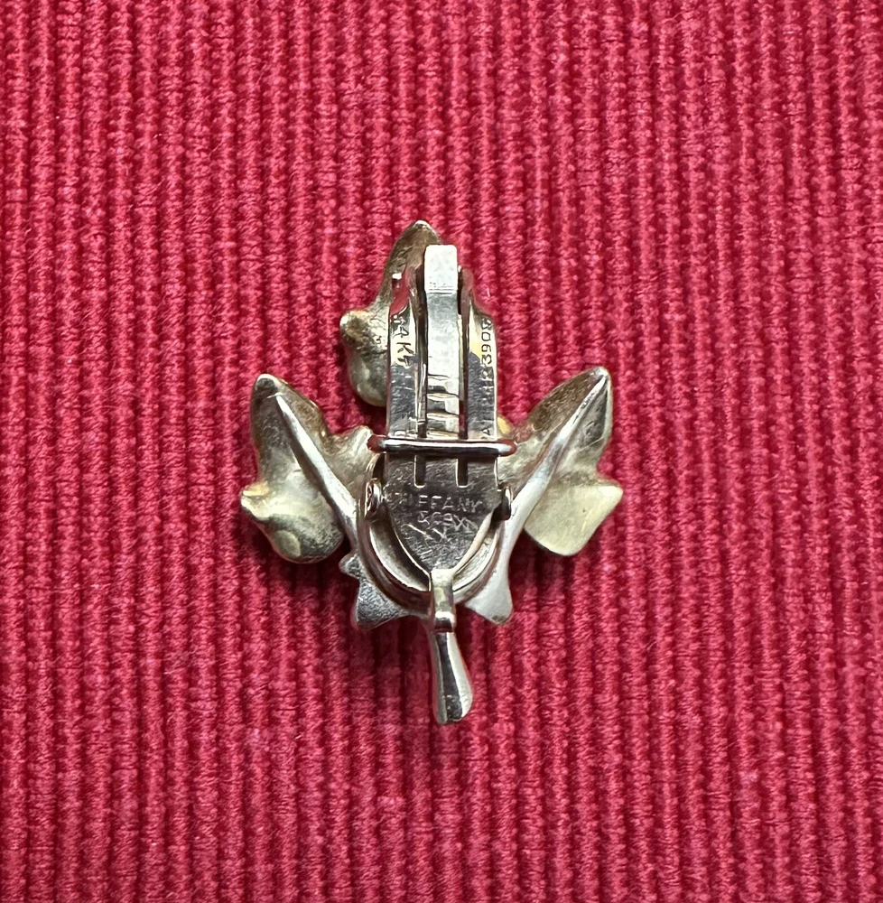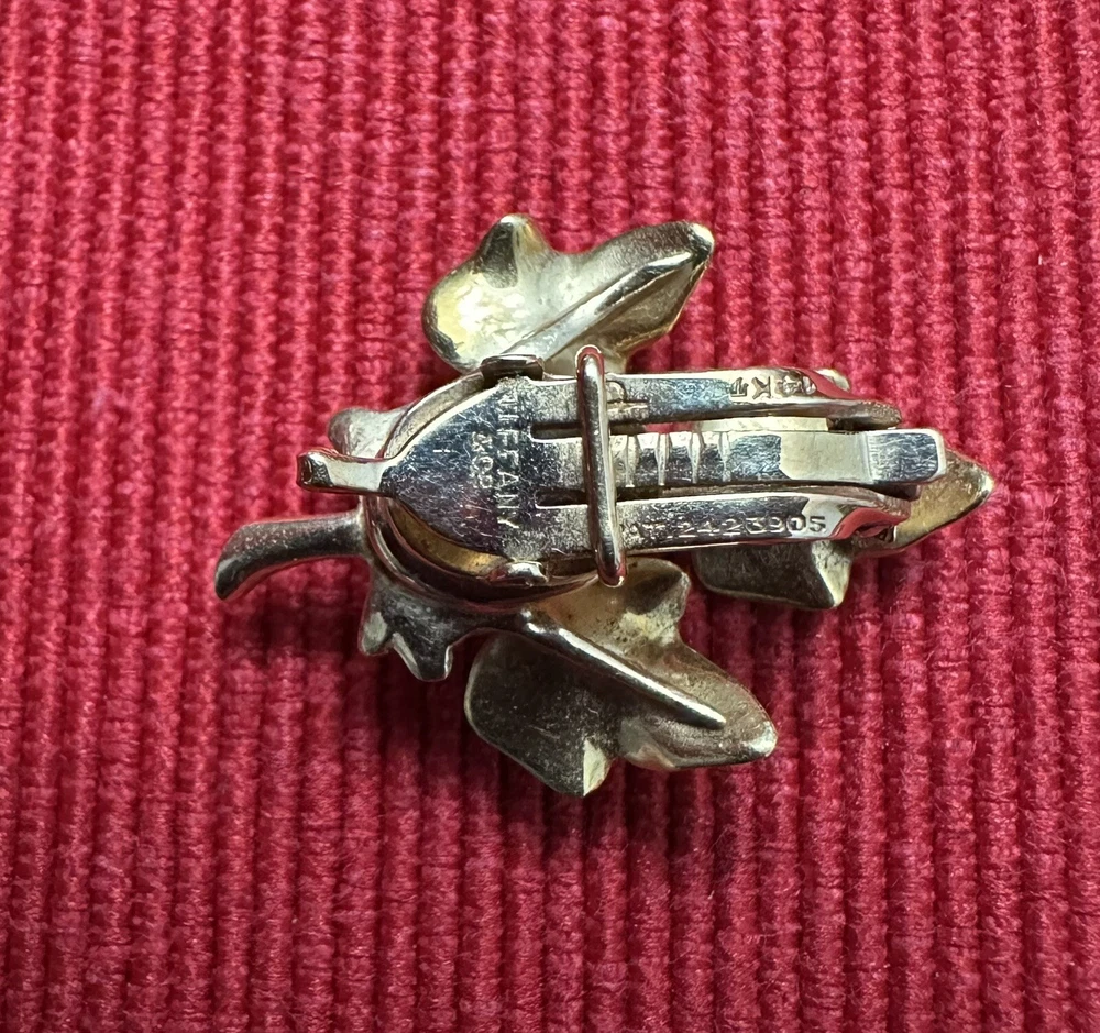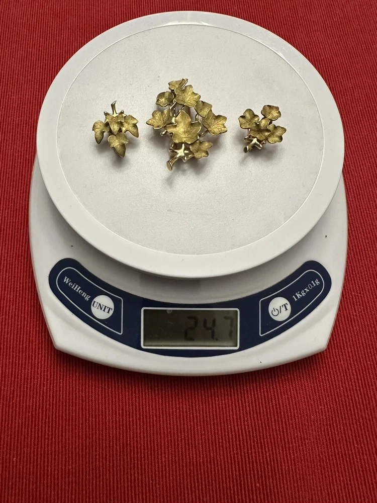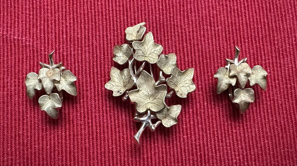 Tiffany & Co. 14k yellow gold beautiful vintage ivy cluster motif brooch and earrings set, with box. This gorgeous set contains a graceful grouping of brushed ivy leaves, with high polished stems and branches. The brooch is finished with a fur clip double prong, the earrings finished with clip on style backs. Marks: Tiffany & Co., 14KT/ PAT.2423905 Weight : 24.7 Gram Condition: Good overall estate condition, prong on fur clip slightly bent. Please enlarge all pictures for more details. If you have any questions, please do not hesitate to contact the seller.