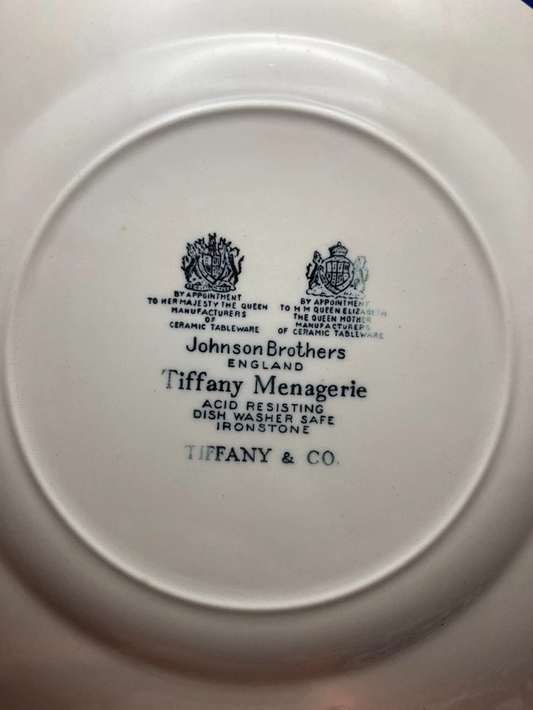 TIFFANY MENAGERIE BY JOHNSON BROTHERS, SET 3 SALAD PLATES TIFFANY & CO, ENGLAND Set of 3 salad plates in the design TIFFANY MENAGERIE by JOHNSON BROTHERS and TIFFANY & CO. Blue and white deer design. Plates have a diameter of 7 7/8''. In excellent condition with no chips, cracks, flakes, or other defects. Dishwasher safe. Made in England. Please ask questions before bidding or purchasing. Please be sure to visit my Ebay store for more fine china by some of the world's best makers! I also have fine crystal, sterling silver, silver plate and antique books. _gsrx_vers_1677 (GS 9.8.1 (1677))